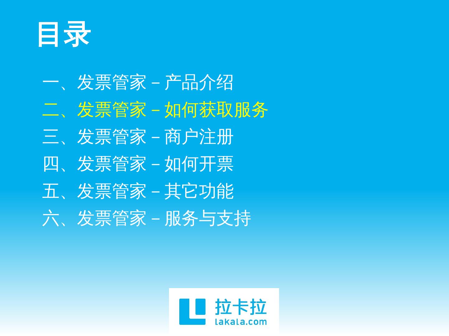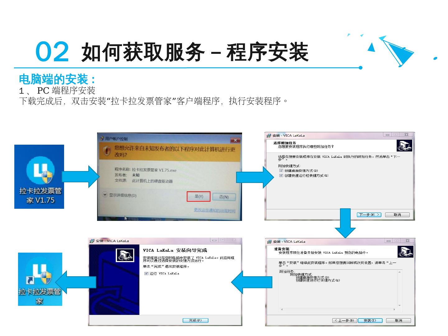 如何获取服务-程序安装 ... 下载完成后,双击安装“拉卡拉发票管家”客户端程序,执行安装程序。 ... 支付宝发票二维码展示方式,先打开支付宝,按如下图流程操作:.