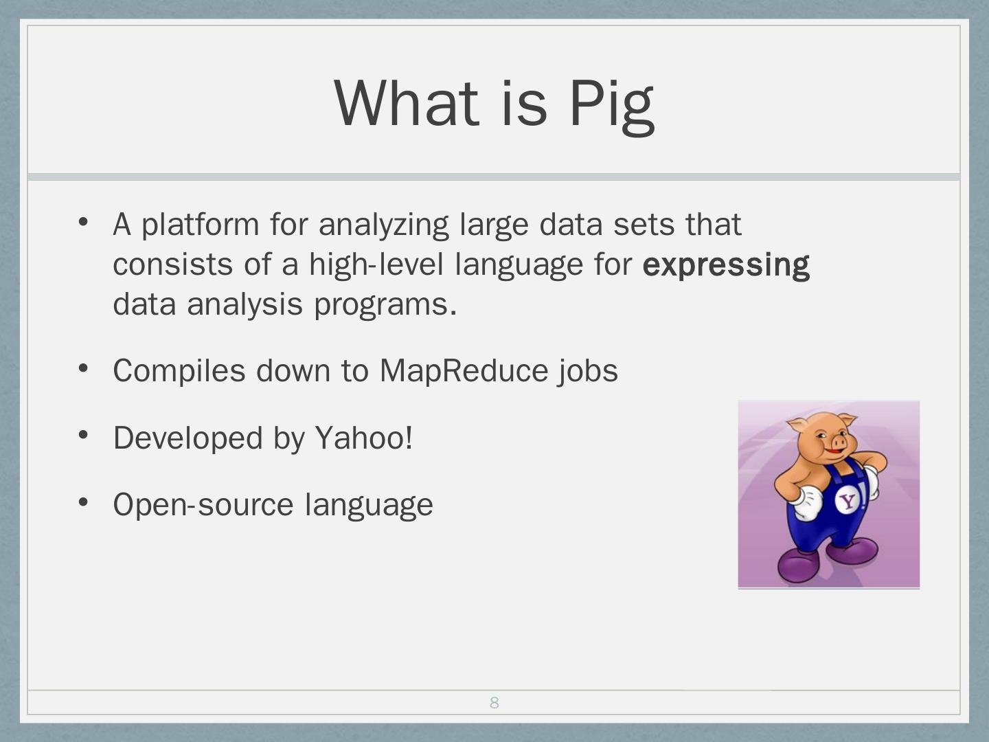 Apache Pig. 7. What is Pig. A platform for analyzing large data sets that consists of a high-level language for expressing data analysis programs. Compiles down ...