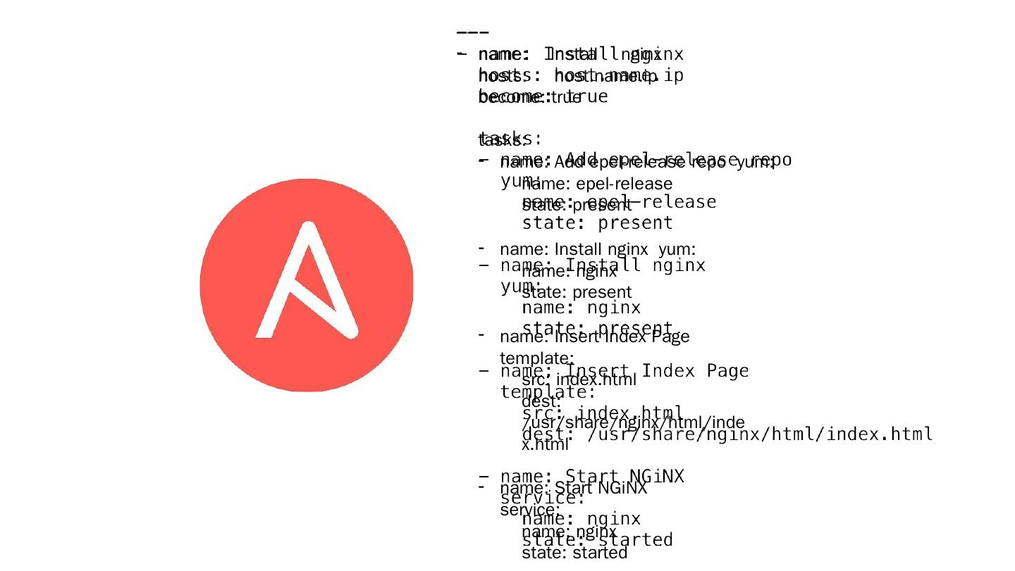 name: Install nginx hosts: host.name.ip become: true. tasks: name: Add epel-release repo yum: name: epel-release. state: present. name: Install nginx yum:.