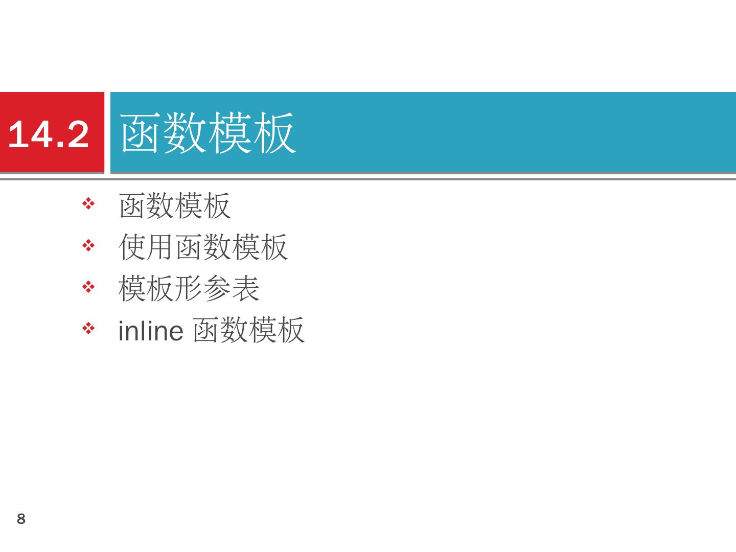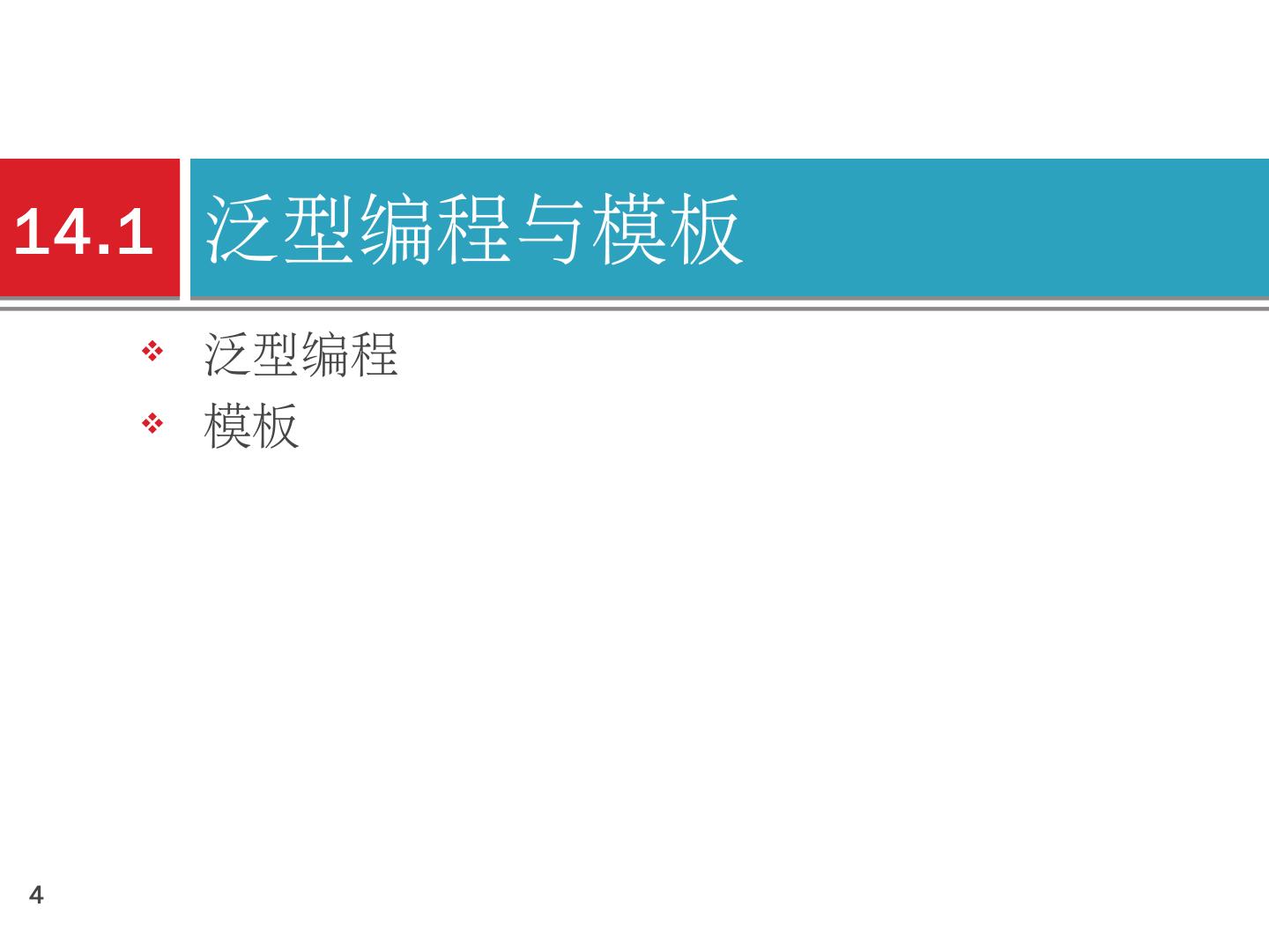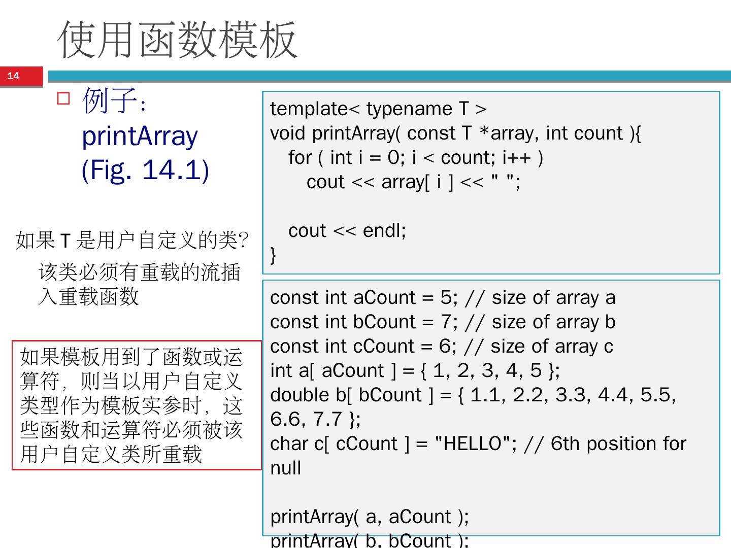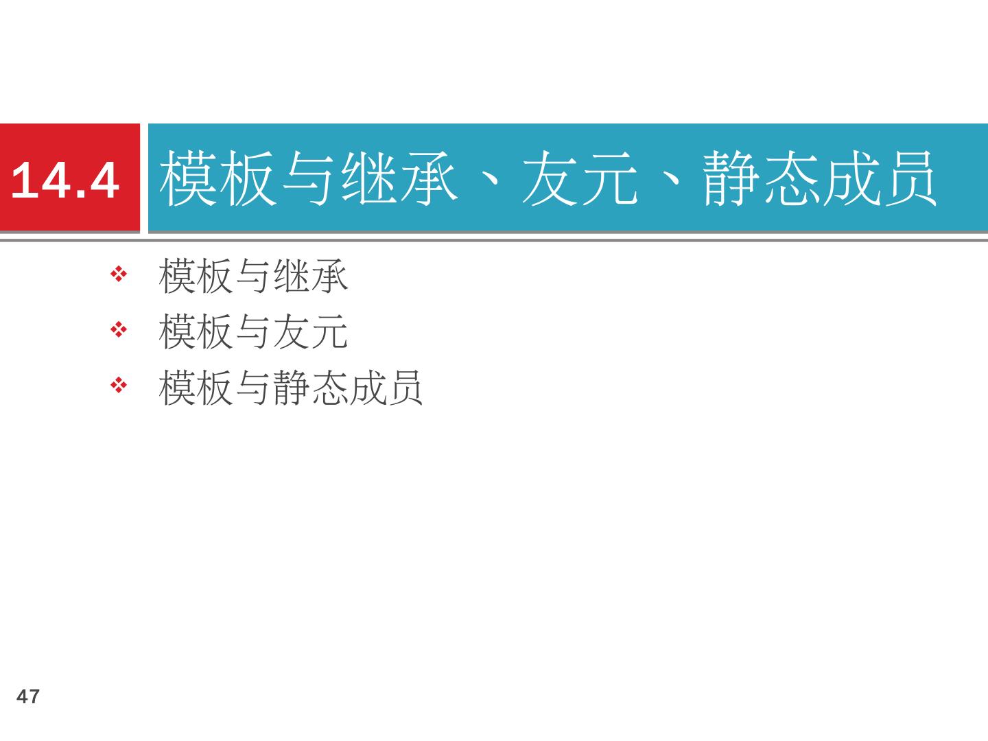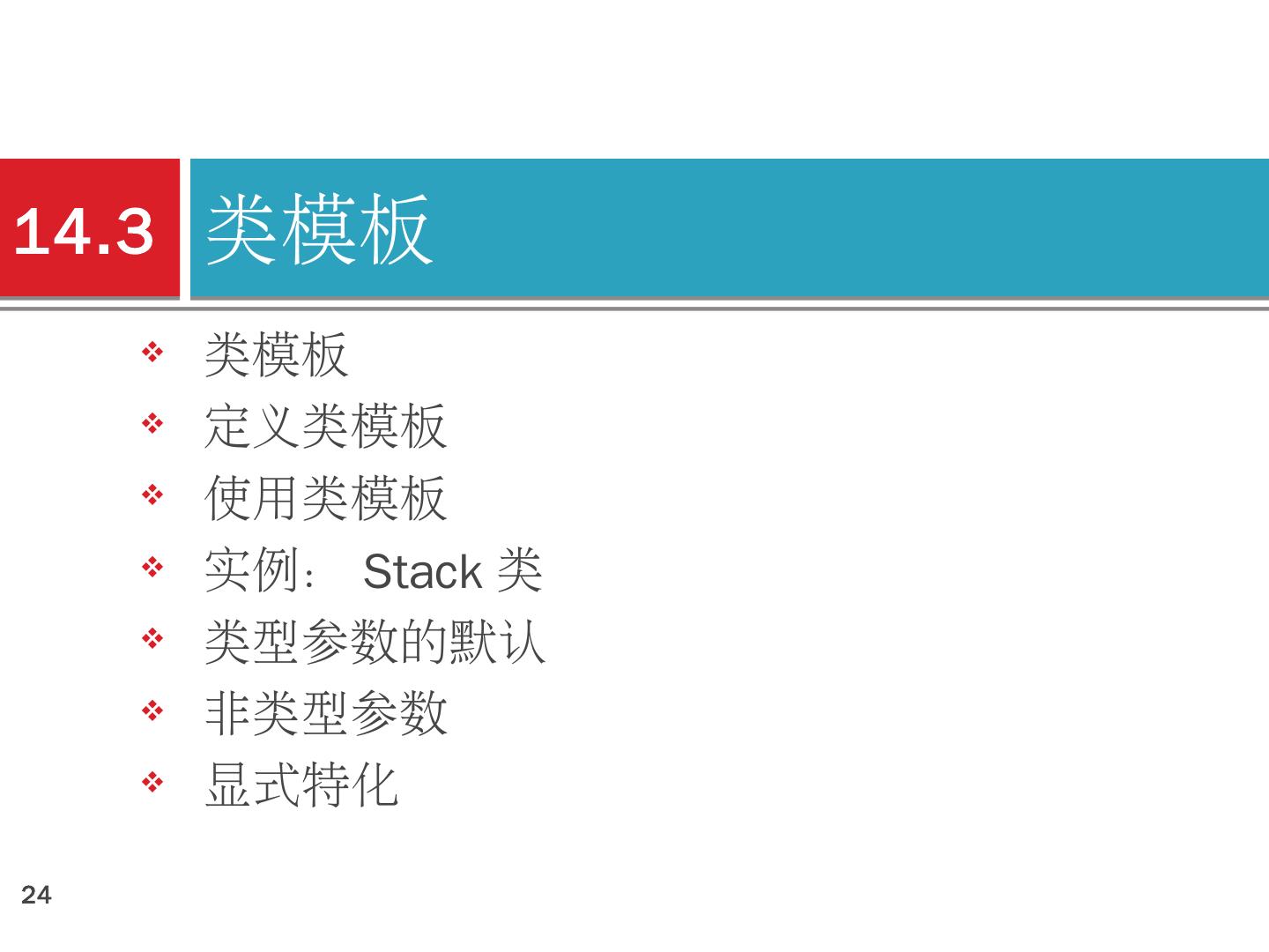 14.1 泛型编程与模板; 14.2 函数模板; 14.3 类模板; 14.4 模板与继承、友元和静态成员. Templates. 14. (chap14.1). (chap14.2, 14.3). (chap14.4, 14.5). (chap14.6 ...