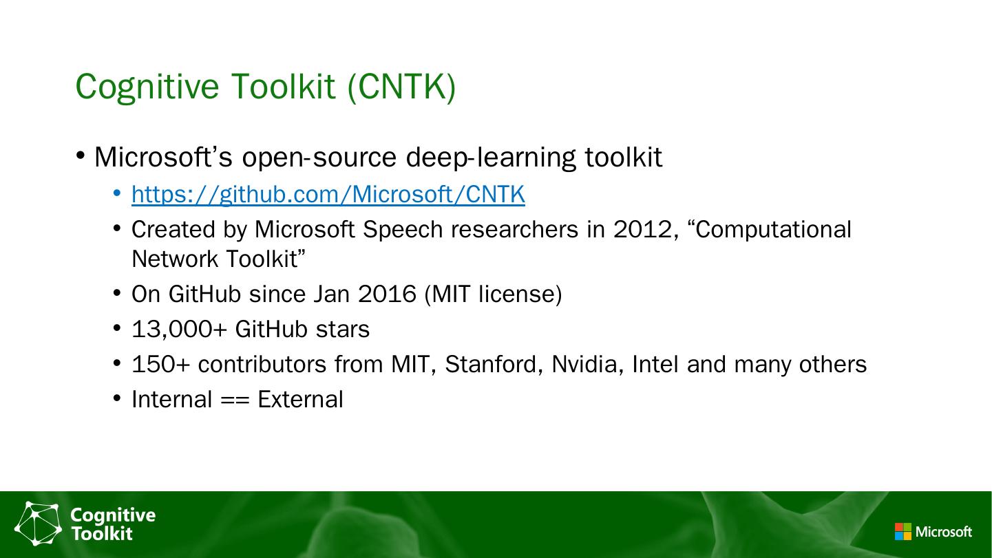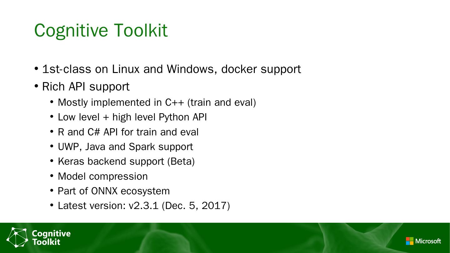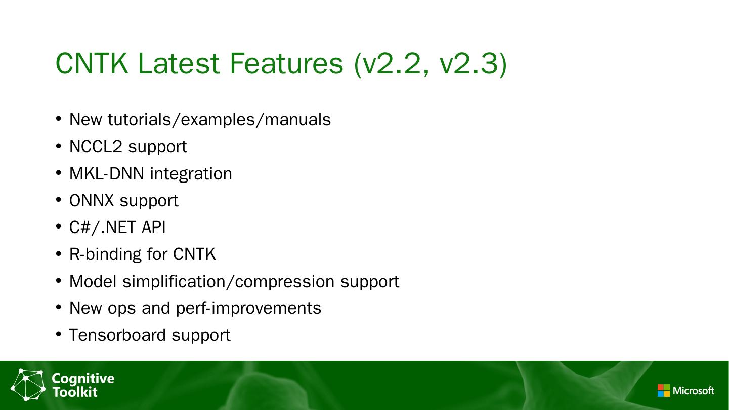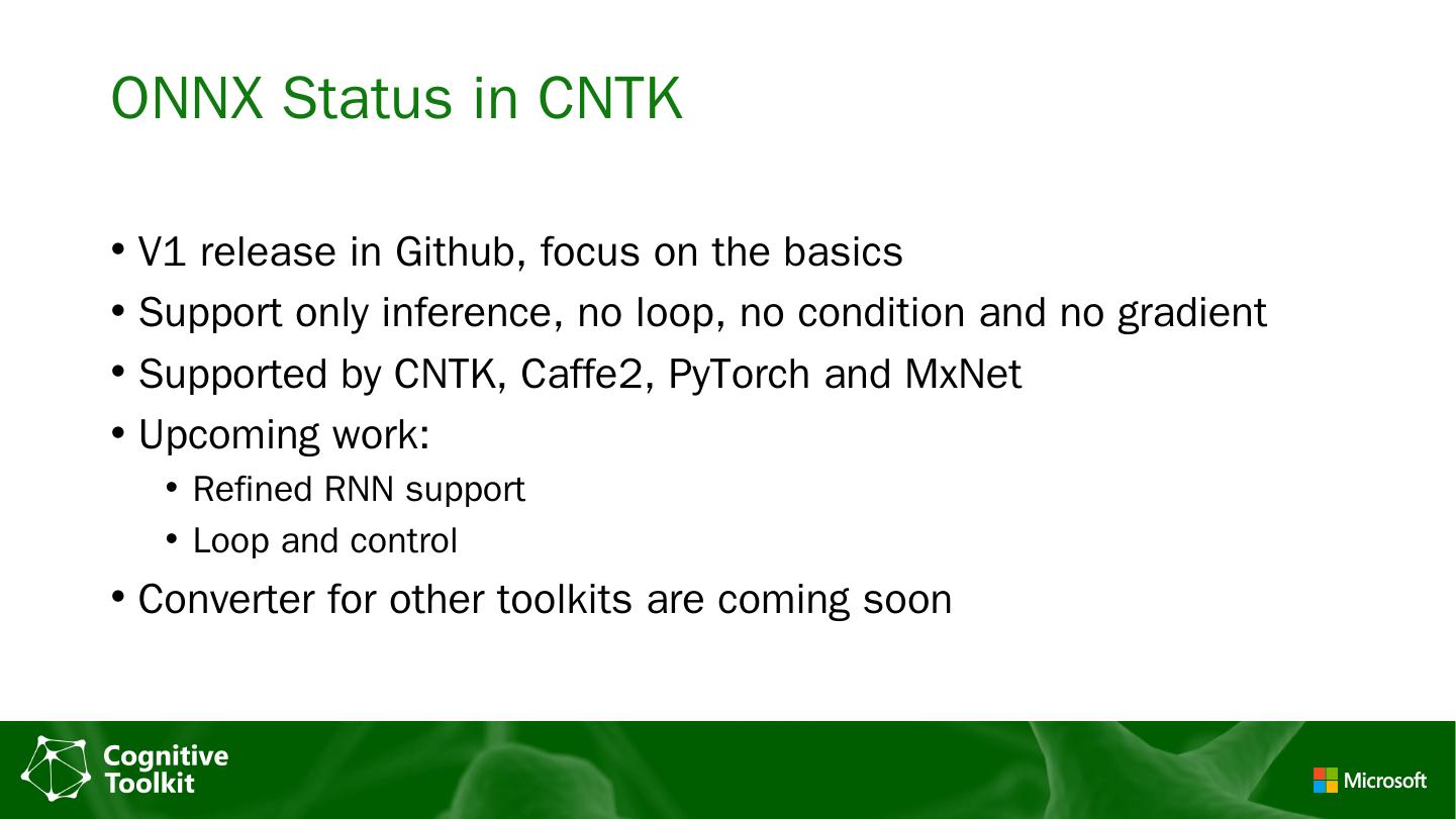 CNTK Latest Features (v2.2, v2.3). ONNX is an open format to represent deep learning models; Supported by: CNTK; PyTorch; Caffe 2; MxNet.