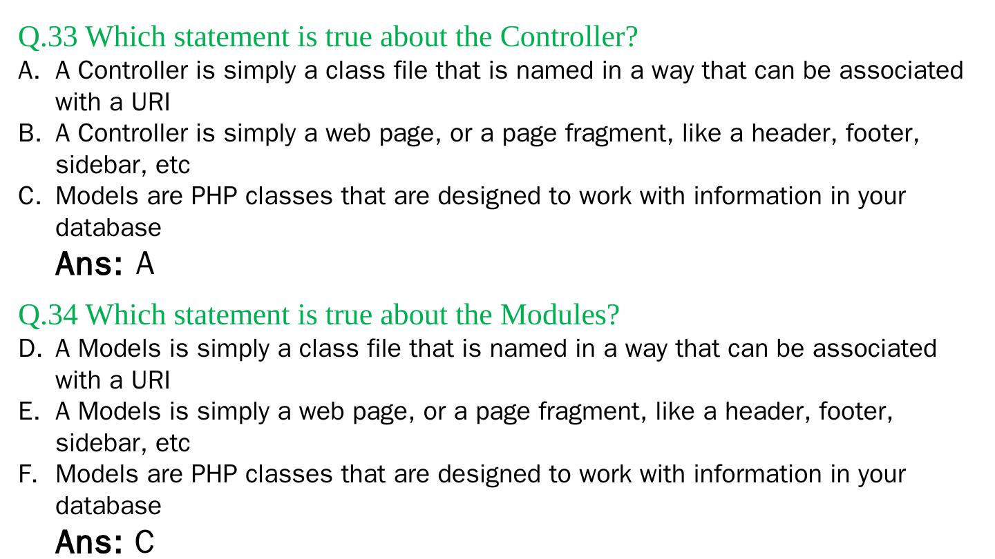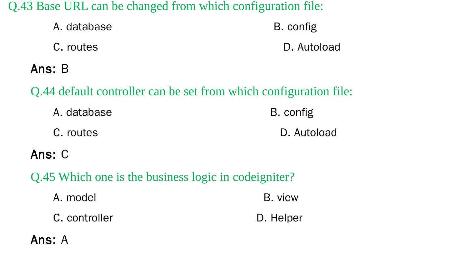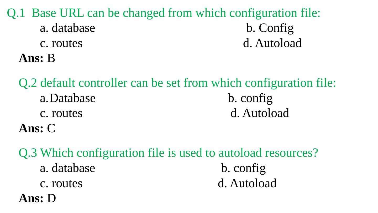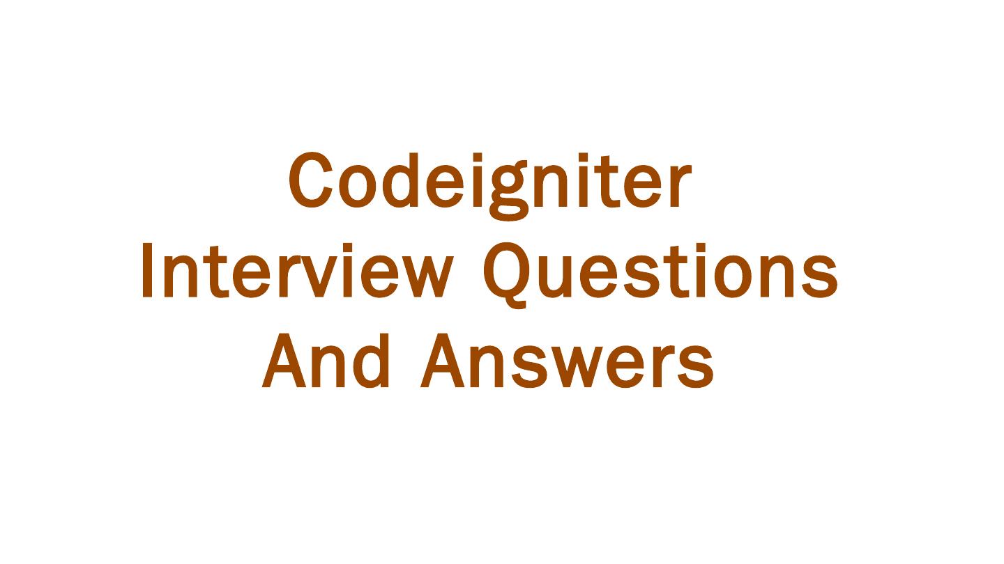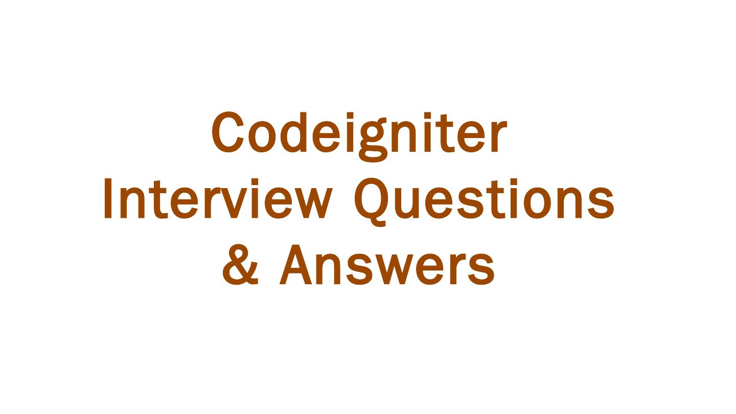 Codeigniter. Interview Questions. & Answers. Objective type. Questions Answers. Q.1 Base URL can be changed from which configuration file: a. database b.