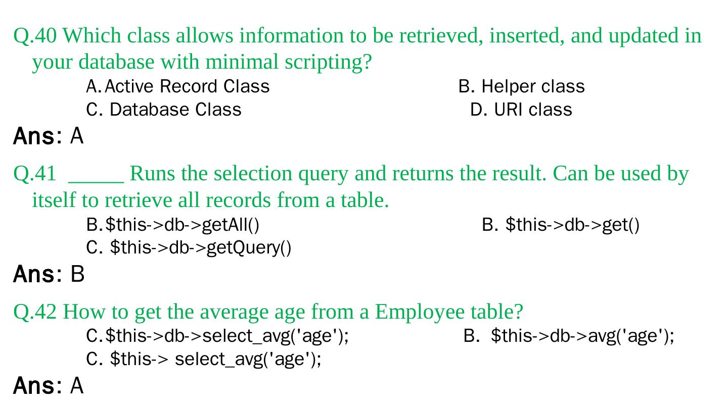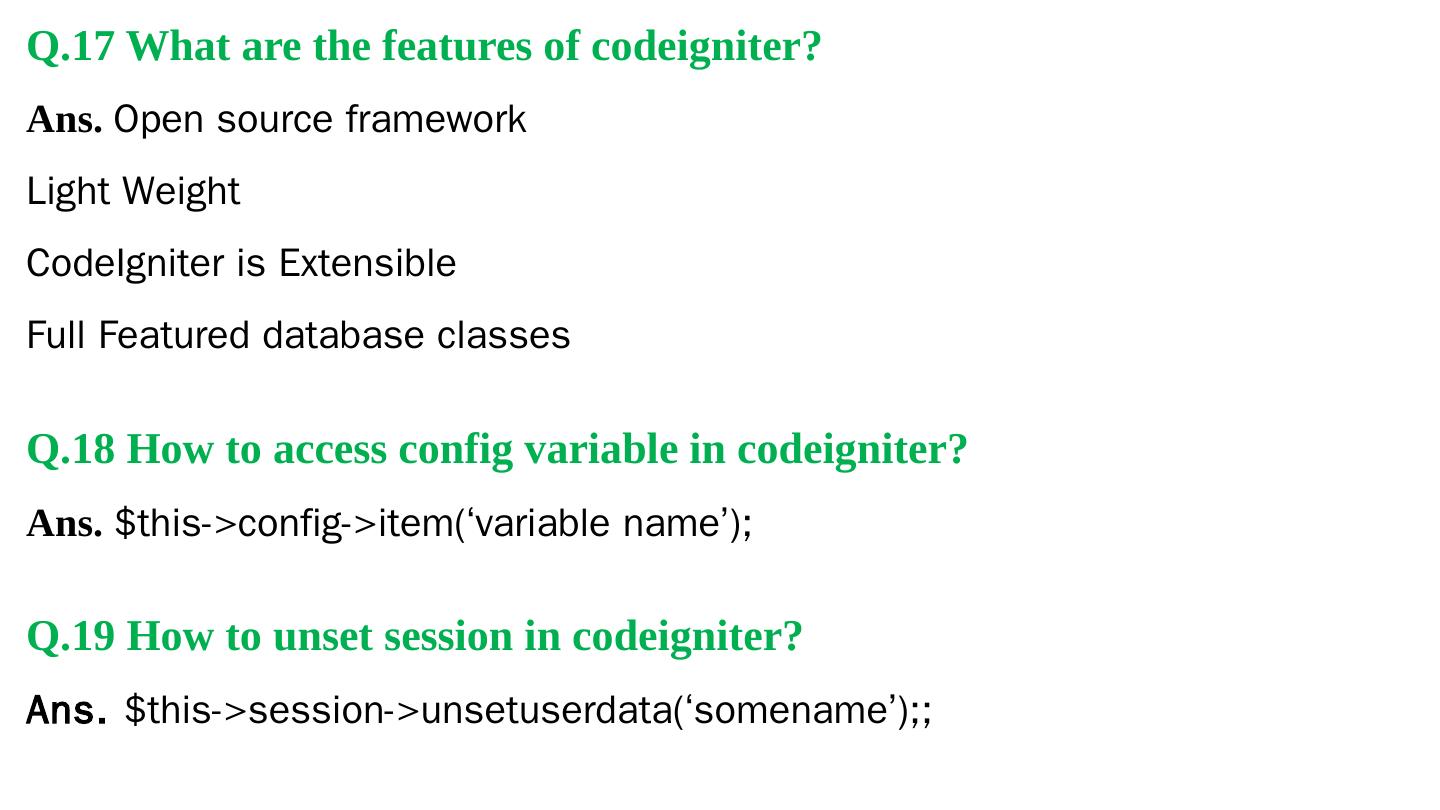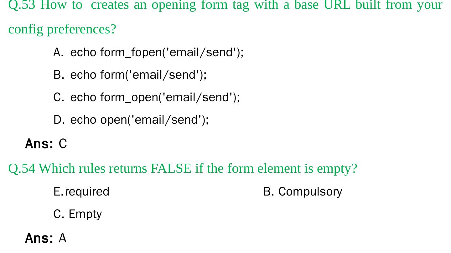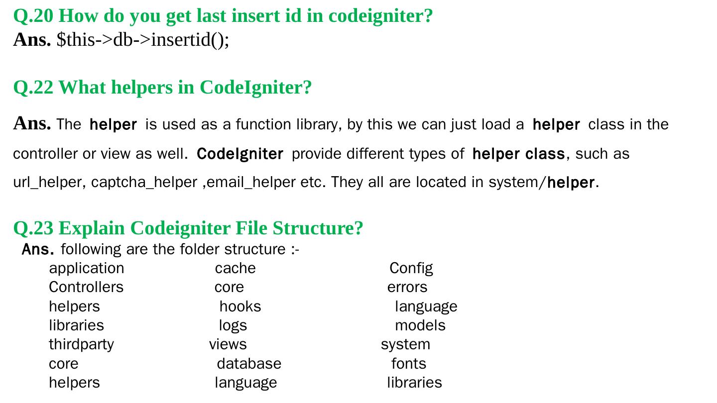 Codeigniter. Interview Questions. & Answers. Objective type. Questions Answers. Q.1 Base URL can be changed from which configuration file: a. database b.