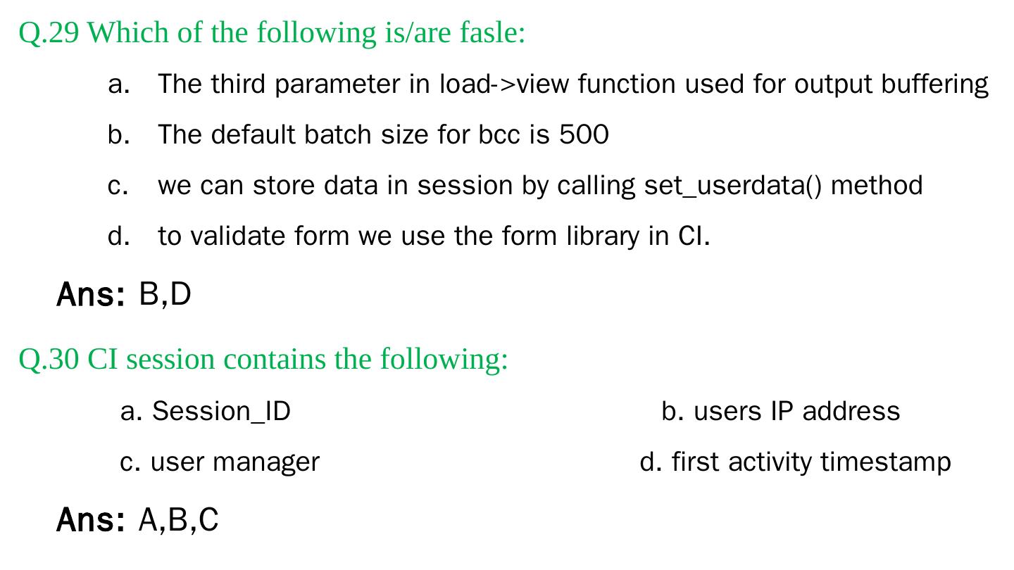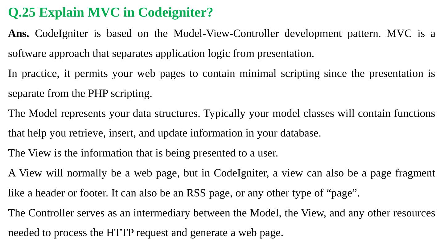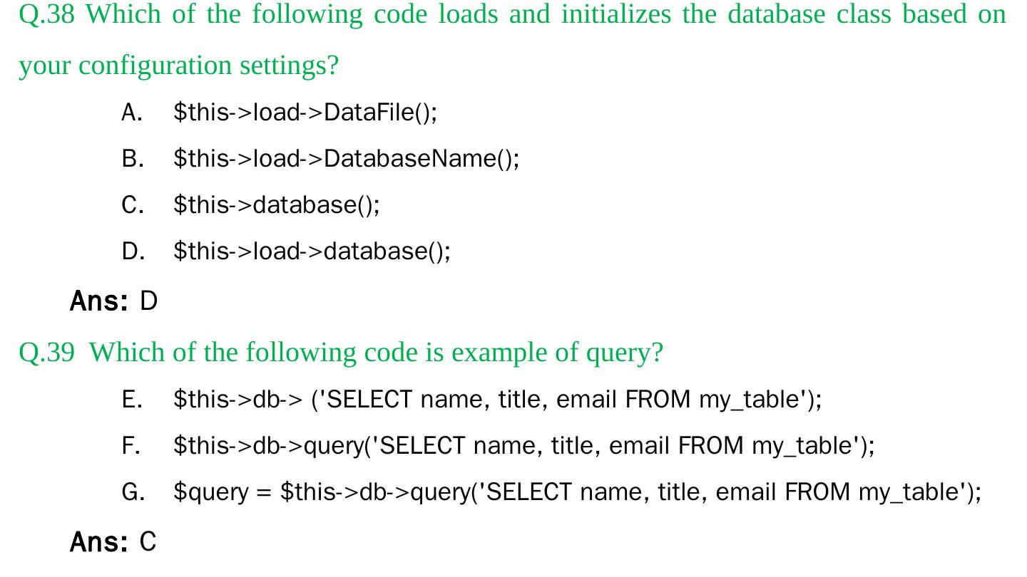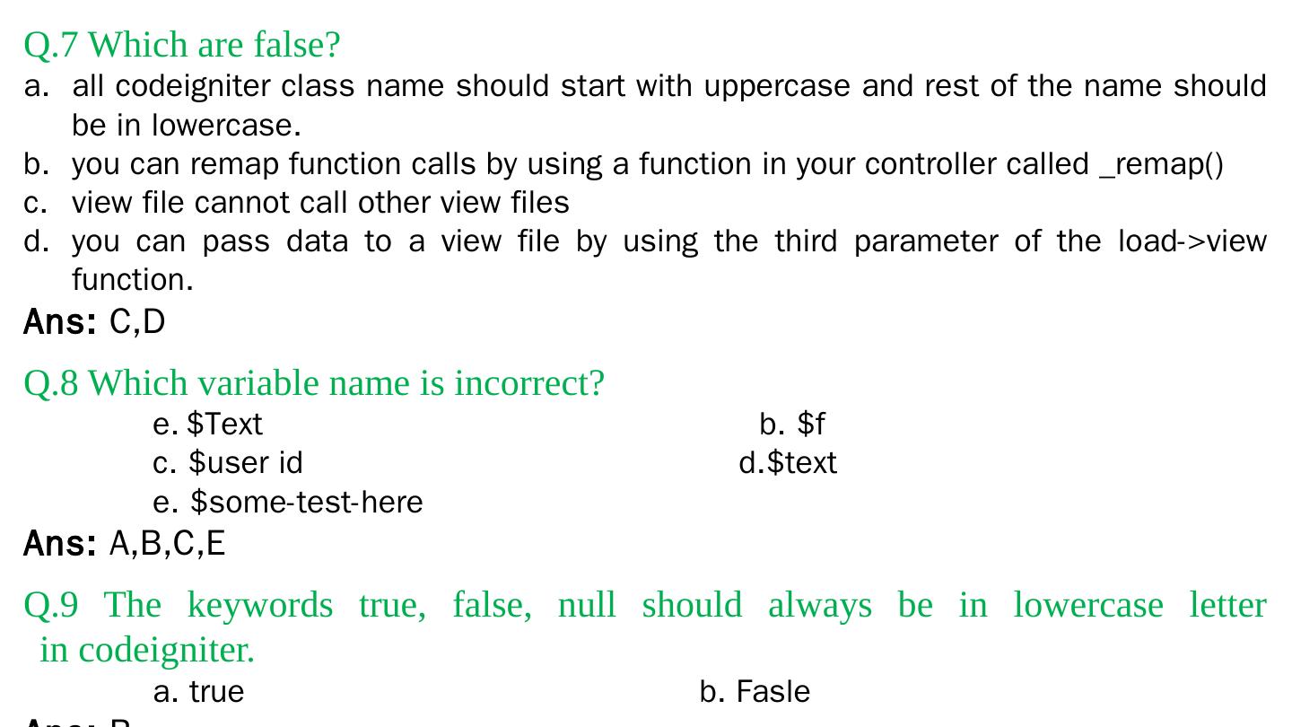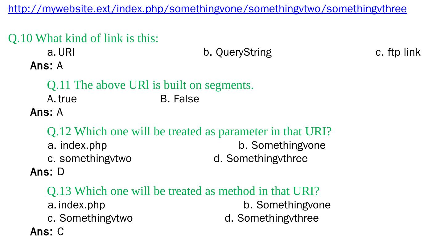 Codeigniter. Interview Questions. & Answers. Objective type. Questions Answers. Q.1 Base URL can be changed from which configuration file: a. database b.