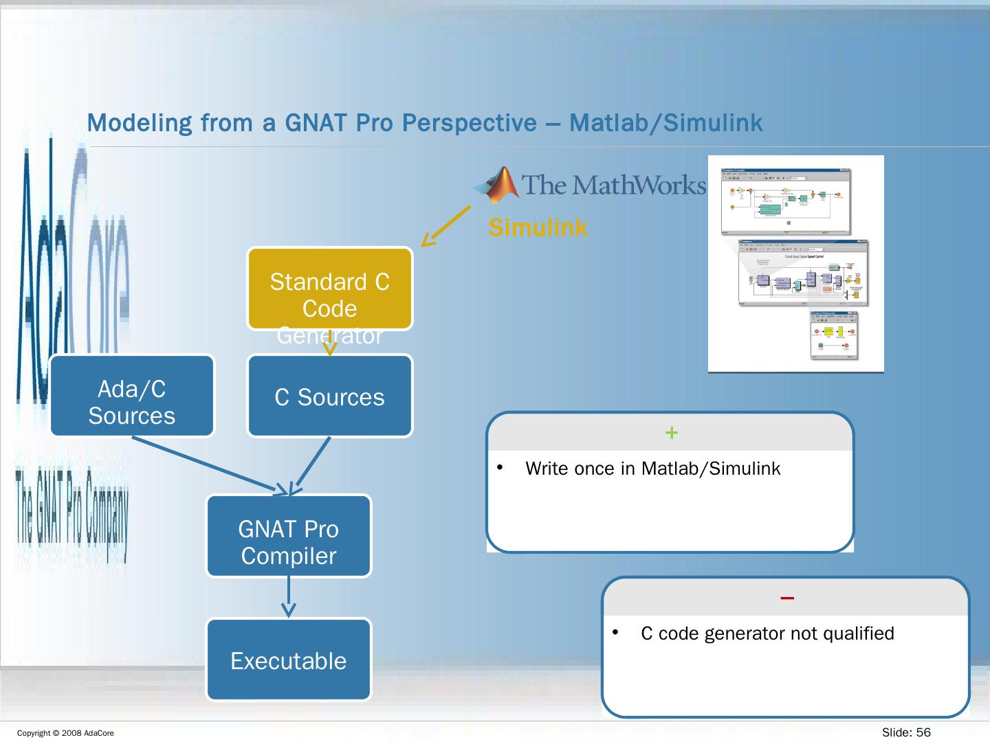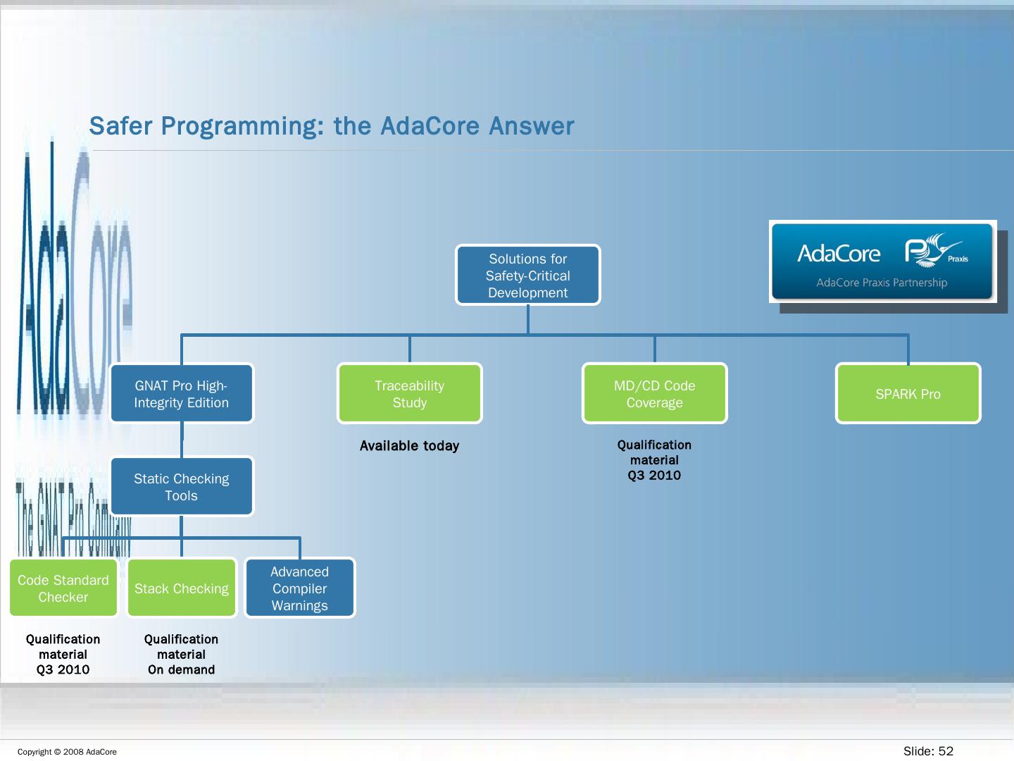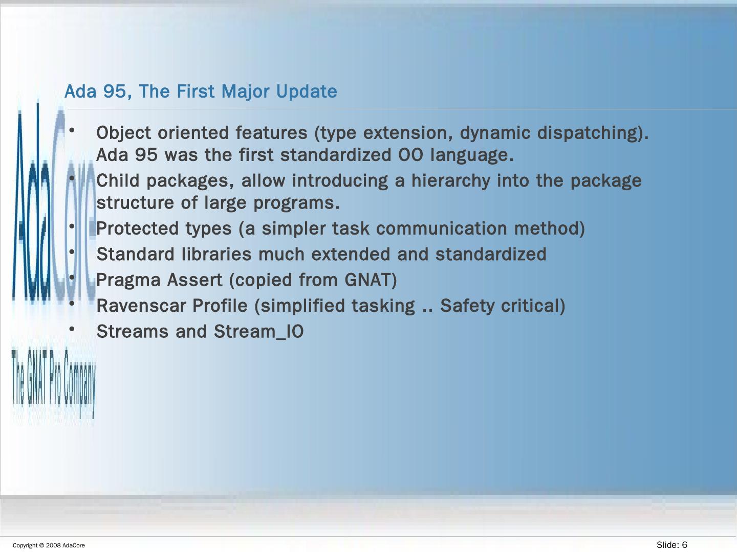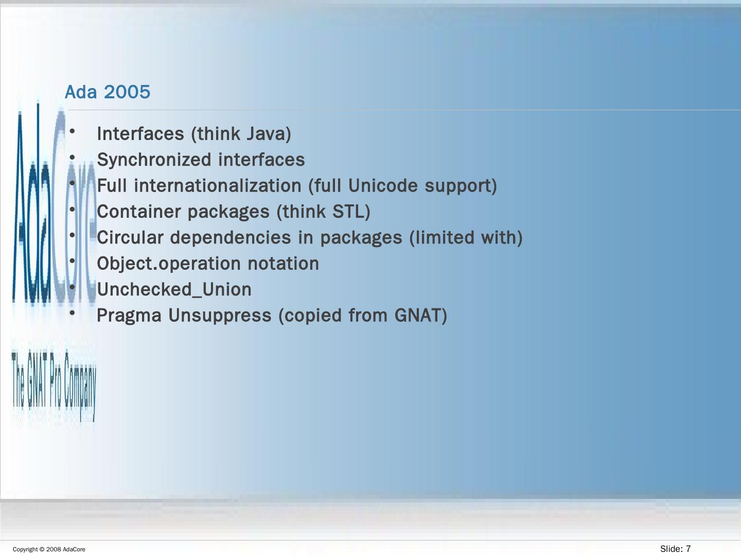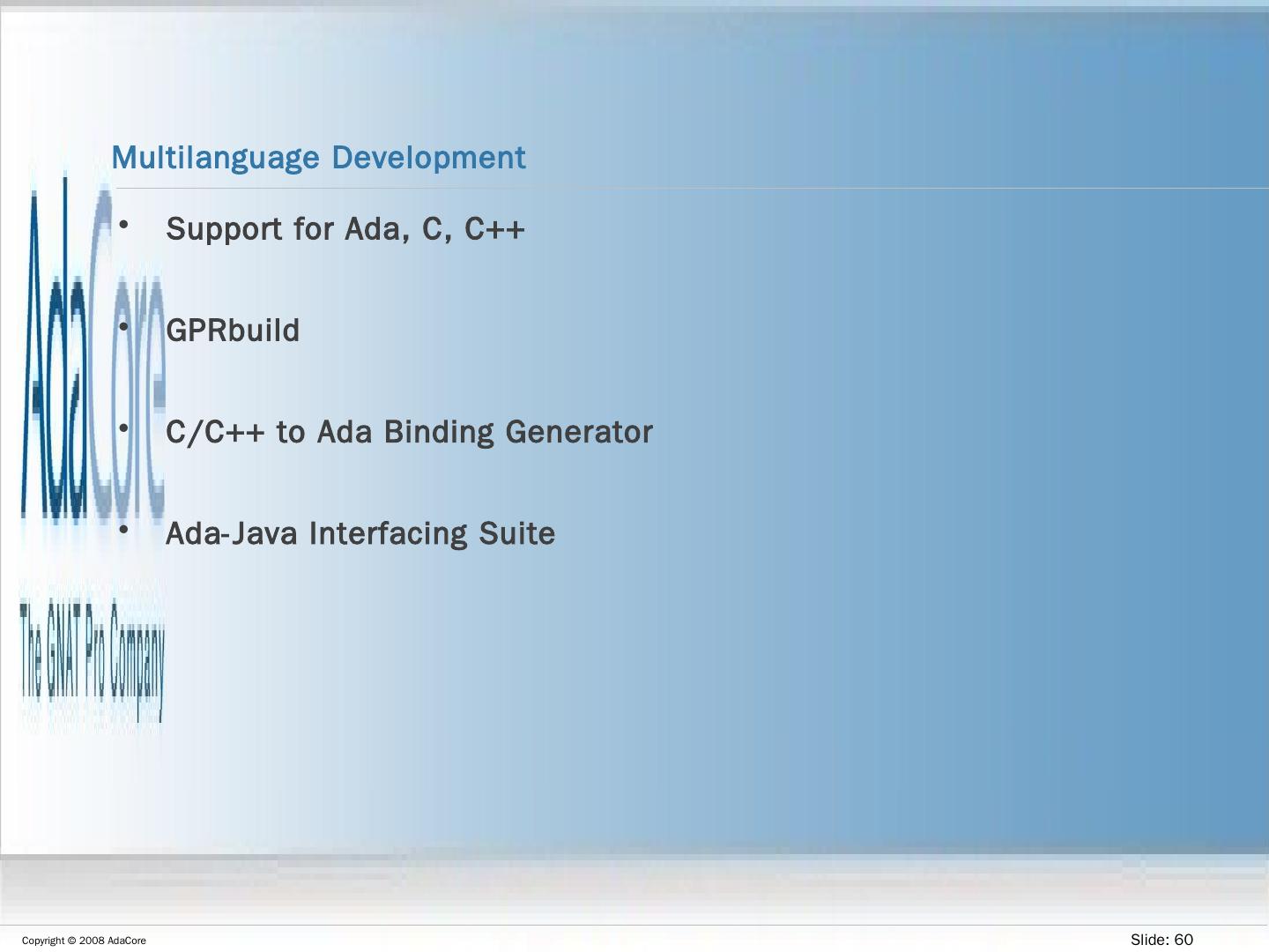 Vista has about 50 million lines of C; Microsoft is busy adding static assertions to this ..... Support for Ada, C, C++; GPRbuild; C/C++ to Ada Binding Generator ...