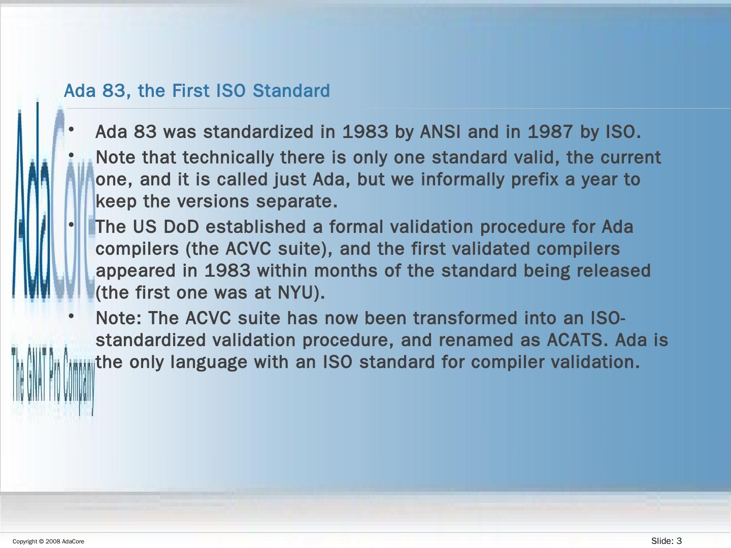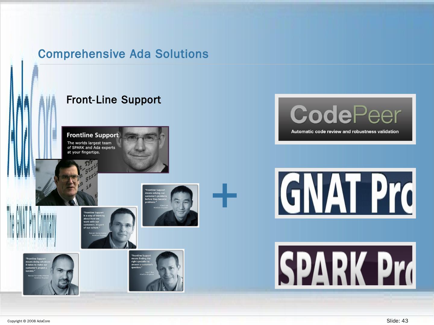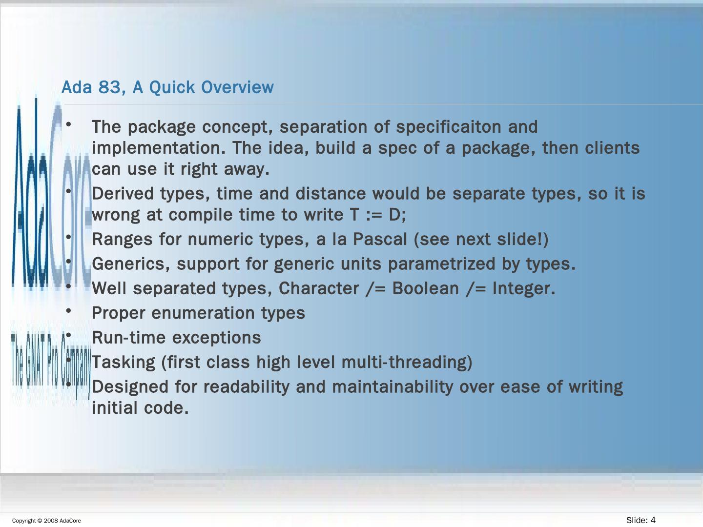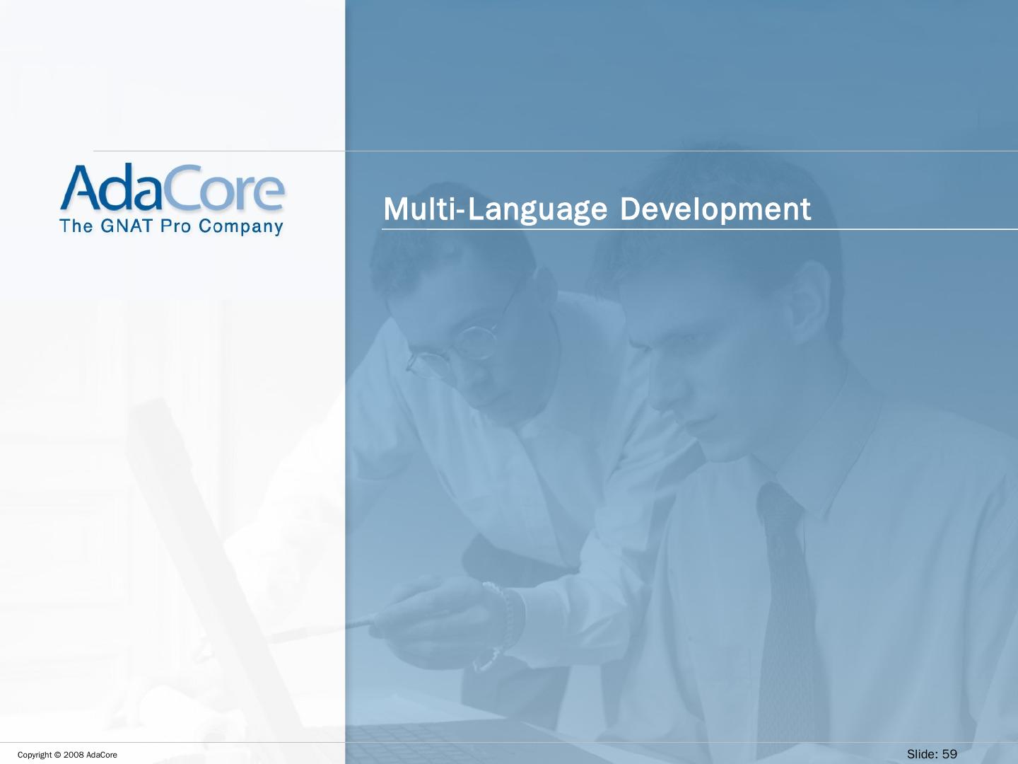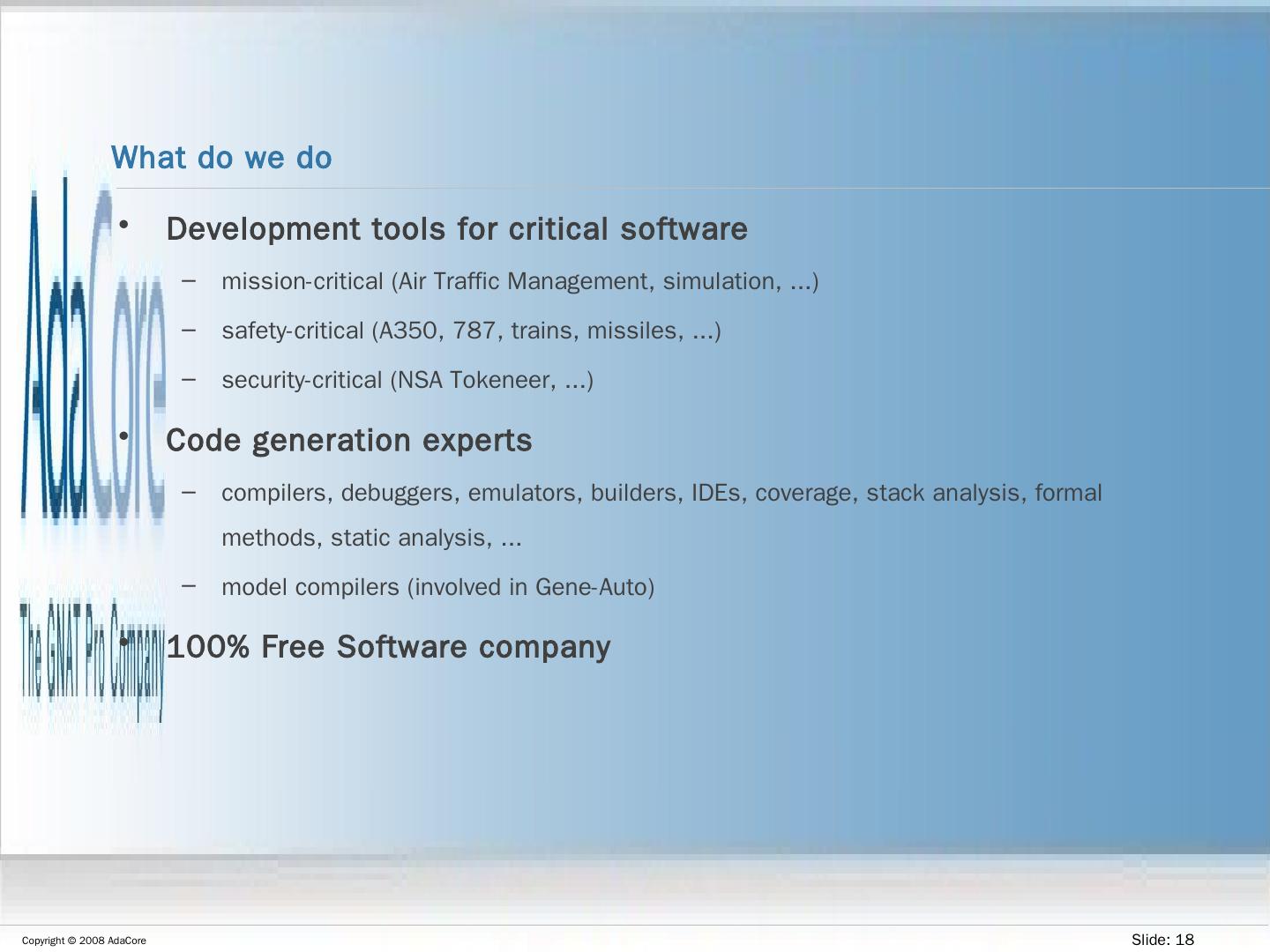 Vista has about 50 million lines of C; Microsoft is busy adding static assertions to this ..... Support for Ada, C, C++; GPRbuild; C/C++ to Ada Binding Generator ...
