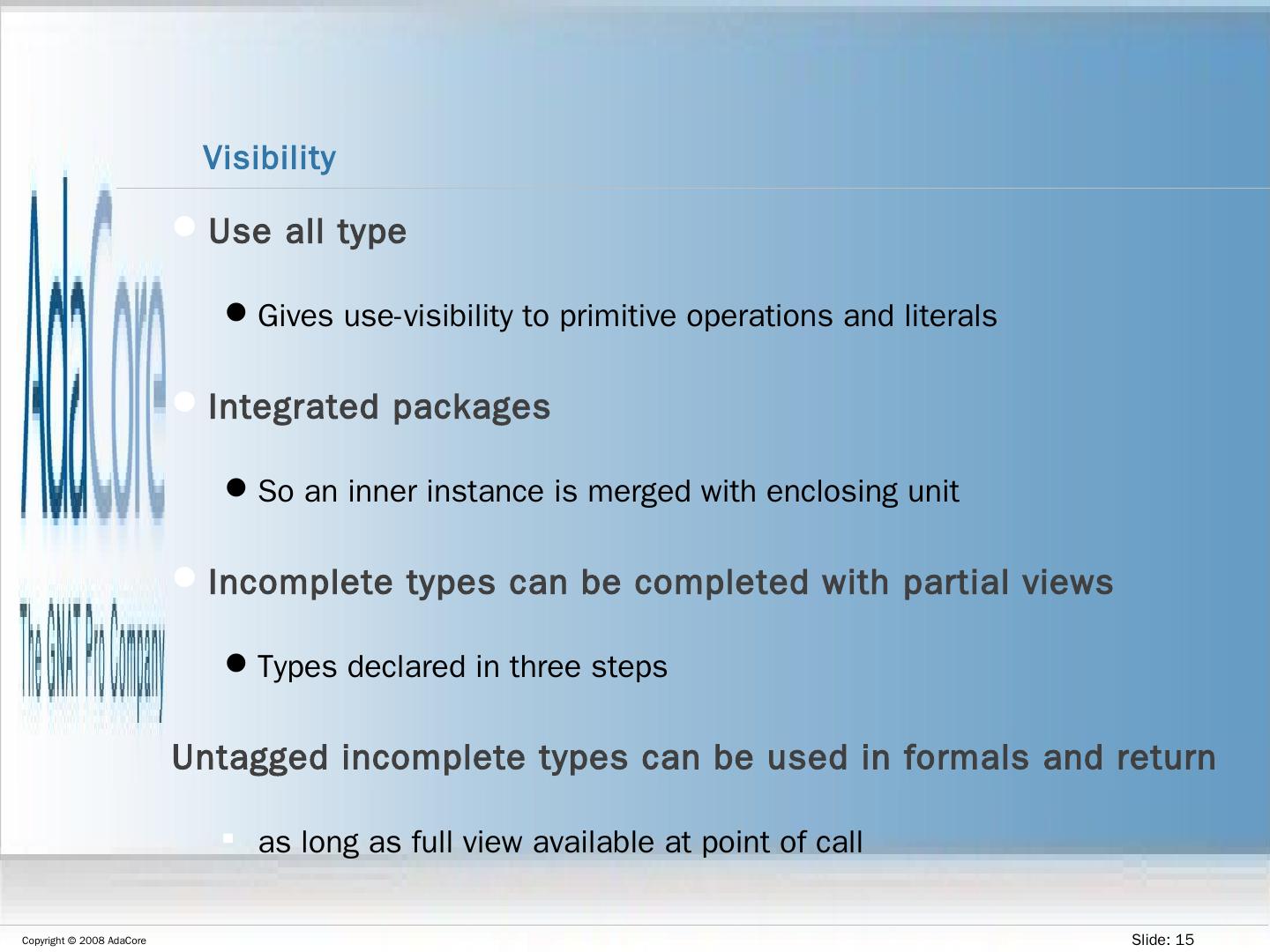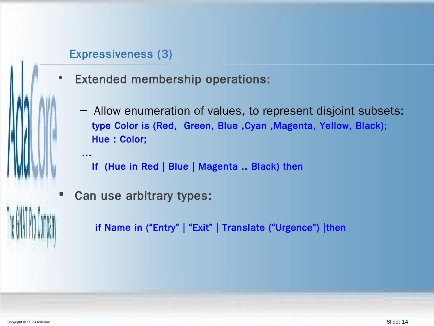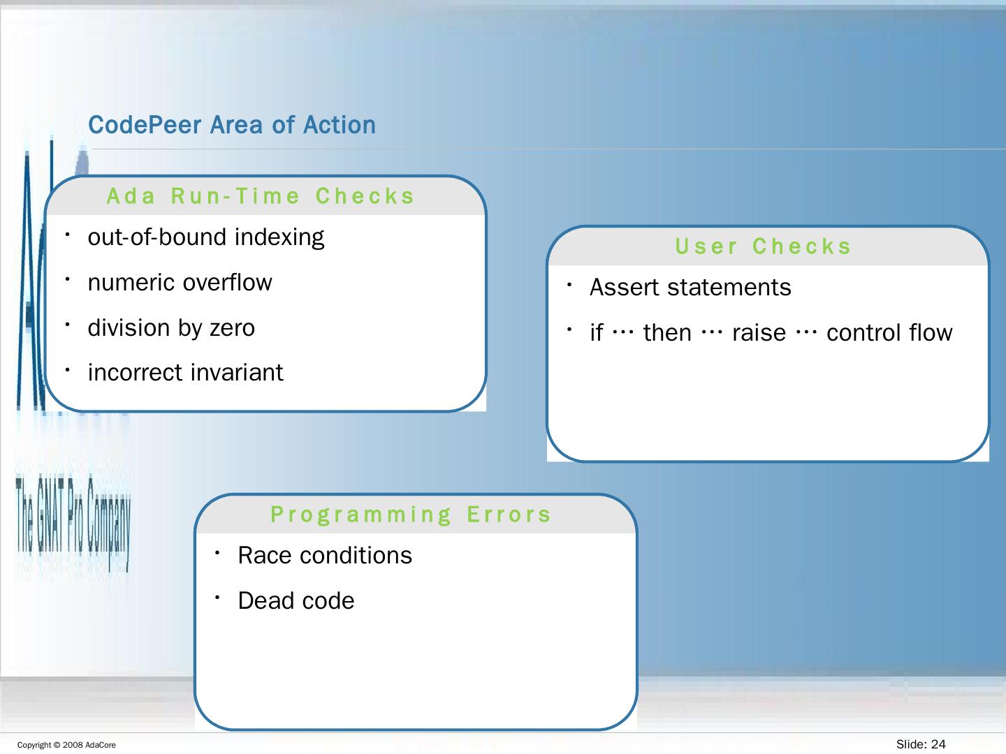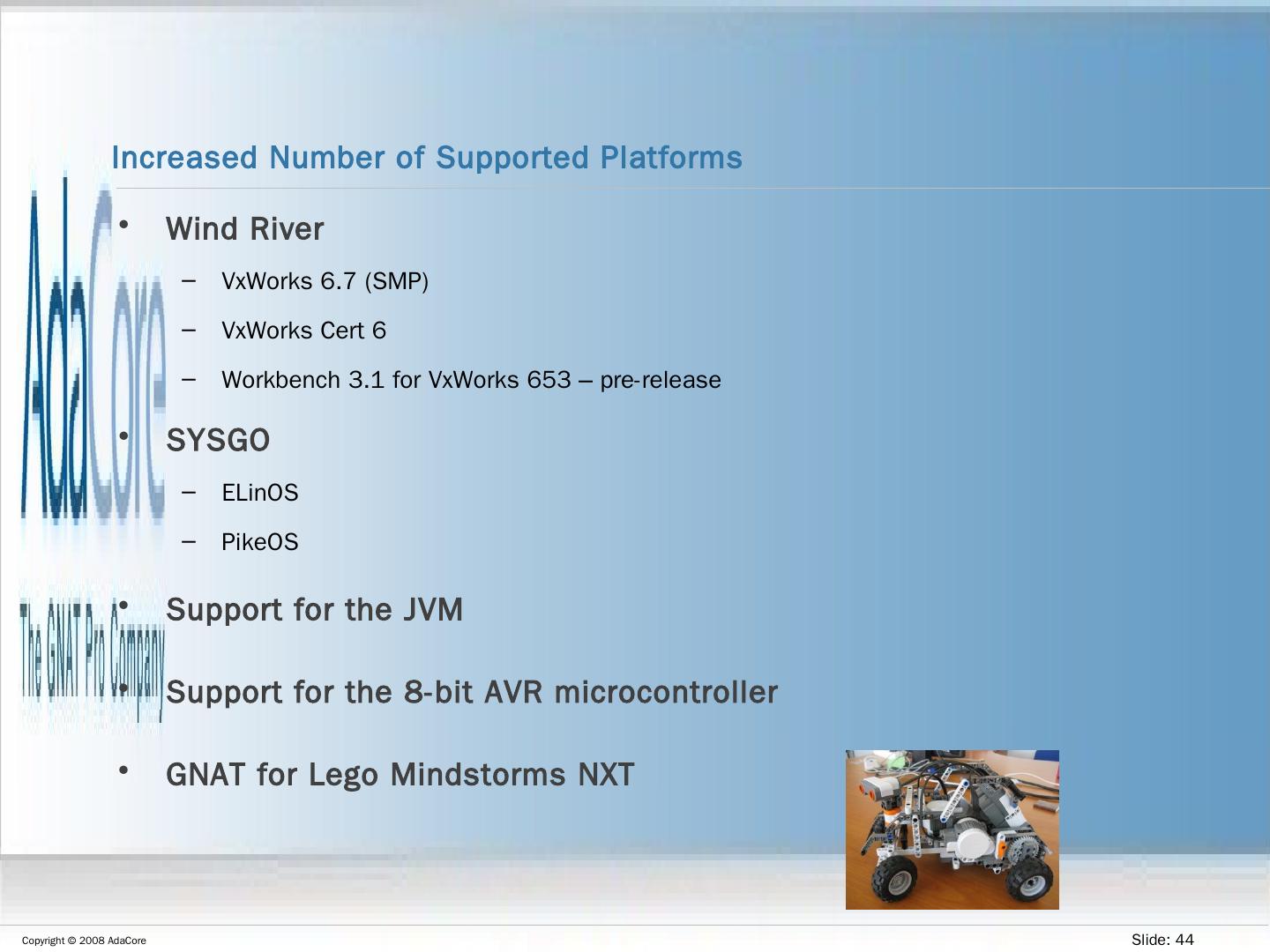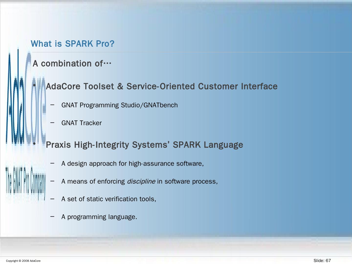 Vista has about 50 million lines of C; Microsoft is busy adding static assertions to this ..... Support for Ada, C, C++; GPRbuild; C/C++ to Ada Binding Generator ...
