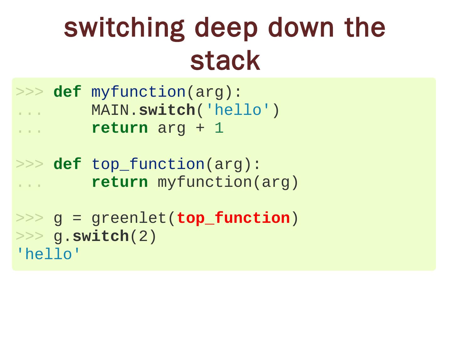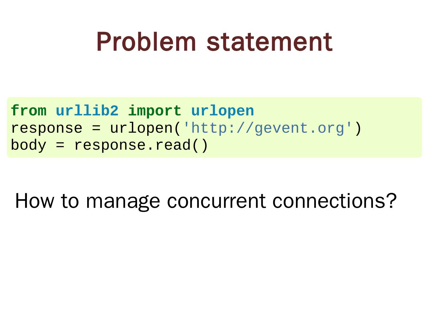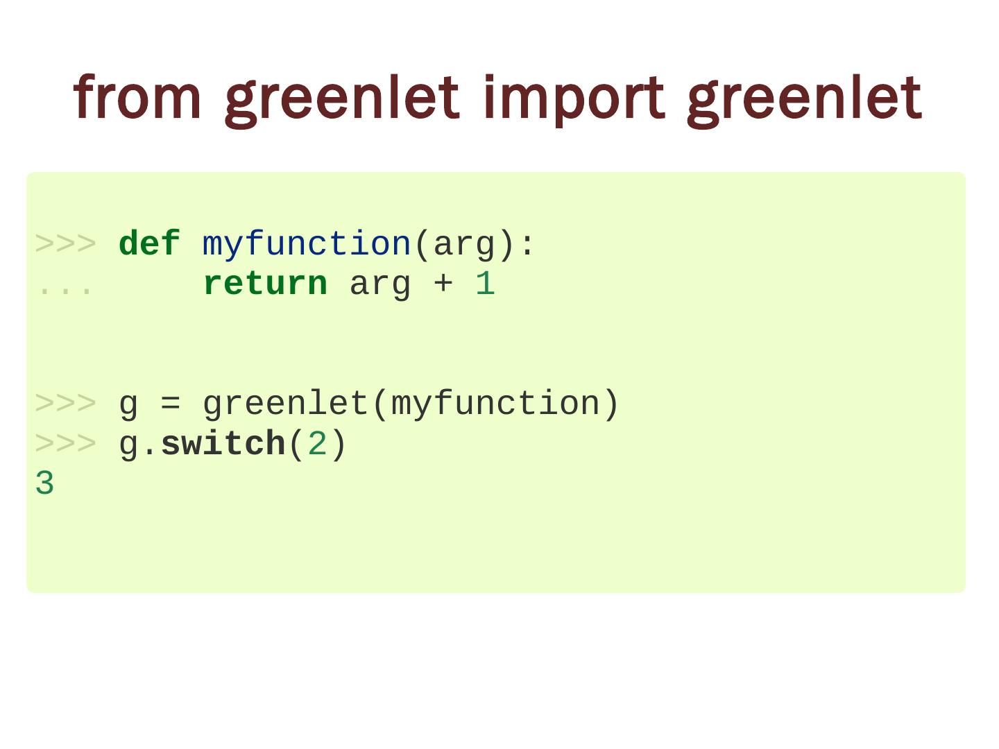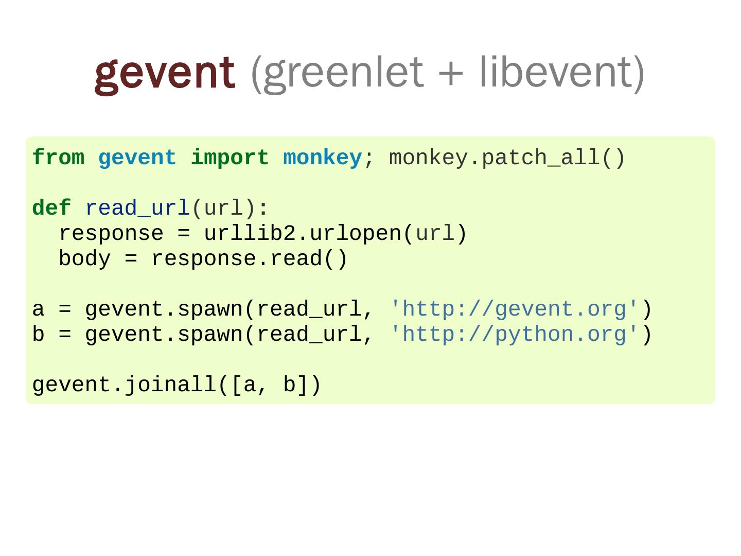 Beware: libraries that wrap C libraries (e.g. MySQLdb); Disk I/O; things not yet patched: subprocess, os.system, sys.stdin. Tested with httplib, urllib2, mechanize, ...