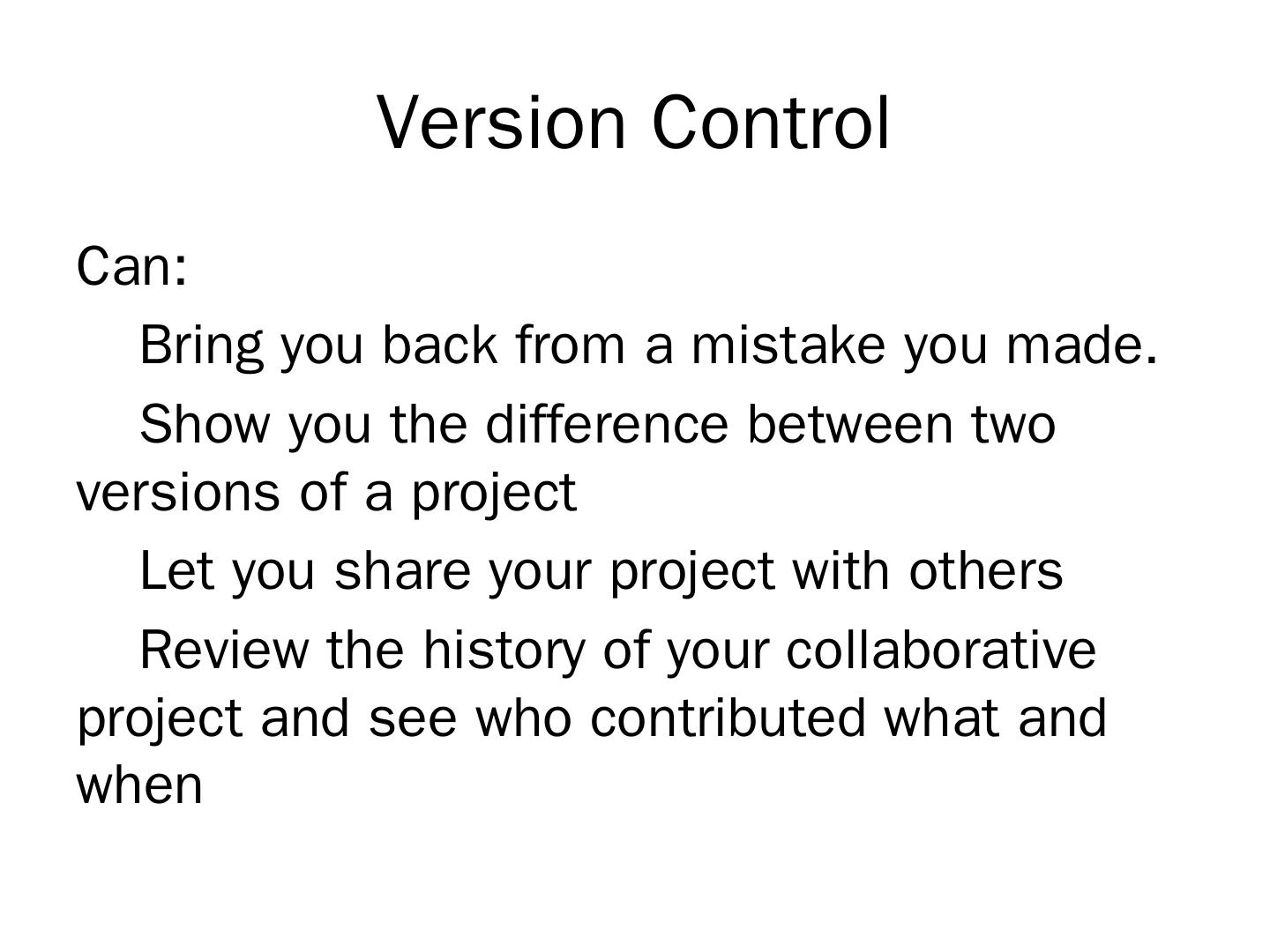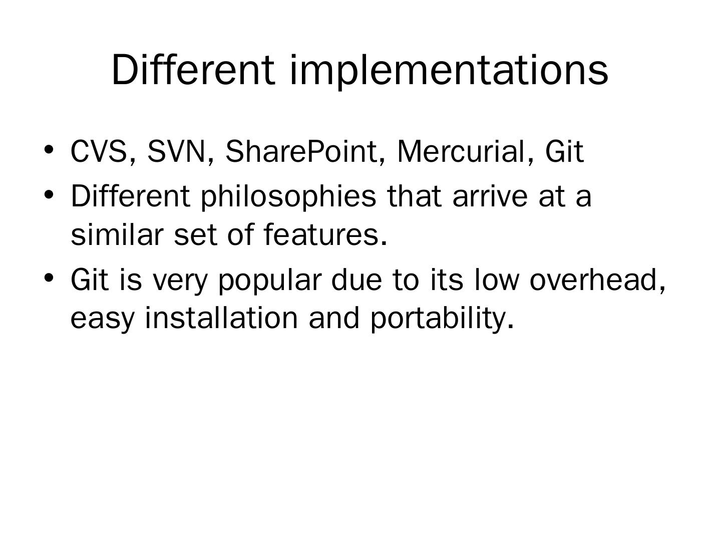 CVS, SVN, SharePoint, Mercurial, Git; Different philosophies that arrive at a similar set of features. Git is very popular due to its low overhead, easy installation ...