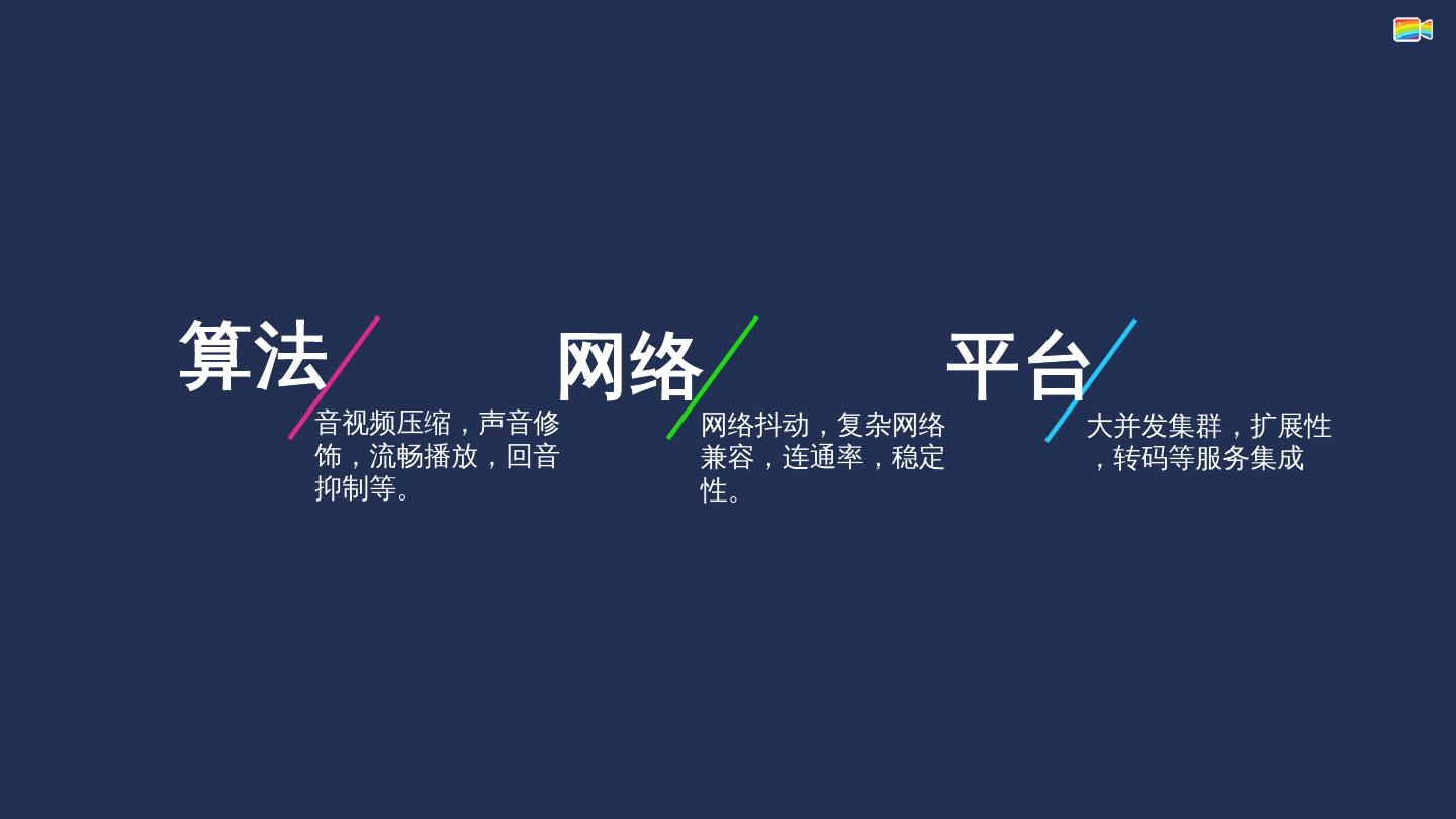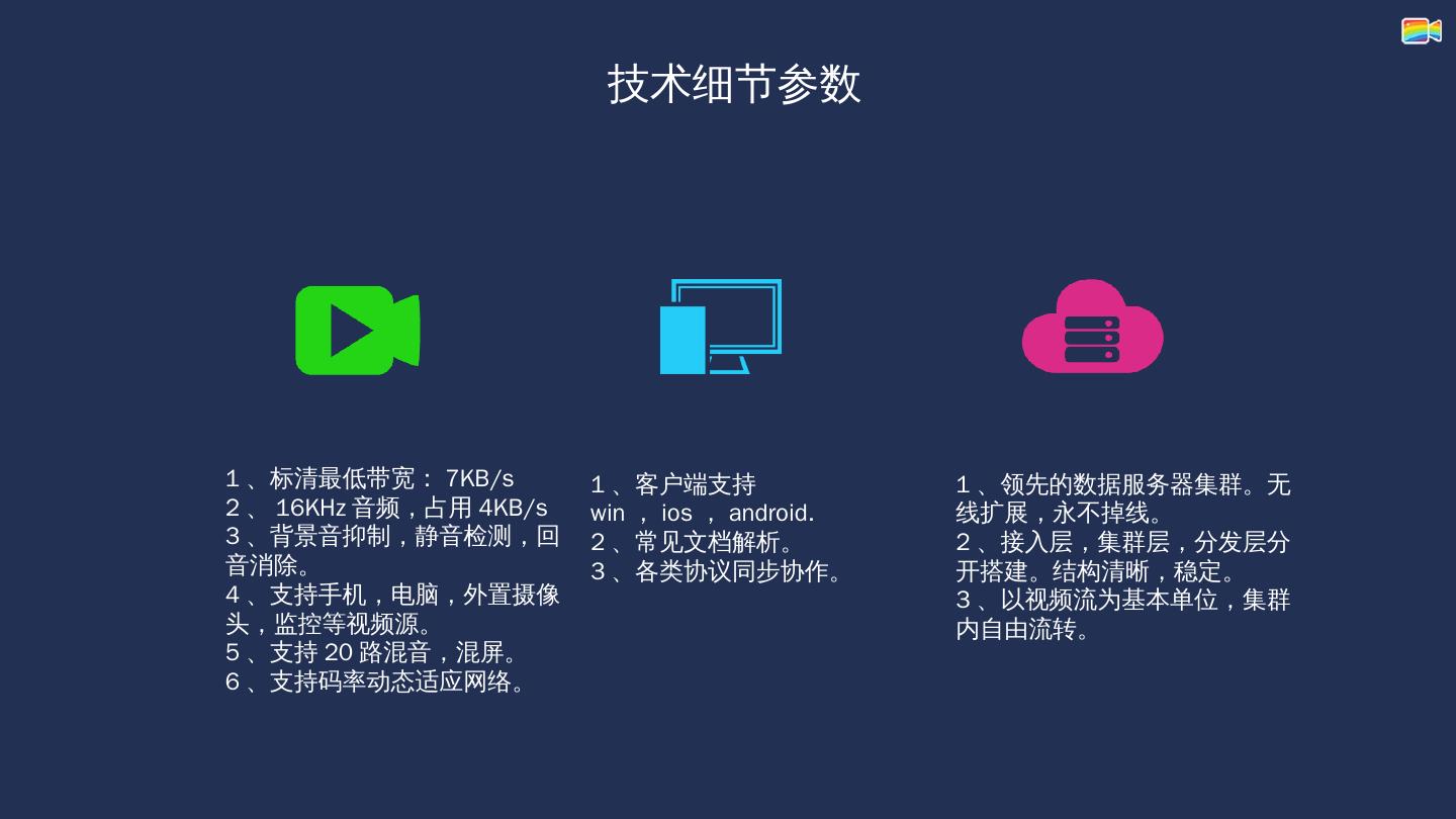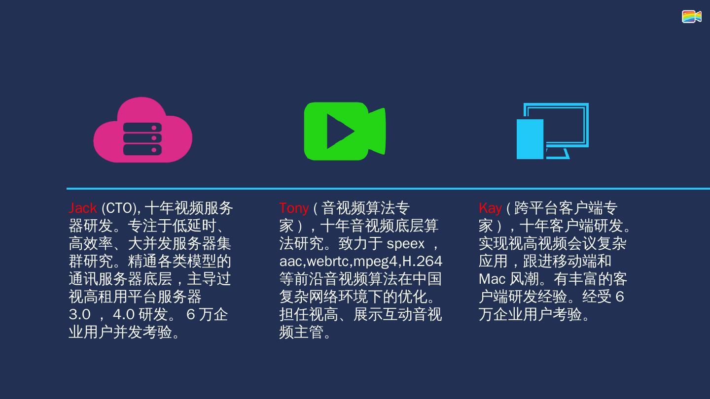 专注于低延时、高效率、大并发服务器集群研究。 ... 实现视高视频会议复杂应用,跟进移动端和Mac风潮。 ... 4.0视频会议服务器集群,为永不掉线,无限扩展架构。