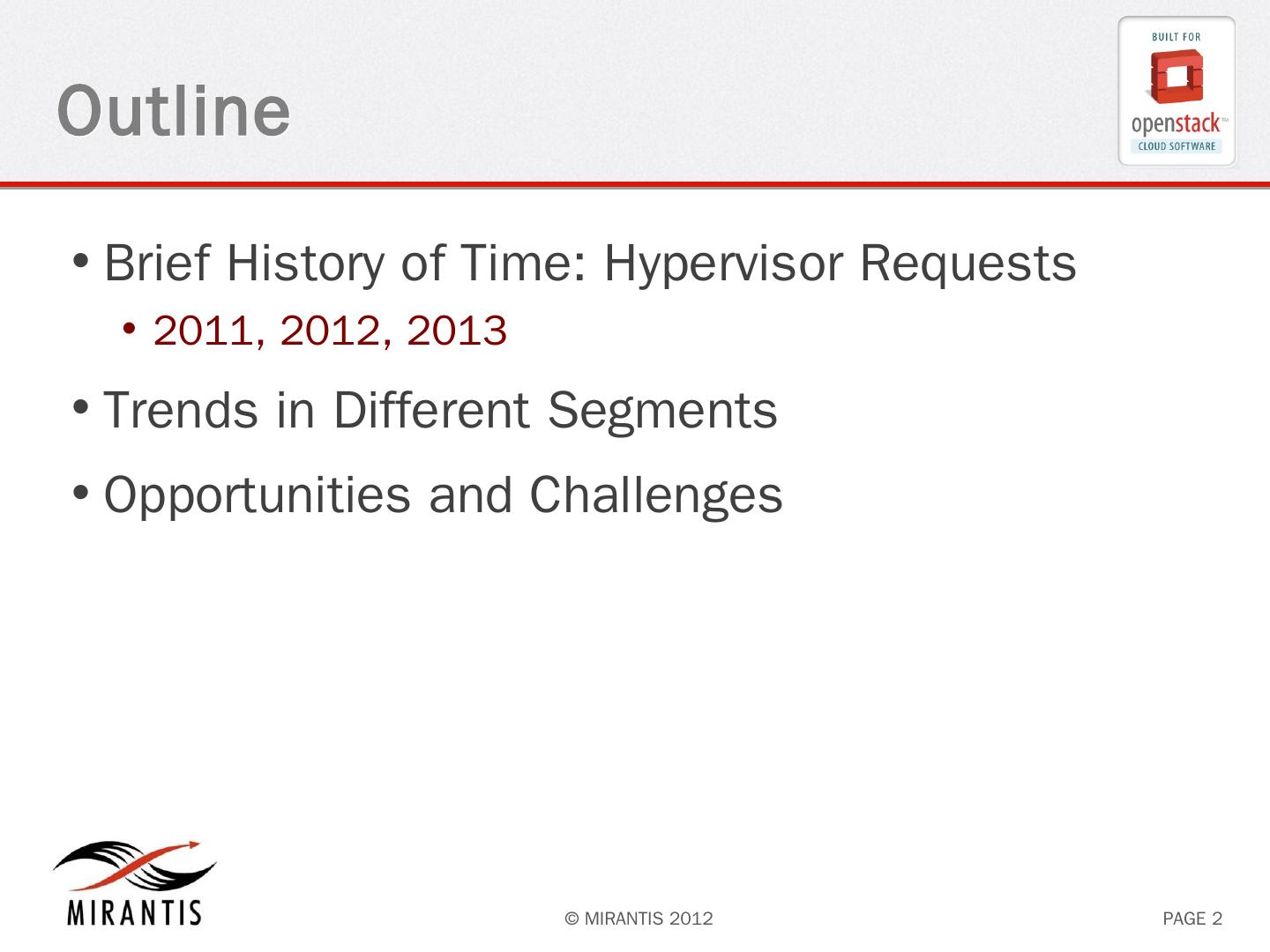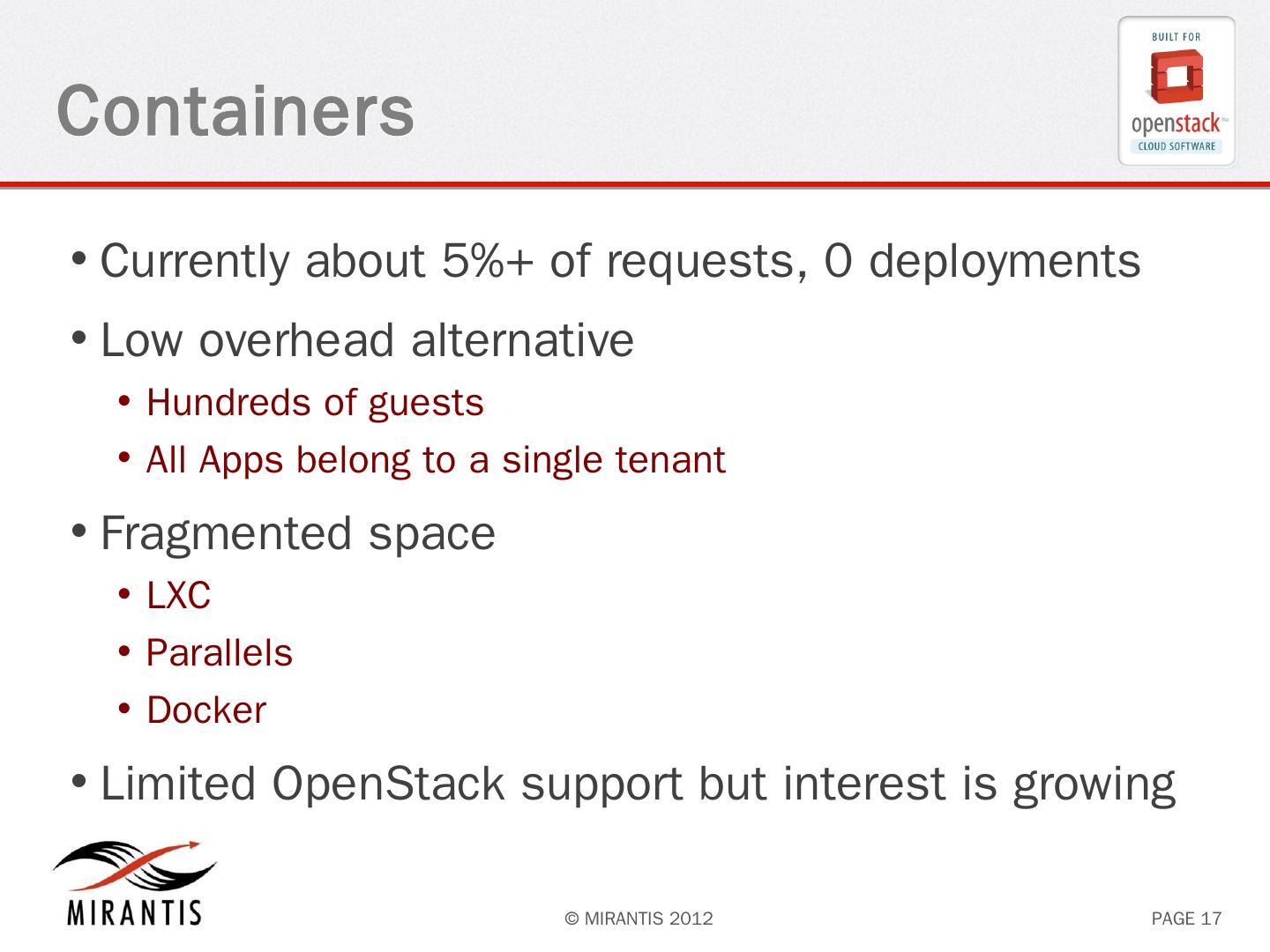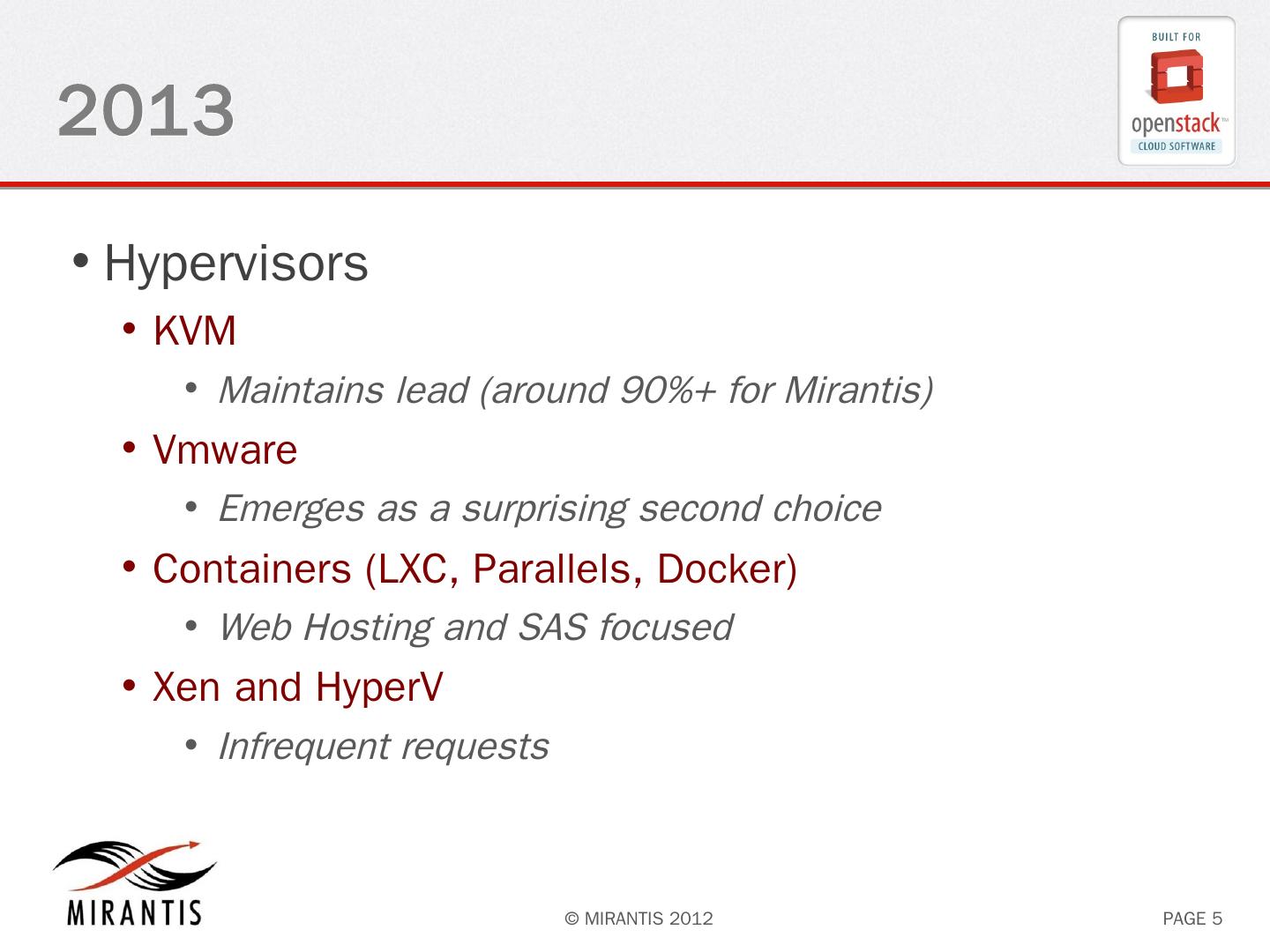 2011. Hypervisors. XEN. Default choice given Rackspace and Amazon use ... Vmware. Emerges as a surprising second choice. Containers (LXC, Parallels ...