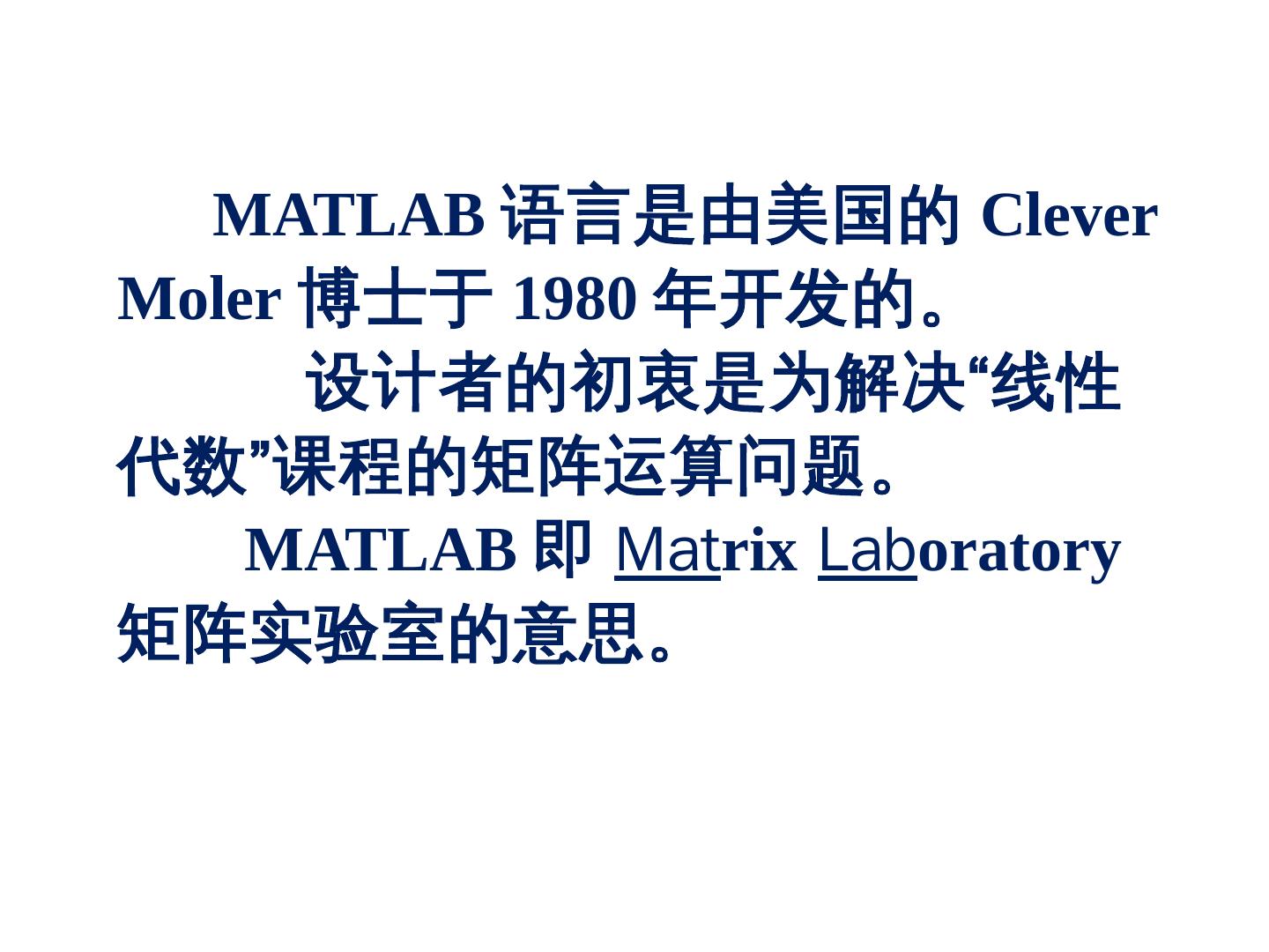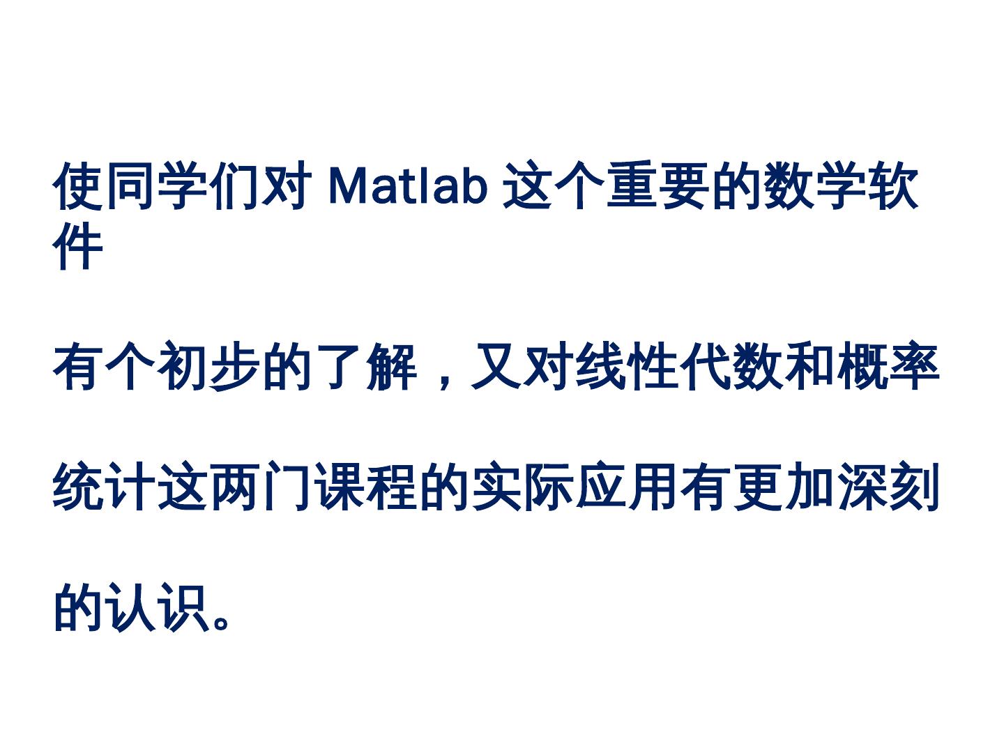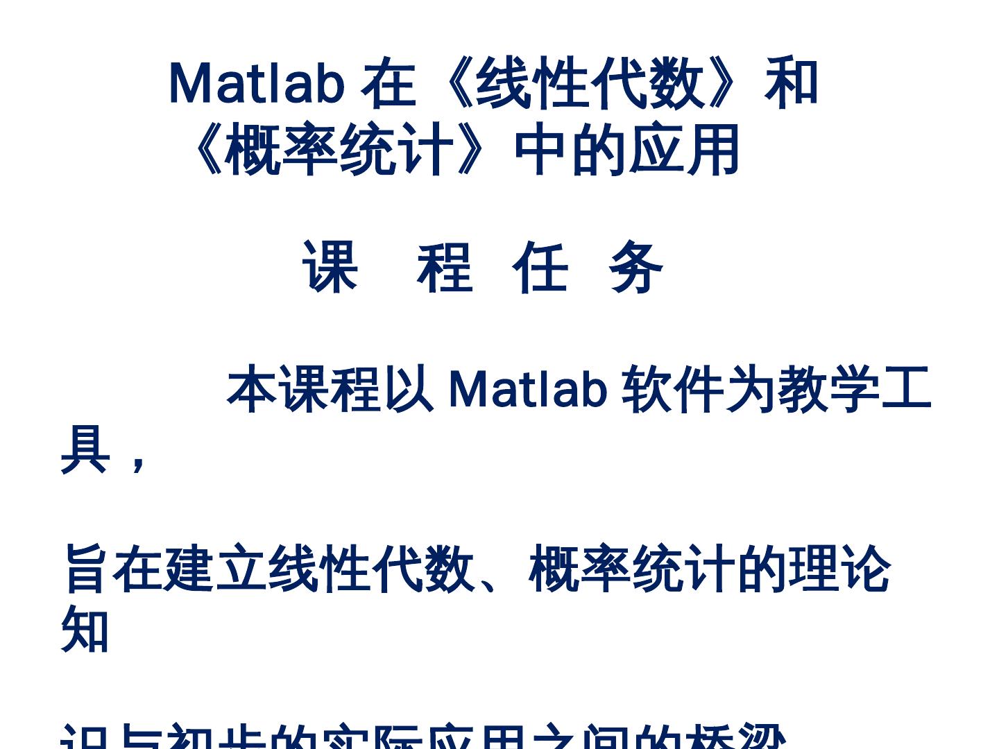 本课程以Matlab软件为教学工具,. 旨在建立线性代数、概率统计的理论知. 识与初步的实际应用之间的桥梁。 课 程 任 务. Matlab在《线性代数》和. 《概率统计》中的应用.