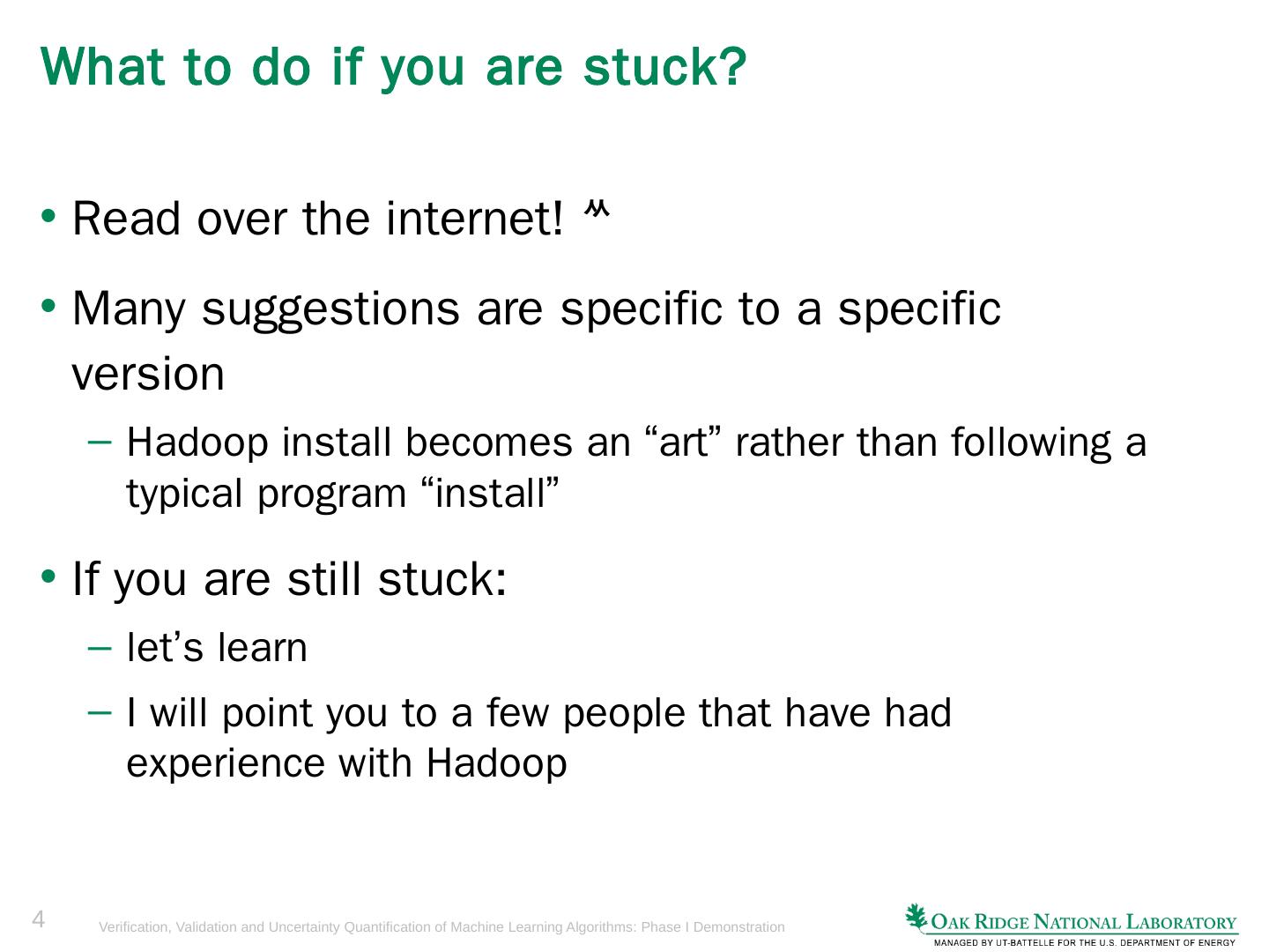 4 .What to do if you are stuck? Read over the internet! Many suggestions are specific to a specific version Hadoop install becomes an “art” rather than following a typical program “install” If you are still stuck: let’s learn I will point you to a few people that have had experience with H adoop