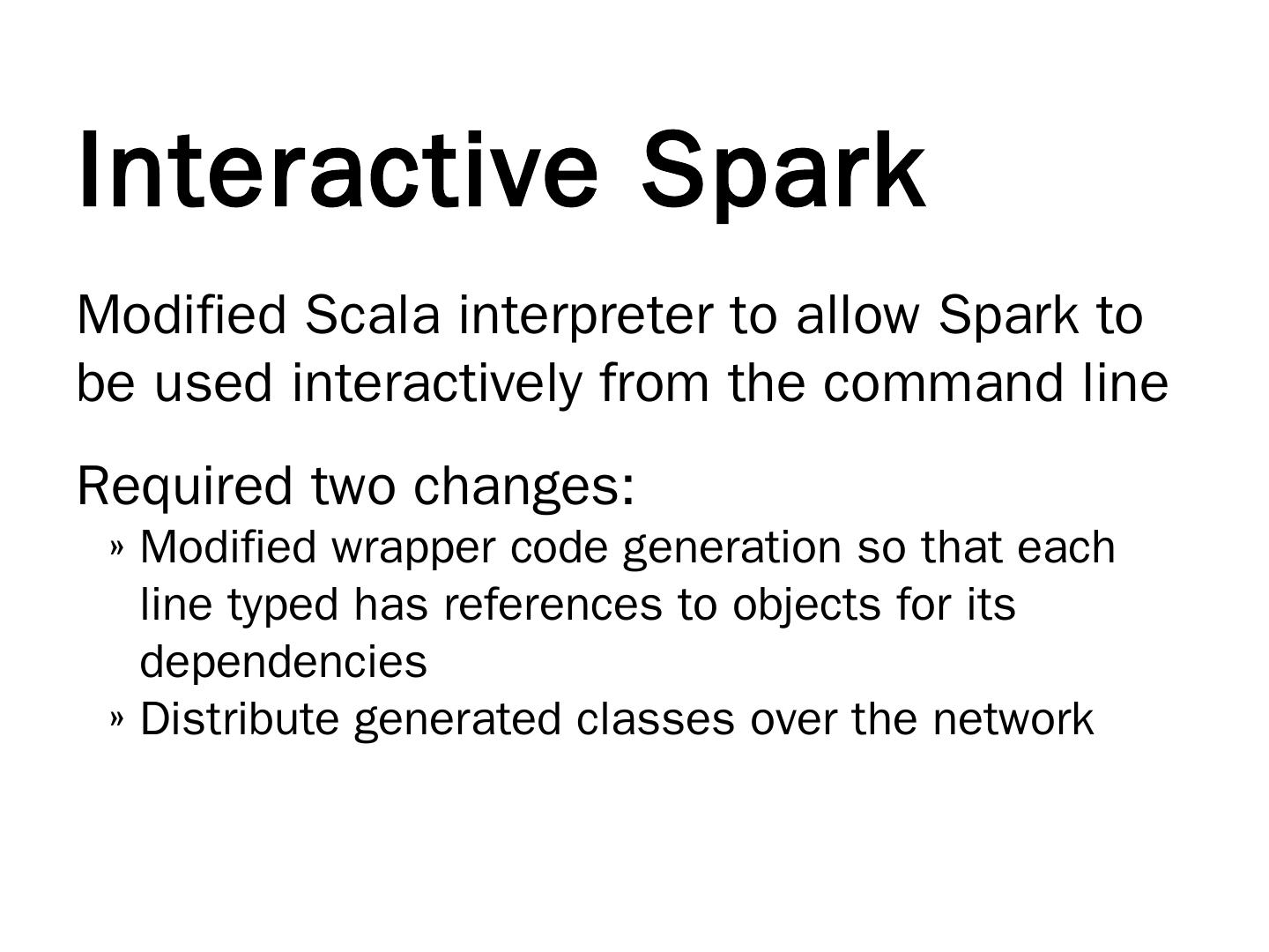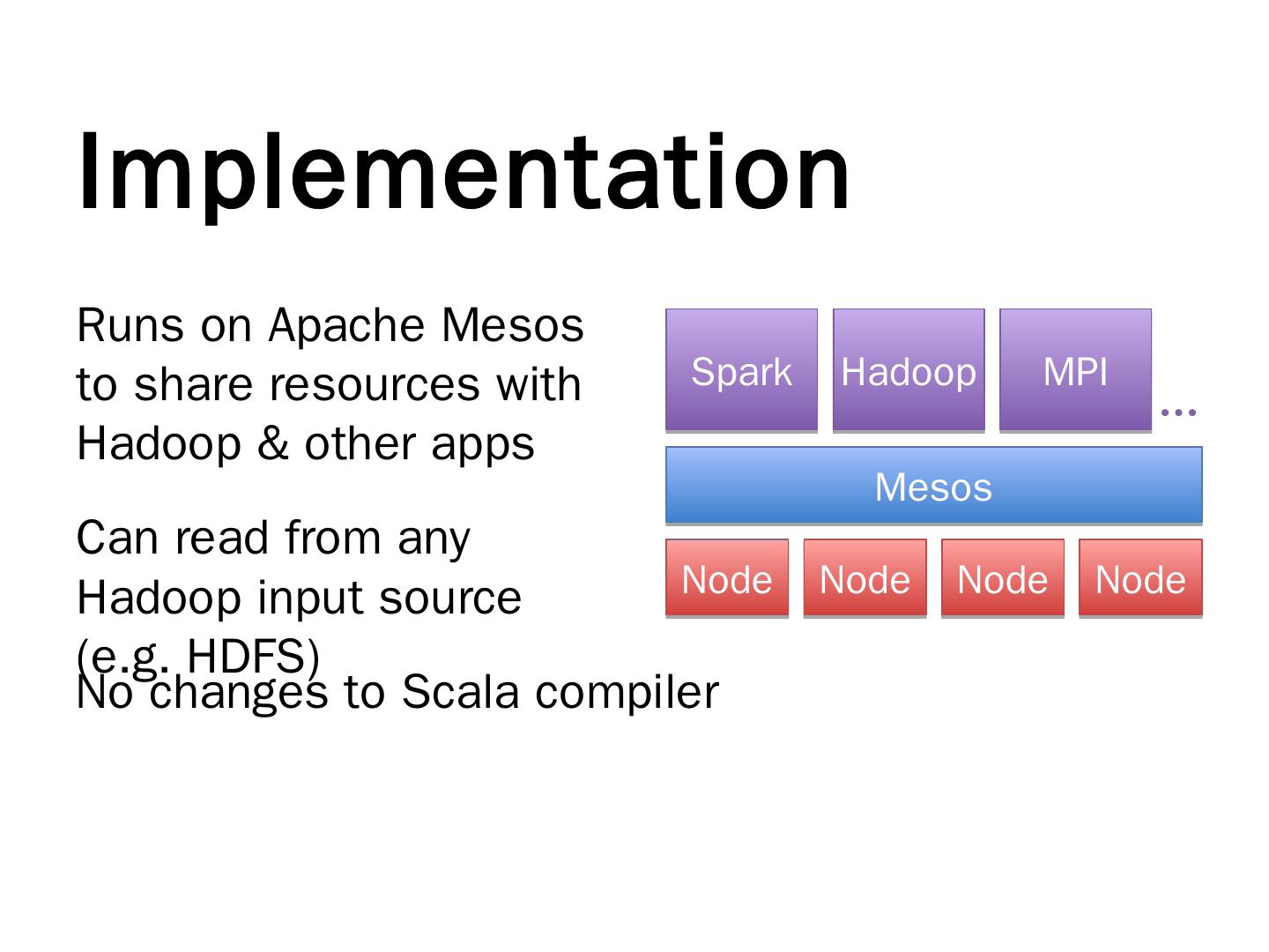 Spark. Fast, Interactive, Language-Integrated Cluster Computing .... Runs on Apache Mesos to share resources with Hadoop & other apps. Can read from any ...