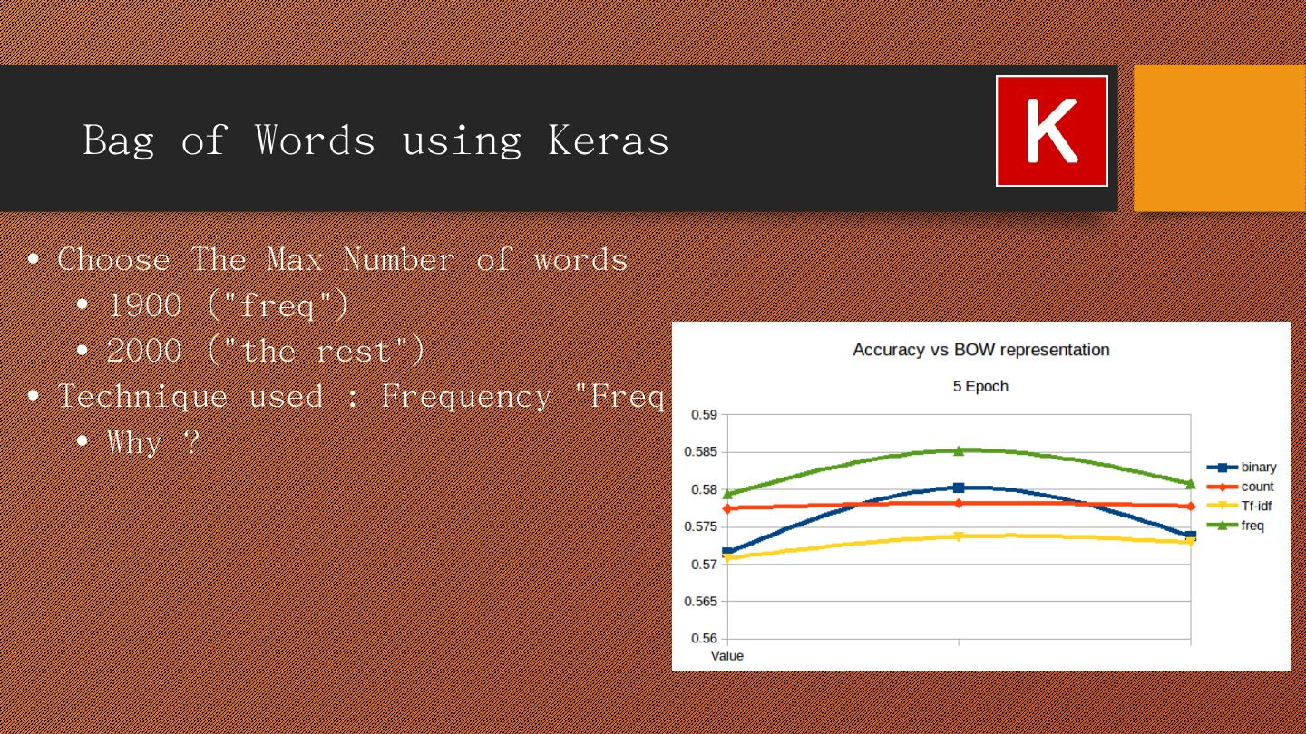Bag of Words using Keras. Choose The Max Number of words. 1900 ("freq"); 2000 ("the rest"). Technique used : Frequency "Freq". Why ? Activation Method.