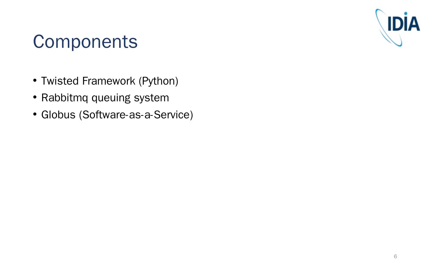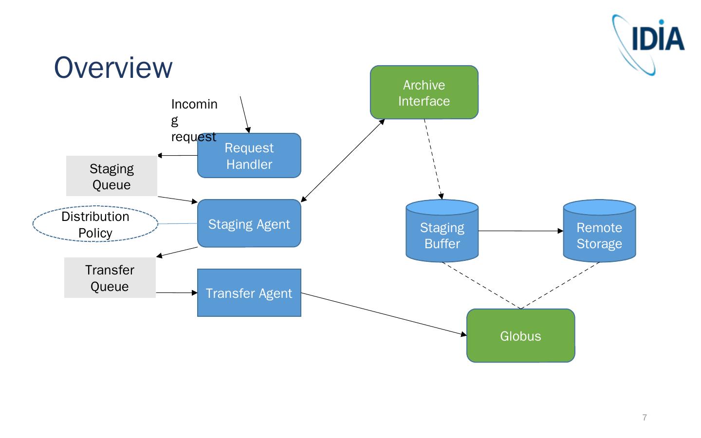 Twisted Framework (Python); Rabbitmq queuing system; Globus (Software-as-a-Service). 6. Overview. 7. Staging Buffer. Request Handler. Transfer Agent.
