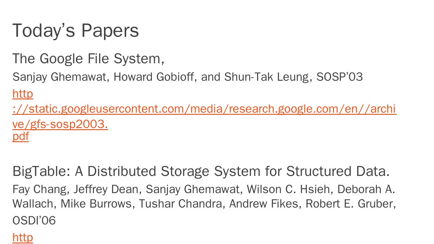 GFS and BigTable. Lecture 17, cs262a. Ion Stoica & Ali Ghodsi,. UC Berkeley. March 19, 2018. Today's Papers. The Google File System,. Sanjay Ghemawat ...