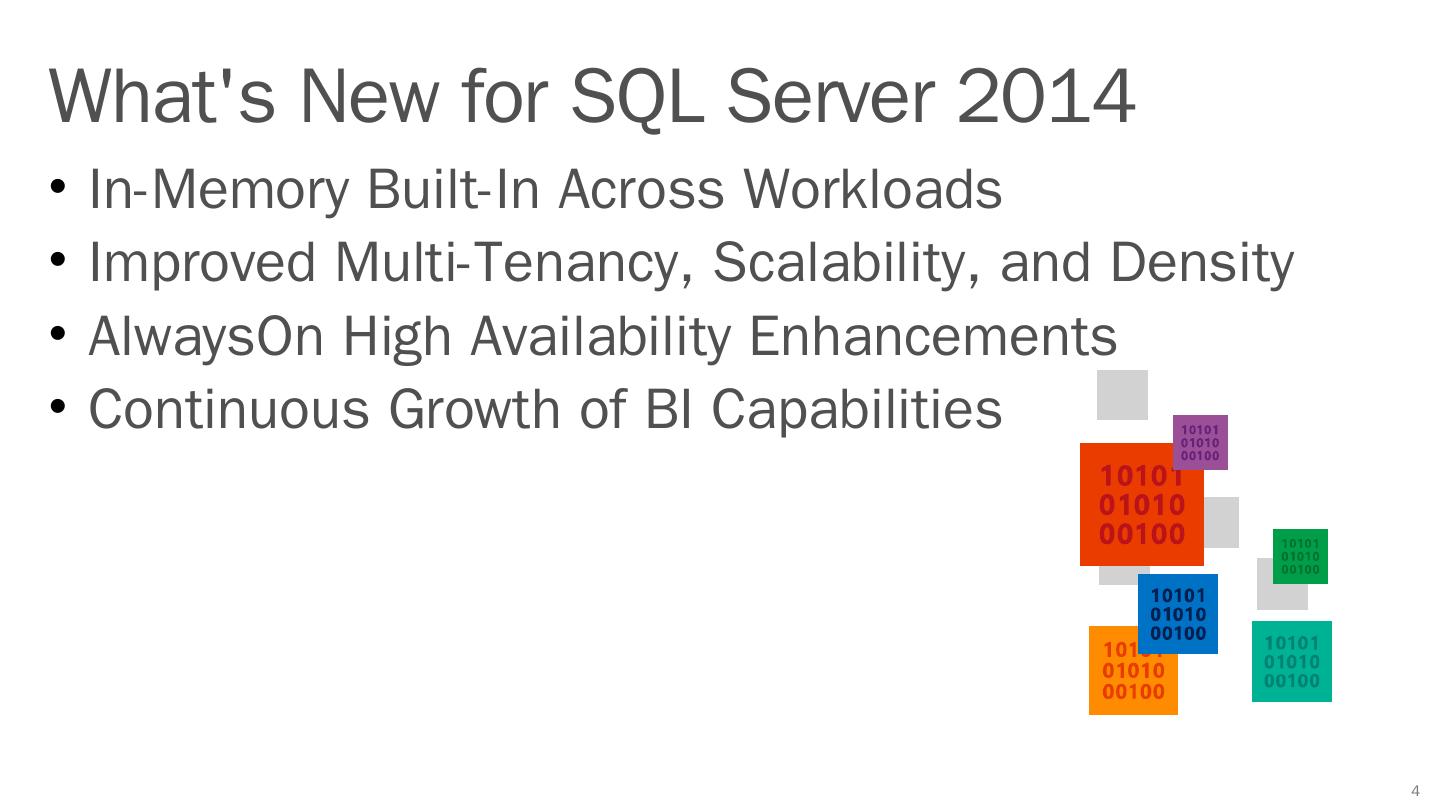 3 .SQL Server 2014 as an Enterprise Customer Data Platform Mission Critical Performance Faster Insights from Any Data Platform for Hybrid Cloud In-Memory Built-In Average 10x faster for new and existing SQL Server apps Secure & Scalable Most secure with enterprise scale using Windows Server High Availability The 9’s you need, with AlwaysOn Mission Critical Support Live support designed for mission critical solutions Easy access to data, big & small Search, access, and shape internal and external data, and combine with unstructured data Powerful insights with familiar tools Speed up analysis and time to insight with the familiarity of Excel in Office and Office 365 and access via mobile devices Complete BI platform Scale your BI models and enrich and secure your data with a complete platform spanning cloud and on-premises Hybrid Cloud Solutions Enable new hybrid scenarios like cloud backup and cloud DR to reduce costs and improve on-premises DR Easy On-Ramp to Cloud Easily migrate and run SQL Server in the cloud to gain benefits of cloud computing Complete & Consistent Deploy a complete and consistent data platform from on-premises to cloud 3