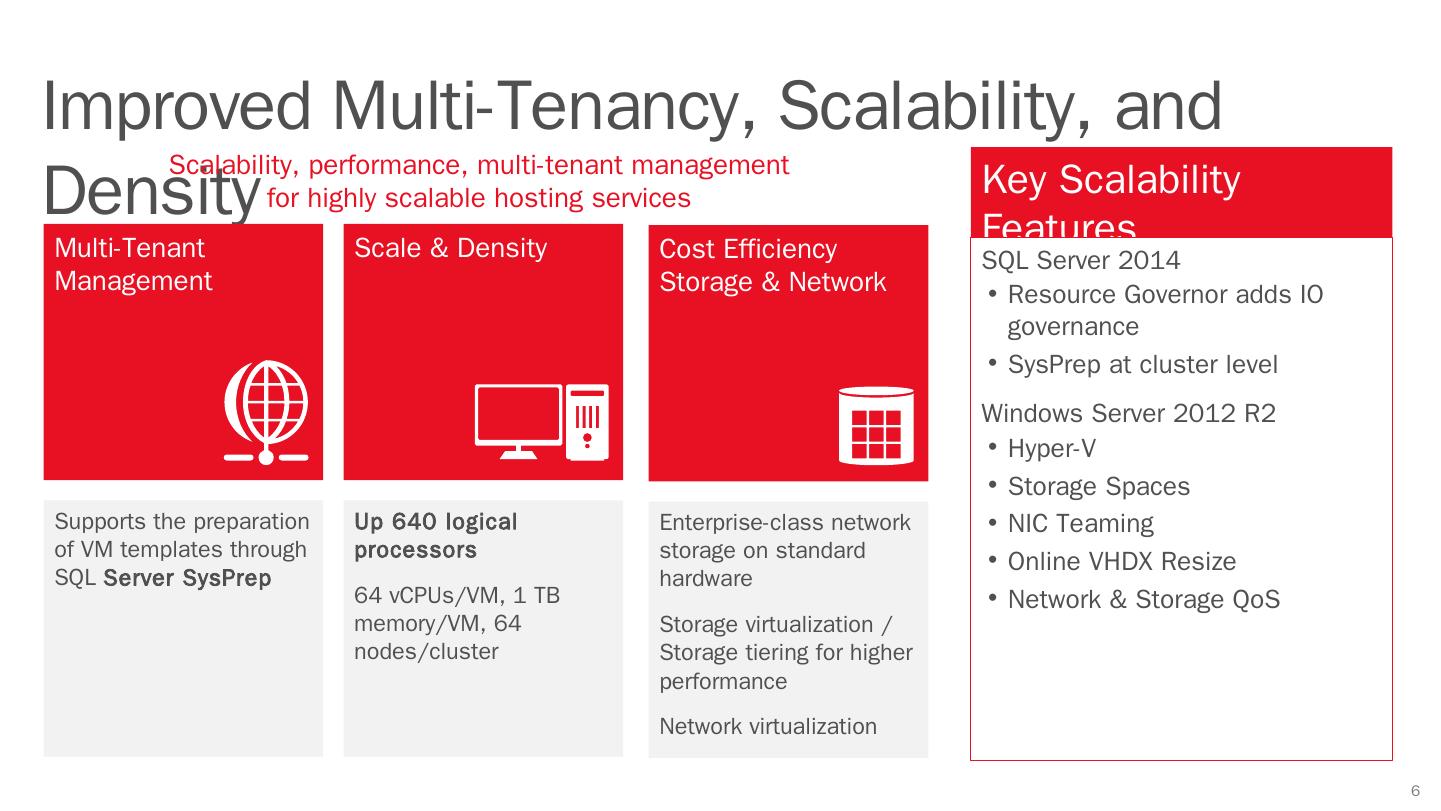 6 .Up 640 logical processors 64 vCPUs/VM, 1 TB memory/VM, 64 nodes/cluster Supports the preparation of VM templates through SQL Server SysPrep Enterprise-class network storage on standard hardware Storage virtualization / Storage tiering for higher performance Network virtualization Improved Multi-Tenancy, Scalability, and Density Scale & Density Multi-Tenant Management Cost Efficiency Storage & Network Key Scalability Features SQL Server 2014 Resource Governor adds IO governance SysPrep at c luster level Windows Server 2012 R2 Hyper-V Storage Spaces NIC Teaming Online VHDX Resize Network & Storage QoS Scalability, performance, multi-tenant management for highly scalable hosting services 6