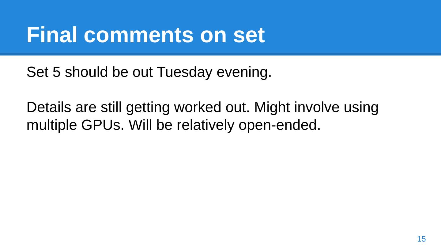Today: Theano (Python library that makes GPU computing easy). Rest of week: parallelizing machine learning yourself, how to write your own CUDA code. 20.