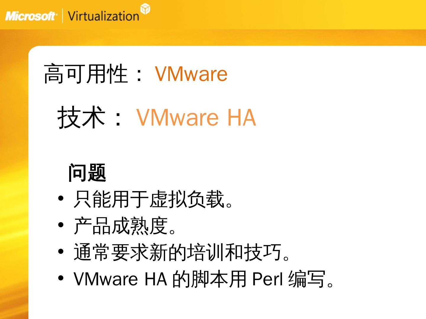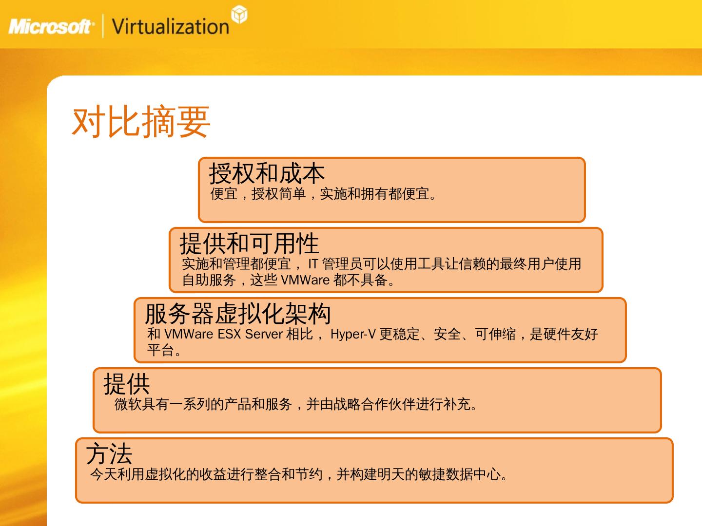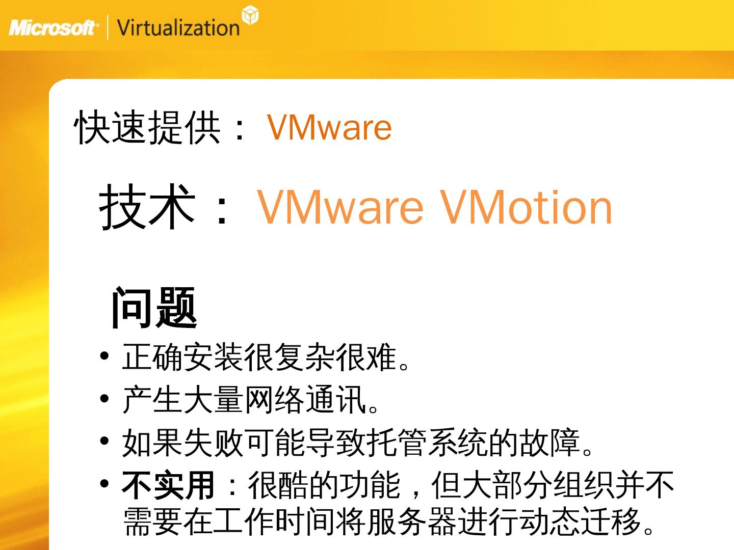 服务器虚拟化:Vmware的方法. 关注短期结果. 问题:. 需要新的基础架构、管理方法以及技巧。 缺少在物理服务器上管理负载的工具。 昂贵,市面上最贵的虚拟化解决 ...