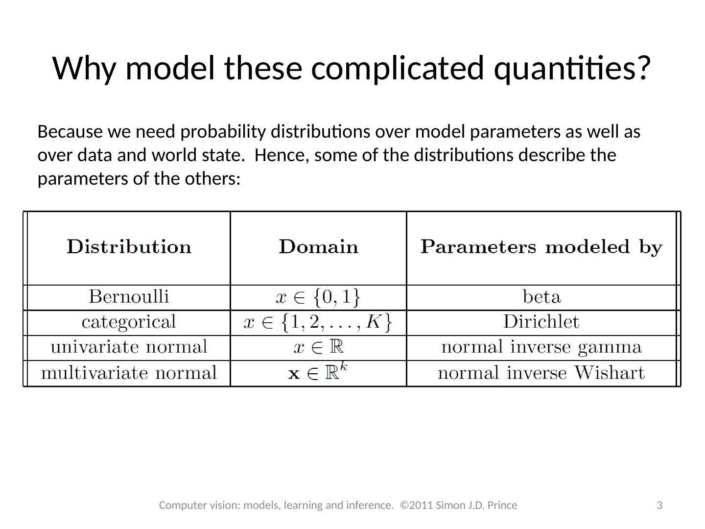 3 .Why model these complicated quantities? Because we need probability distributions over model parameters as well as over data and world state. Hence, some of the distributions describe the parameters of the others: 3 Computer vision: models, learning and inference. ©2011 Simon J.D. Prince