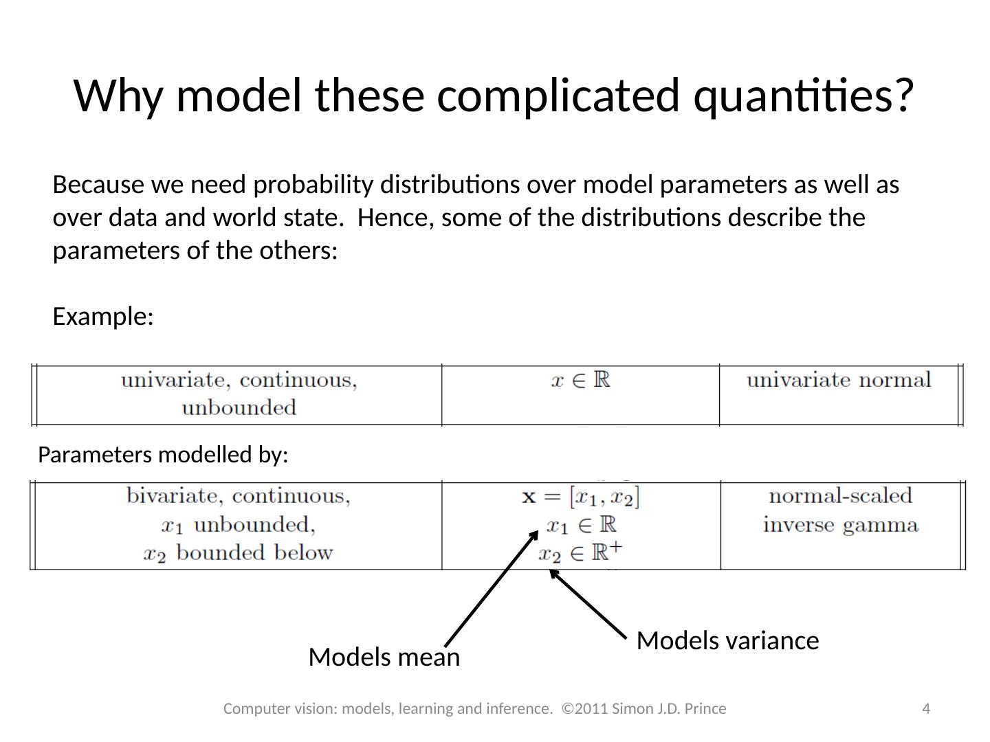 4 .Computer vision: models, learning and inference. ©2011 Simon J.D. Prince Why model these complicated quantities? Because we need probability distributions over model parameters as well as over data and world state. Hence, some of the distributions describe the parameters of the others: Example: Models mean Models variance Parameters modelled by: 4