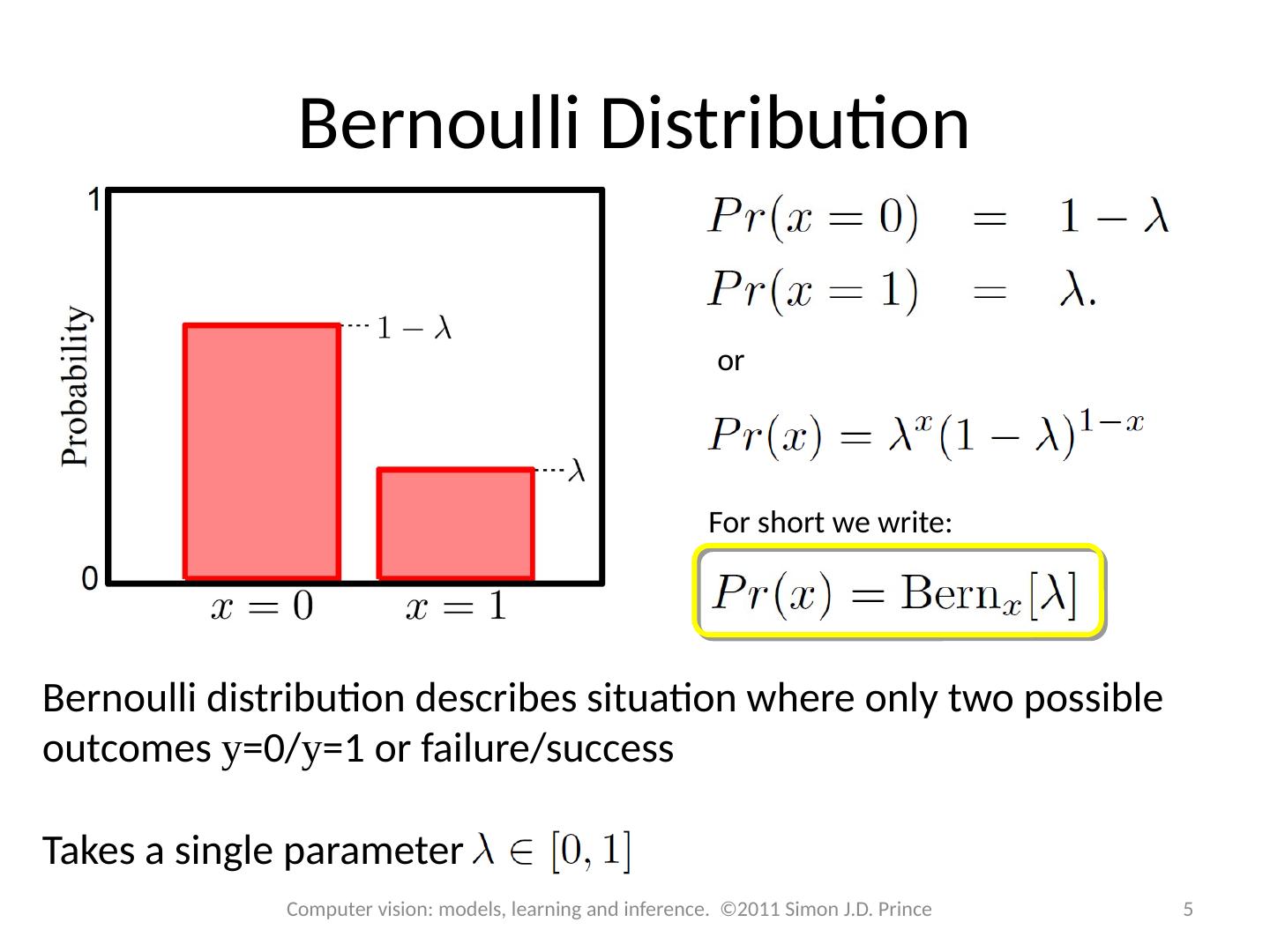 5 .Bernoulli Distribution or For short we write: Bernoulli distribution describes situation where only two possible outcomes y =0/ y =1 or failure/success Takes a single parameter 5 Computer vision: models, learning and inference. ©2011 Simon J.D. Prince