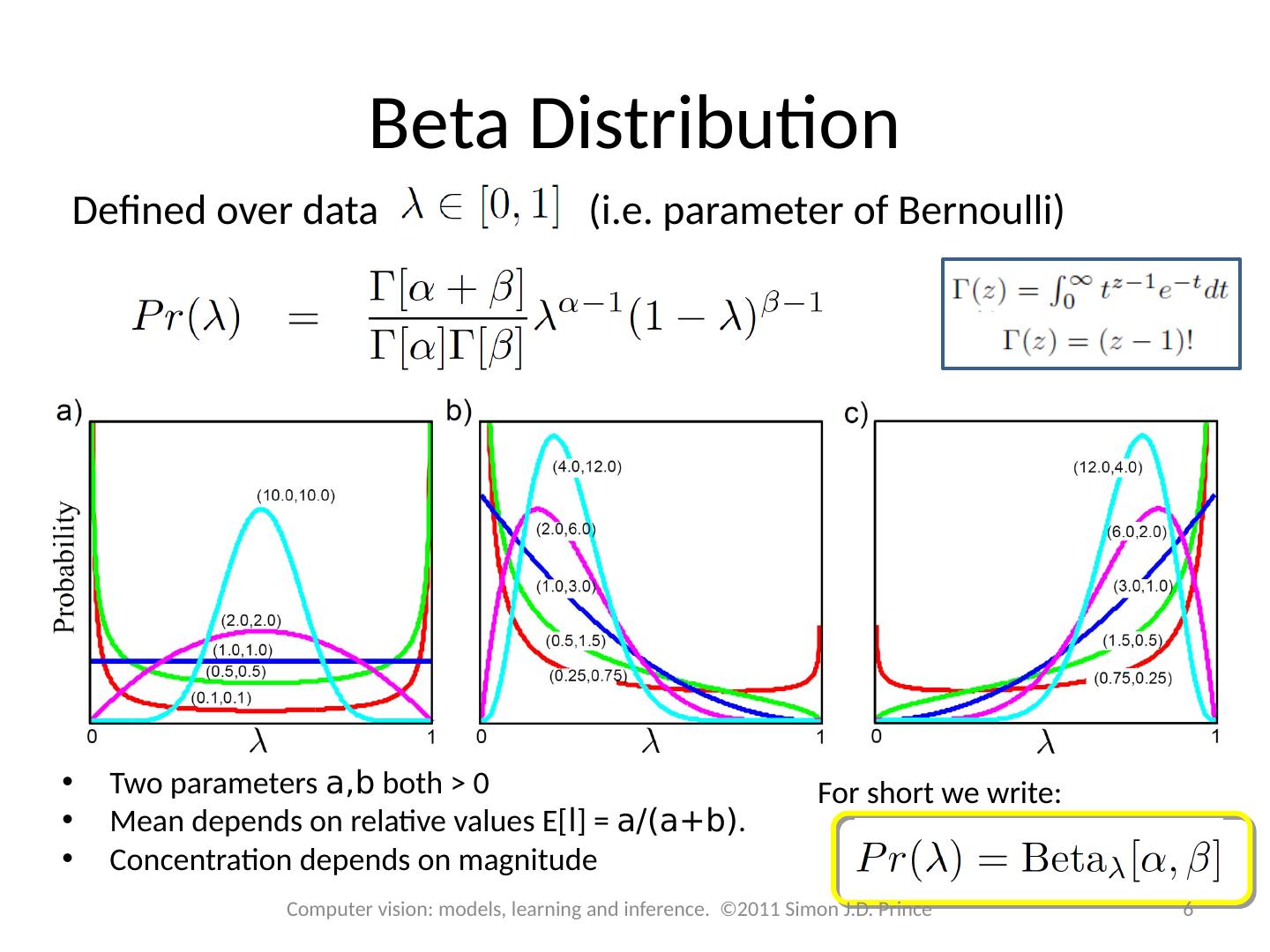 6 .Beta Distribution Defined over data (i.e. parameter of Bernoulli) Two parameters a,b both > 0 Mean depends on relative values E[ l ] = a/( a+b ) . Concentration depends on magnitude For short we write: 6 Computer vision: models, learning and inference. ©2011 Simon J.D. Prince
