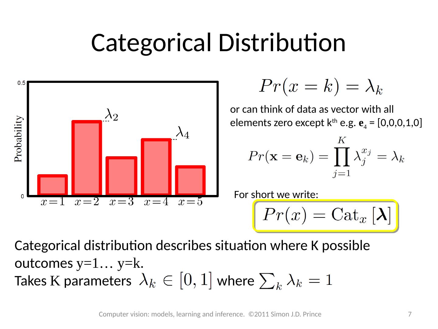 7 .Computer vision: models, learning and inference. ©2011 Simon J.D. Prince Categorical Distribution or can think of data as vector with all elements zero except k th e.g. e 4 = [0,0,0,1,0] For short we write: Categorical distribution describes situation where K possible outcomes y=1… y=k . Takes K parameters where 7