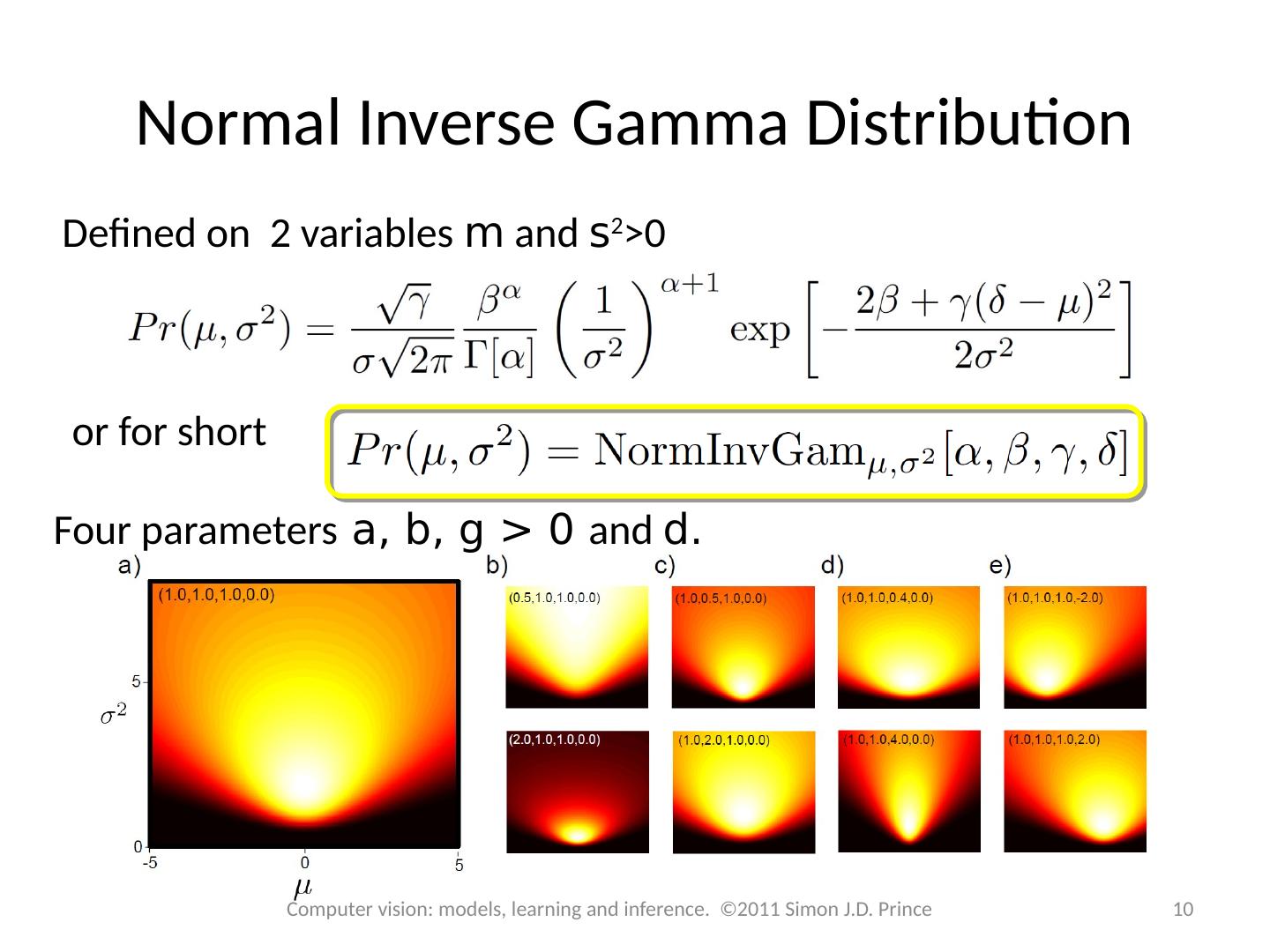 10 .Normal Inverse Gamma Distribution Defined on 2 variables m and s 2 >0 o r for short Four parameters a, b, g > 0 and d. 10 Computer vision: models, learning and inference. ©2011 Simon J.D. Prince