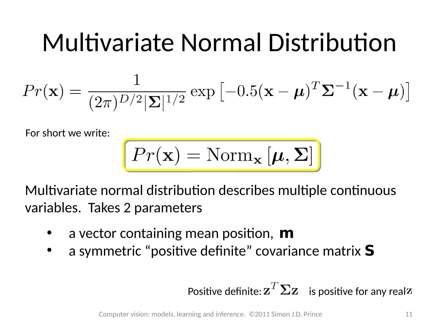 11 .Computer vision: models, learning and inference. ©2011 Simon J.D. Prince Multivariate Normal Distribution For short we write: Multivariate normal distribution describes multiple continuous variables. Takes 2 parameters a vector containing mean position, m a symmetric “positive definite” covariance matrix S Positive definite: is positive for any real 11