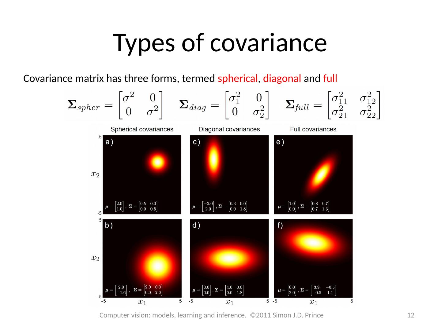 12 .Types of covariance Covariance matrix has three forms, termed spherical , diagonal and full 12 Computer vision: models, learning and inference. ©2011 Simon J.D. Prince