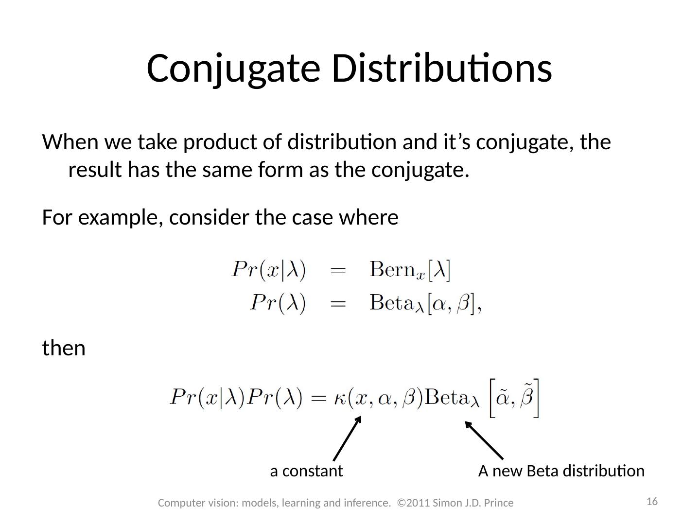 16 .Conjugate Distributions When we take product of distribution and it’s conjugate, the result has the same form as the conjugate. For example, consider the case where then a constant A new Beta distribution 16 Computer vision: models, learning and inference. ©2011 Simon J.D. Prince
