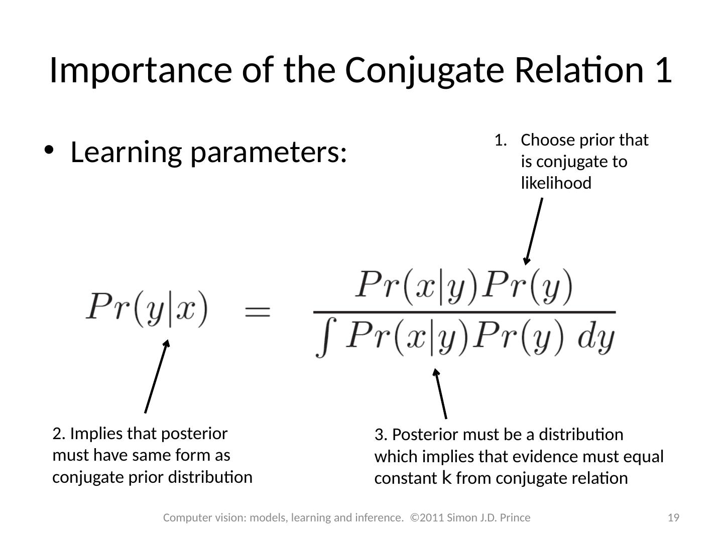 19 .Importance of the Conjugate Relation 1 Learning parameters: Choose prior that is conjugate to likelihood 2 . Implies that posterior must have same form as conjugate prior distribution 3. Posterior must be a distribution which implies that evidence must equal constant k from conjugate relation 19 Computer vision: models, learning and inference. ©2011 Simon J.D. Prince