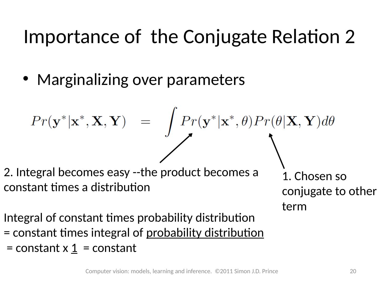 20 .Importance of the Conjugate Relation 2 Marginalizing over parameters 1. Chosen so conjugate to other term 2 . Integral becomes easy --the product becomes a constant times a distribution Integral of constant times probability distribution = constant times integral of probability distribution = constant x 1 = constant 20 Computer vision: models, learning and inference. ©2011 Simon J.D. Prince