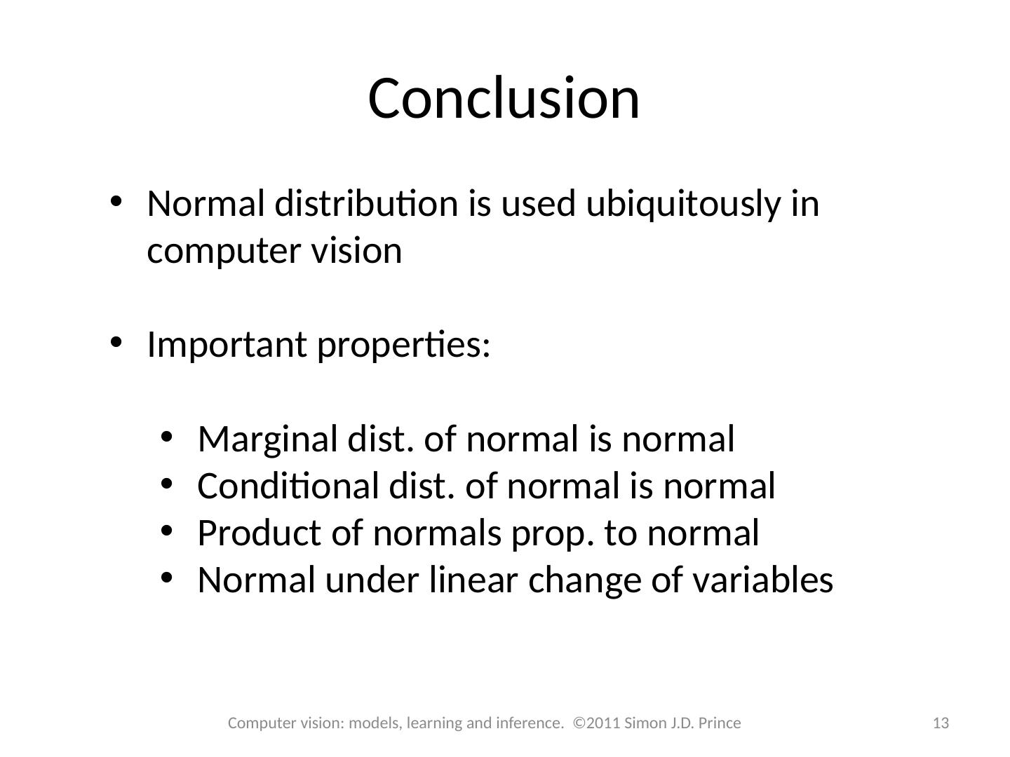 13 .Conclusion 13 Computer vision: models, learning and inference. ©2011 Simon J.D. Prince Normal distribution is used ubiquitously in computer vision Important properties: Marginal dist. of normal is normal Conditional dist. of normal is normal Product of normals prop. to normal Normal under linear change of variables