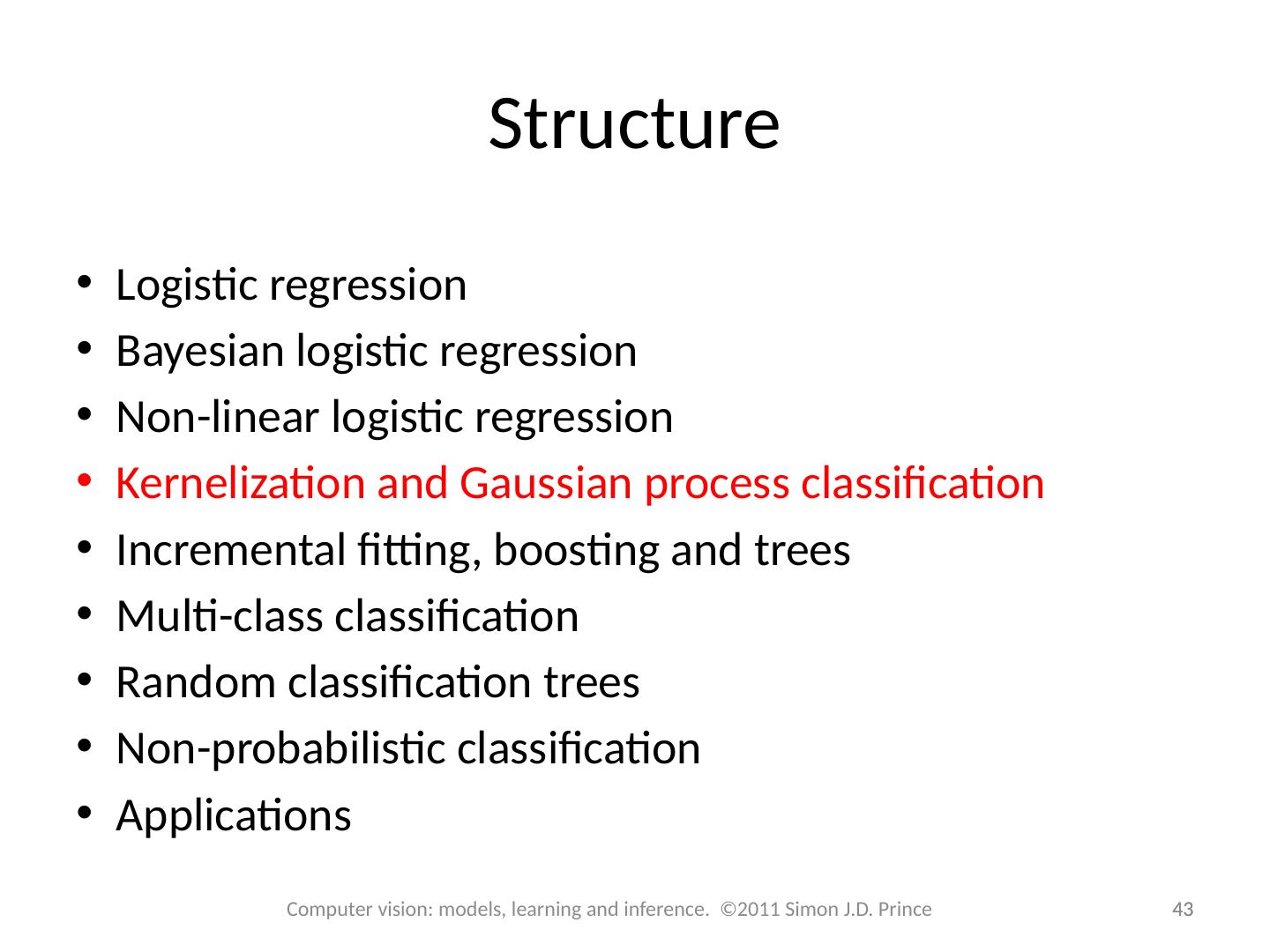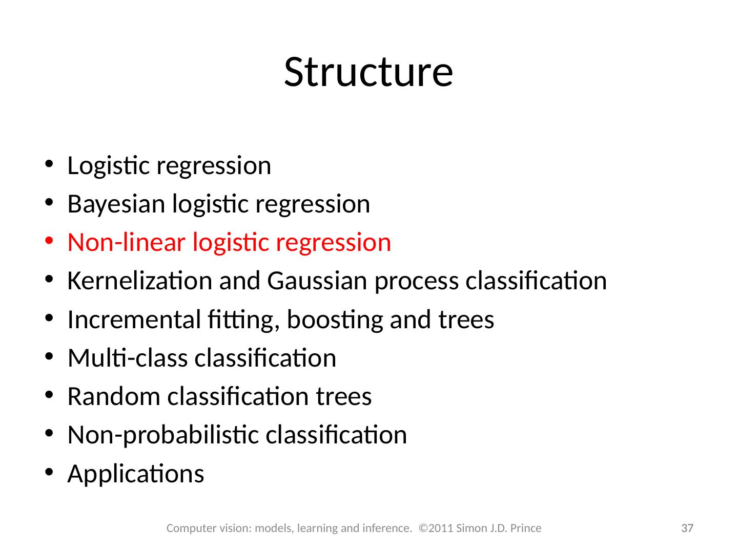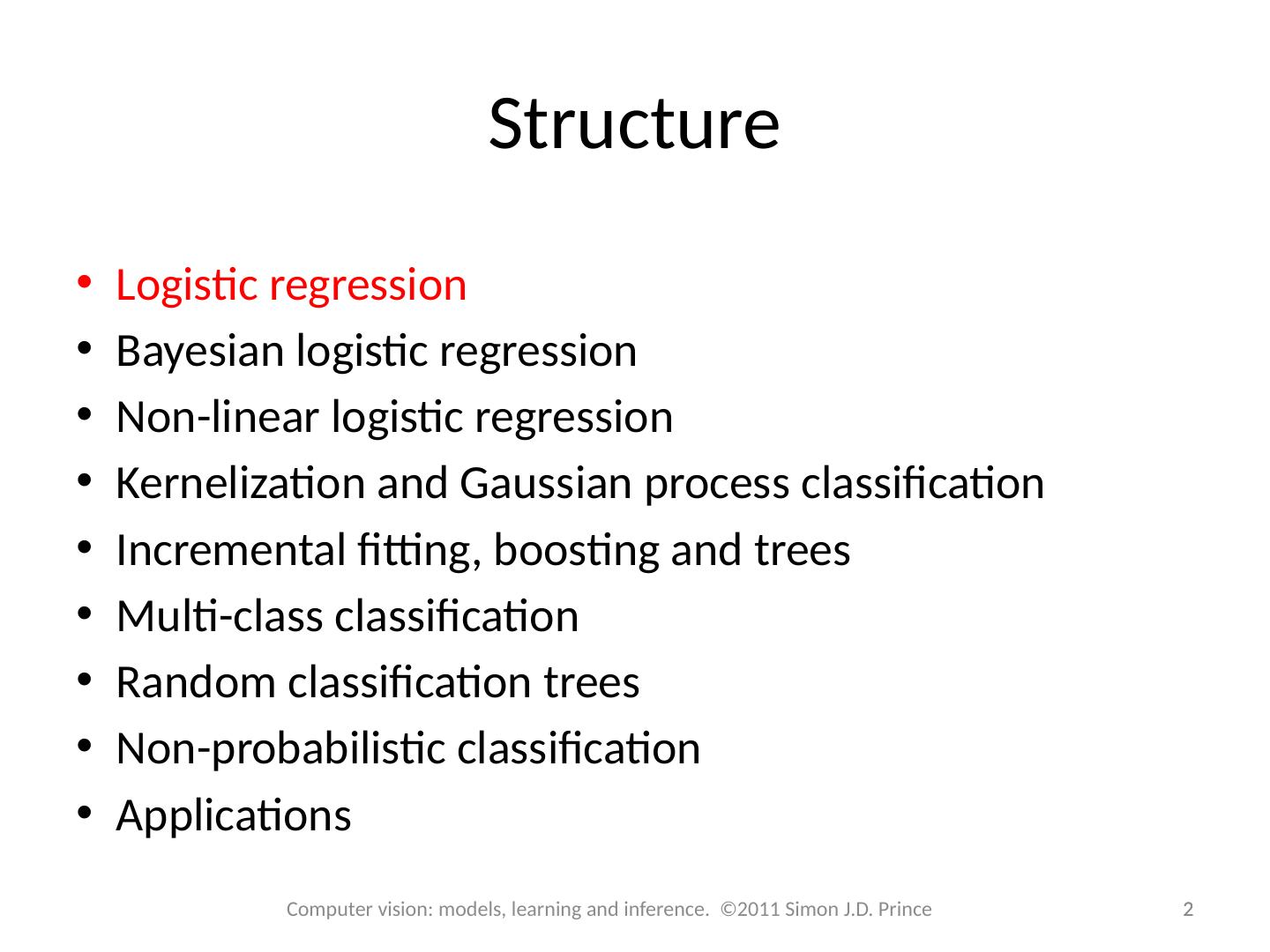 2 .Structure 2 2 Computer vision: models, learning and inference. ©2011 Simon J.D. Prince Logistic regression Bayesian logistic regression Non-linear logistic regression Kernelization and Gaussian process classification Incremental fitting, boosting and trees Multi-class classification Random classification trees Non-probabilistic classification Applications