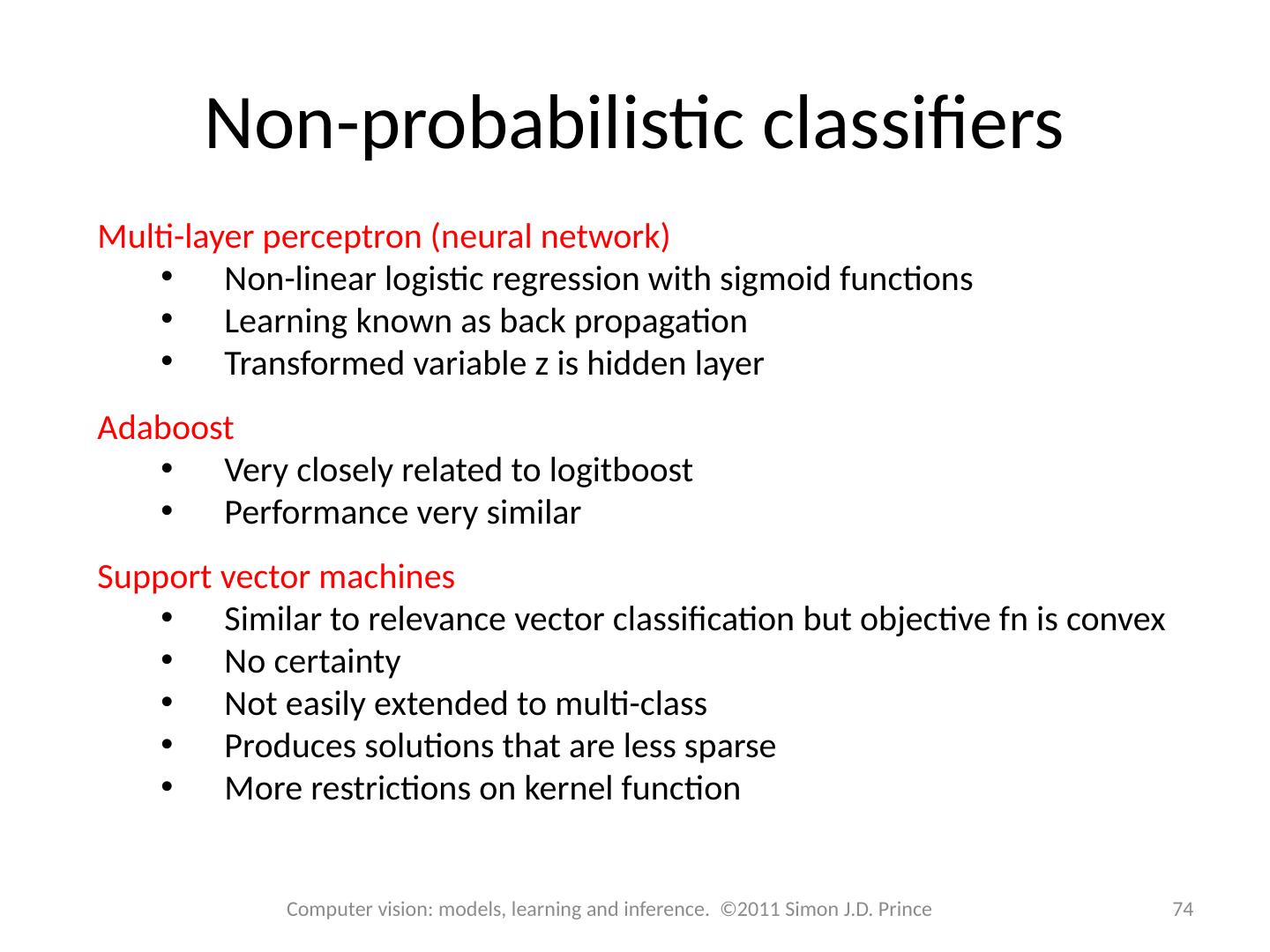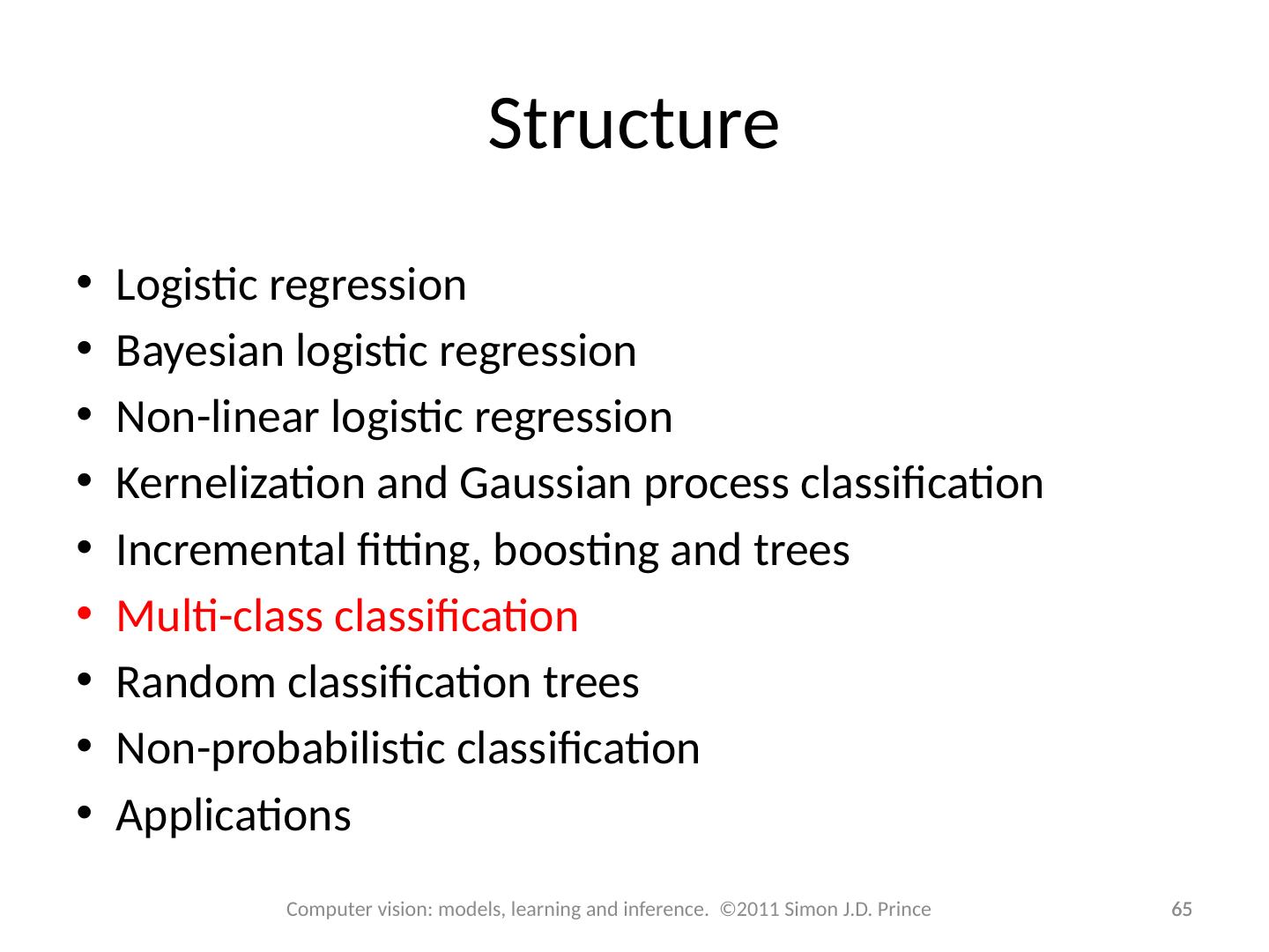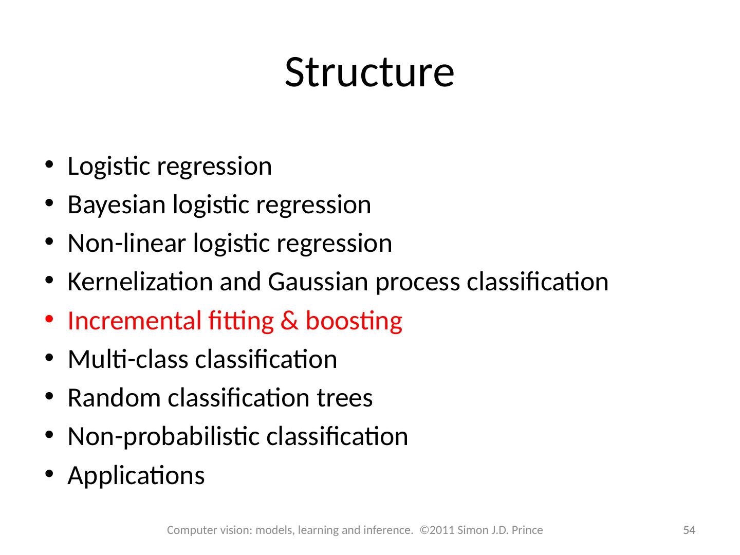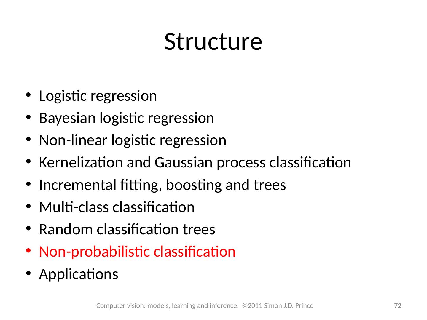 2 .Structure 2 2 Computer vision: models, learning and inference. ©2011 Simon J.D. Prince Logistic regression Bayesian logistic regression Non-linear logistic regression Kernelization and Gaussian process classification Incremental fitting, boosting and trees Multi-class classification Random classification trees Non-probabilistic classification Applications