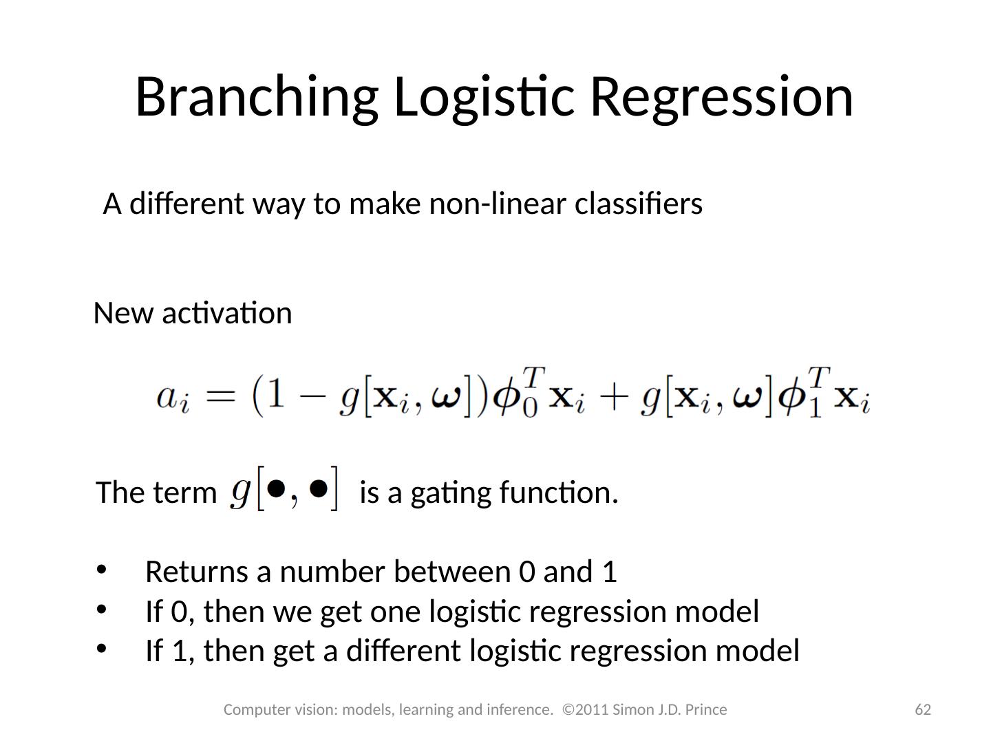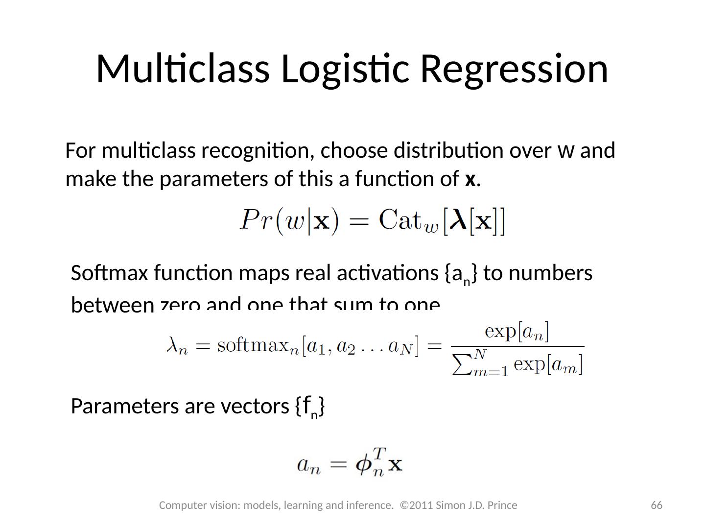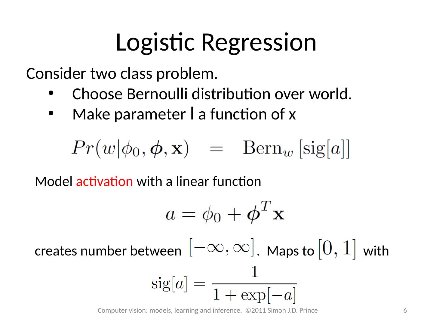 6 .Logistic Regression Consider two class problem. Choose Bernoulli distribution over world. Make parameter l a function of x Model activation with a linear function creates number between . Maps to with 6 Computer vision: models, learning and inference. ©2011 Simon J.D. Prince