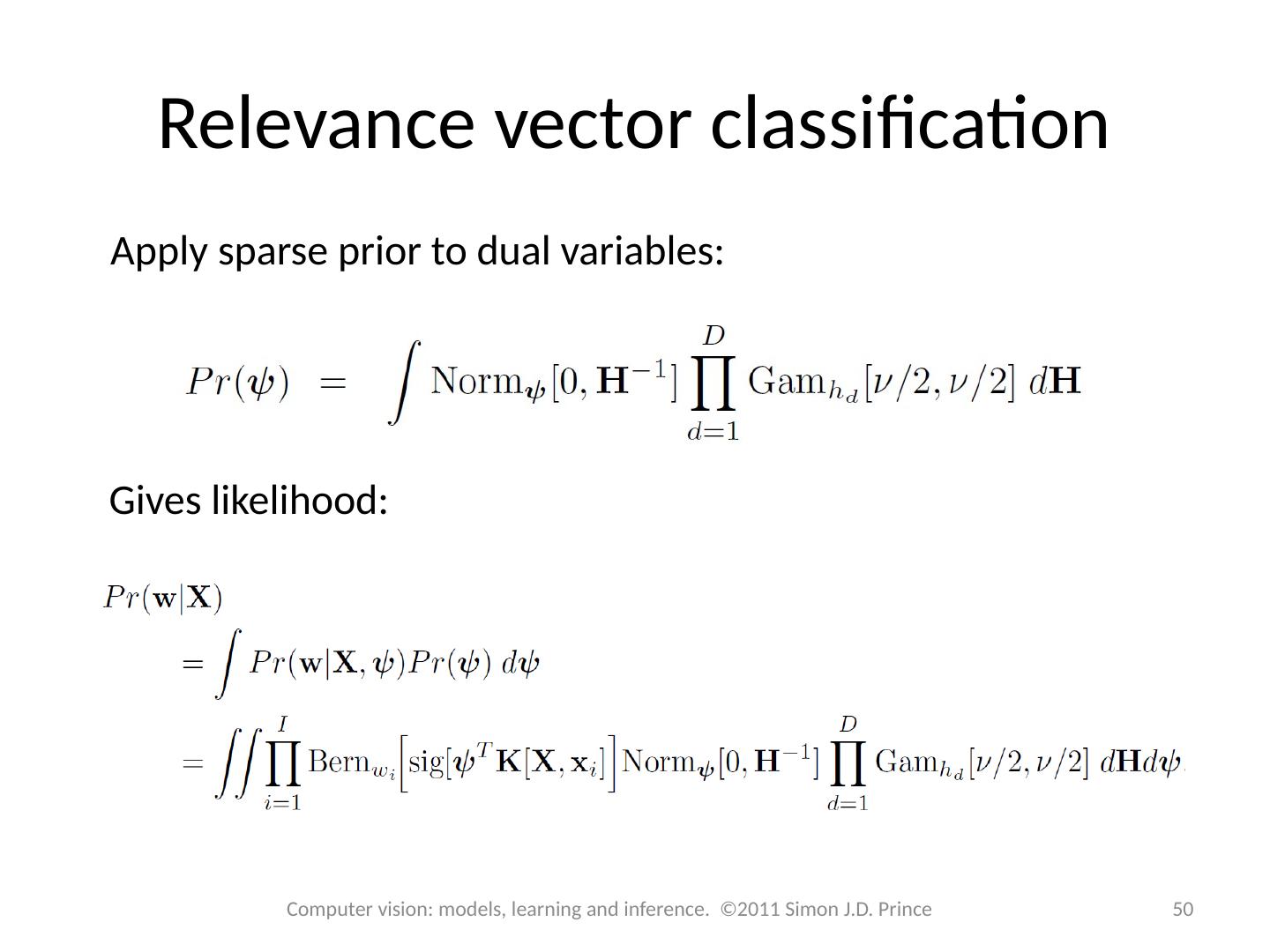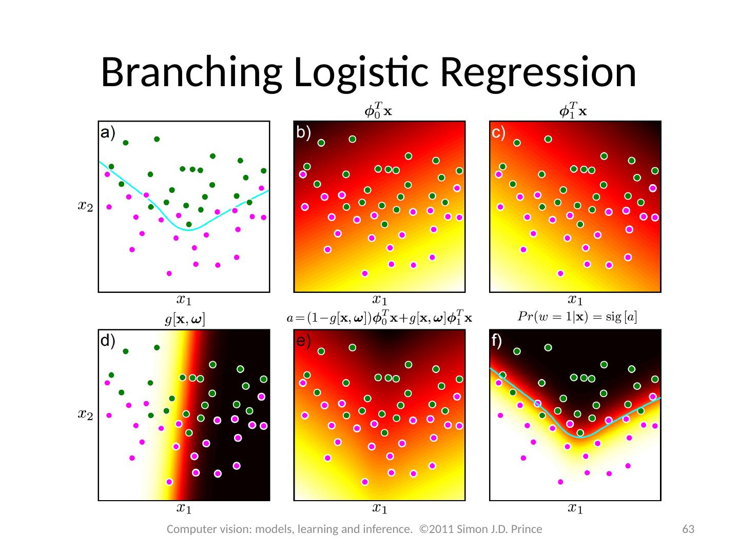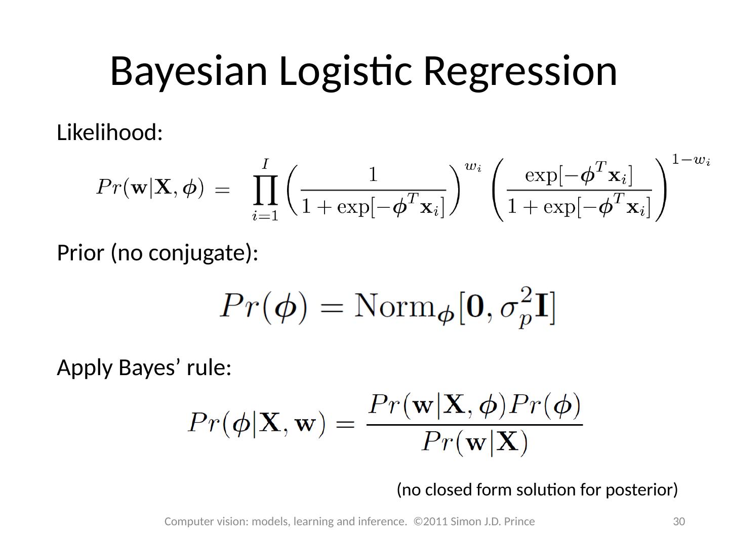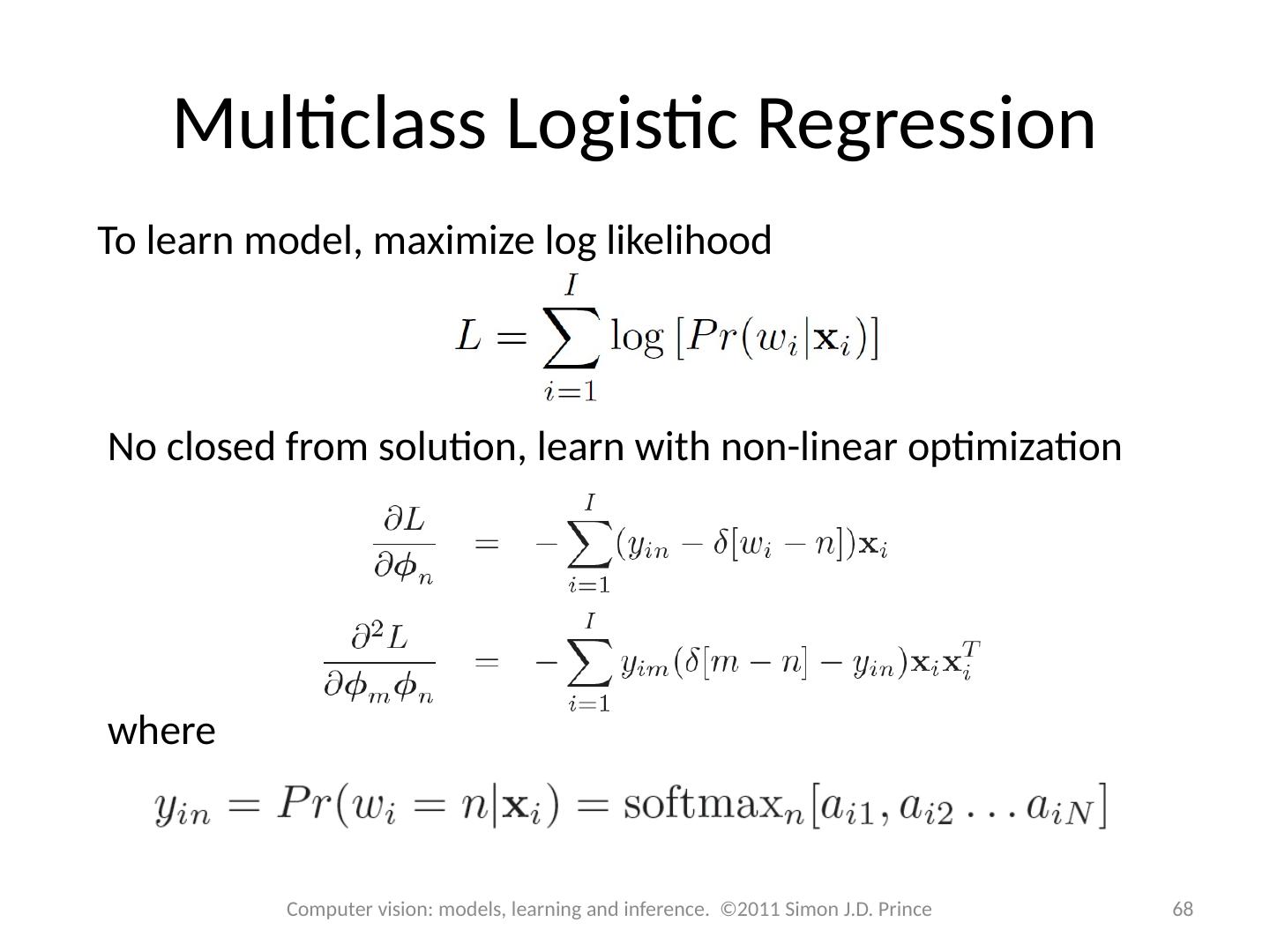 6 .Logistic Regression Consider two class problem. Choose Bernoulli distribution over world. Make parameter l a function of x Model activation with a linear function creates number between . Maps to with 6 Computer vision: models, learning and inference. ©2011 Simon J.D. Prince
