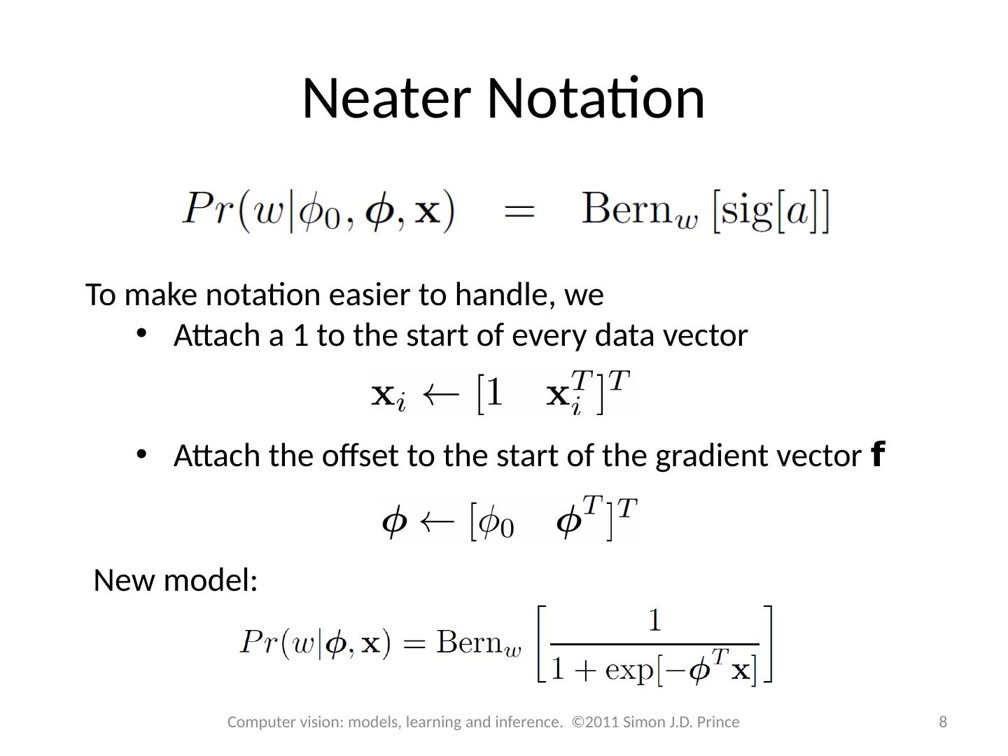 8 .Neater Notation To make notation easier to handle, we Attach a 1 to the start of every data vector Attach the offset to the start of the gradient vector f New model: 8 Computer vision: models, learning and inference. ©2011 Simon J.D. Prince