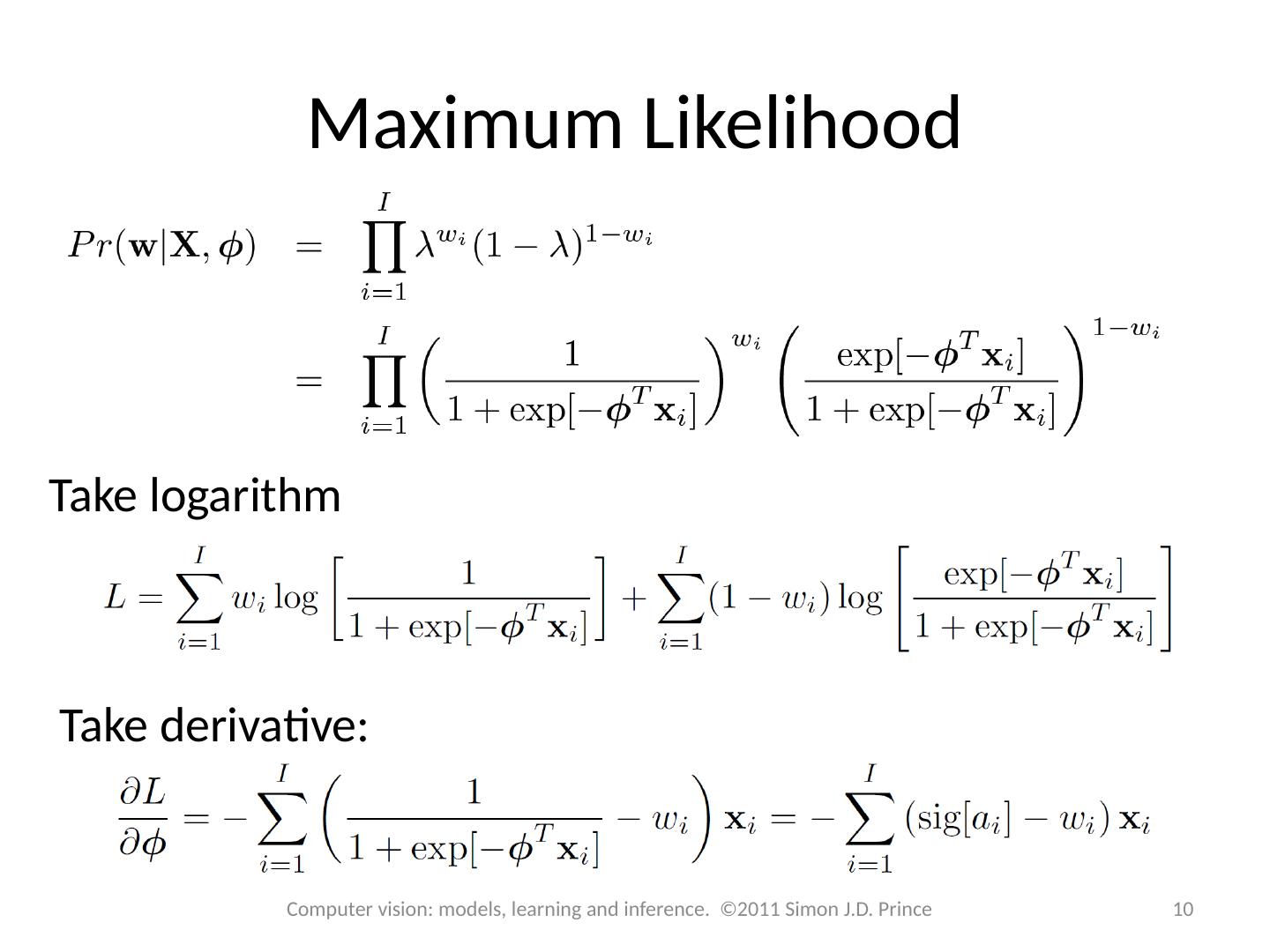 10 .Maximum Likelihood 10 Computer vision: models, learning and inference. ©2011 Simon J.D. Prince Take logarithm Take derivative: