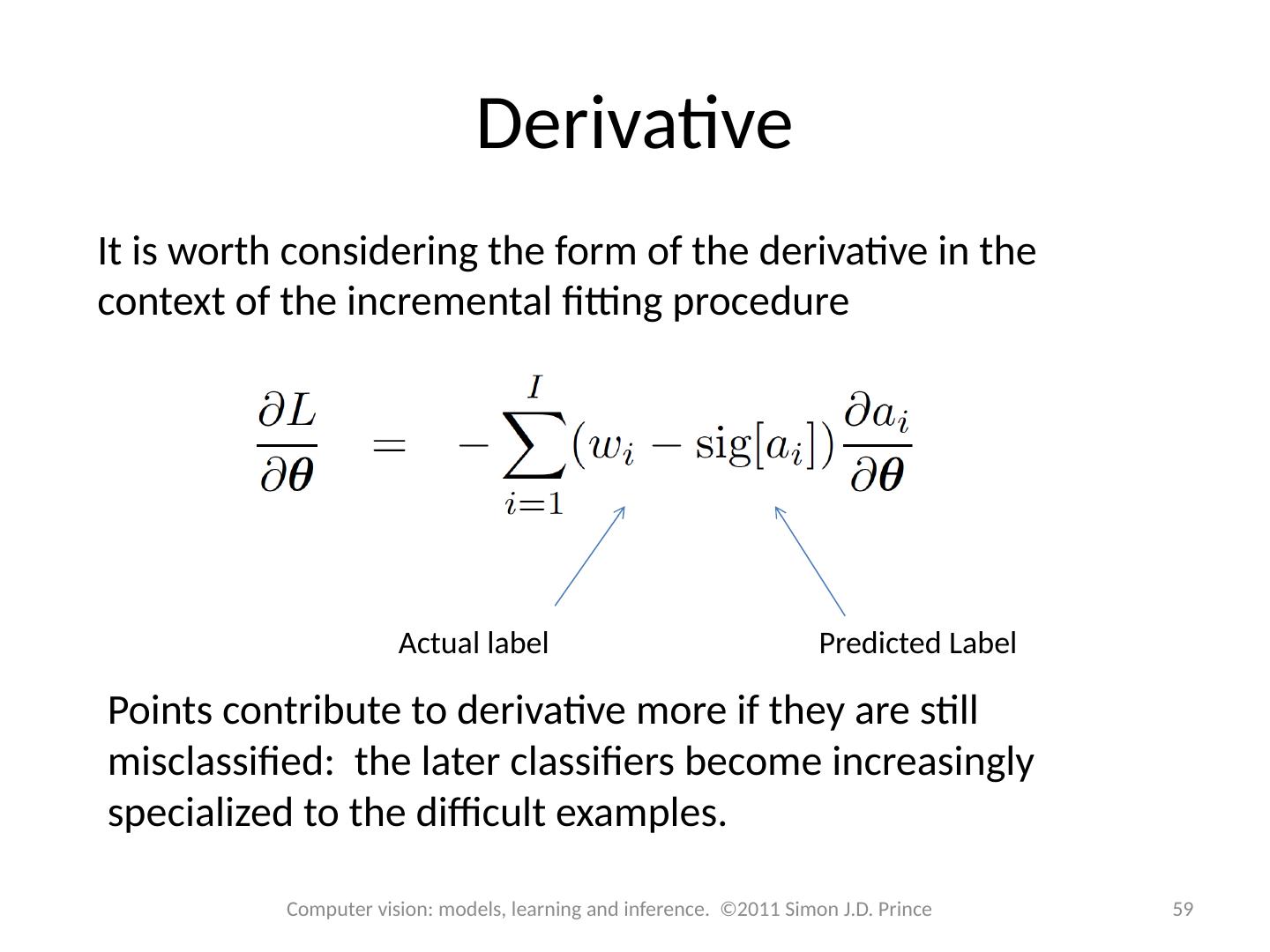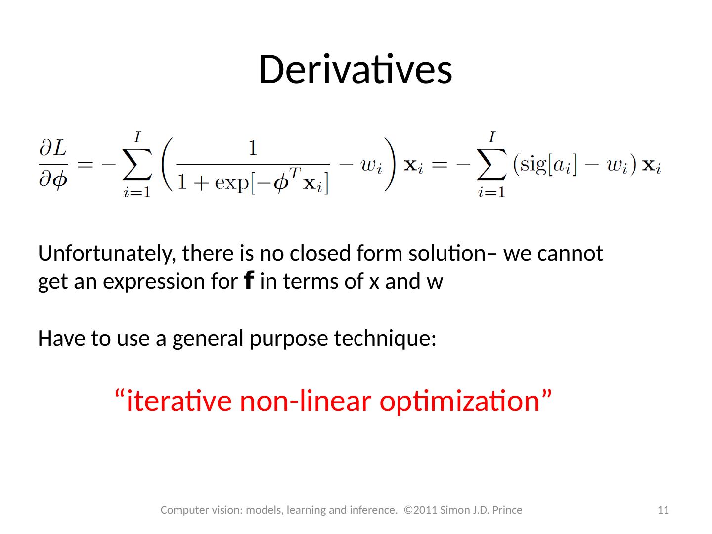 11 .Derivatives Unfortunately, there is no closed form solution– we cannot get an expression for f in terms of x and w Have to use a general purpose technique: “iterative non-linear optimization” 11 Computer vision: models, learning and inference. ©2011 Simon J.D. Prince