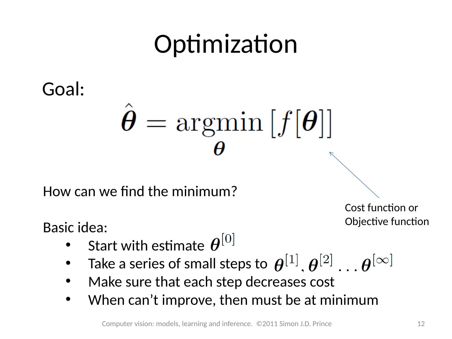 12 .Optimization Goal: How can we find the minimum? Basic idea: Start with estimate Take a series of small steps to Make sure that each step decreases cost When can’t improve, then must be at minimum Cost function or Objective function 12 Computer vision: models, learning and inference. ©2011 Simon J.D. Prince