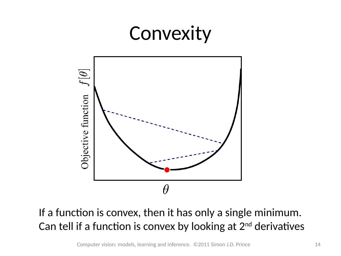 14 .Convexity If a function is convex, then it has only a single minimum. Can tell if a function is convex by looking at 2 nd derivatives 14 Computer vision: models, learning and inference. ©2011 Simon J.D. Prince