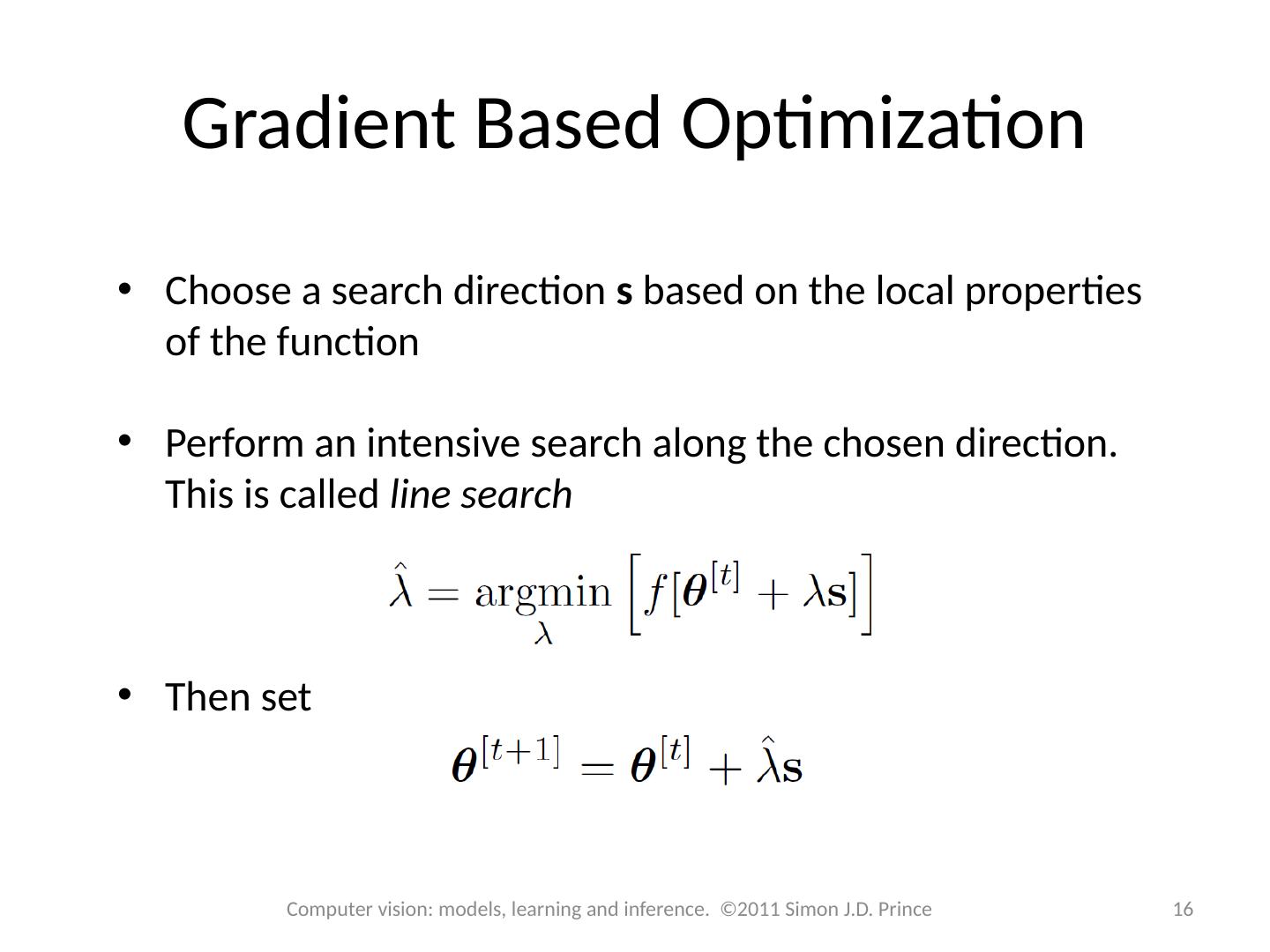 16 .Gradient Based Optimization Choose a search direction s based on the local properties of the function Perform an intensive search along the chosen direction. This is called line search Then set 16 Computer vision: models, learning and inference. ©2011 Simon J.D. Prince