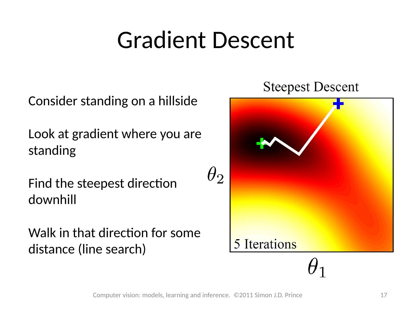 17 .Gradient Descent Consider standing on a hillside Look at gradient where you are standing Find the steepest direction downhill Walk in that direction for some distance (line search) 17 Computer vision: models, learning and inference. ©2011 Simon J.D. Prince