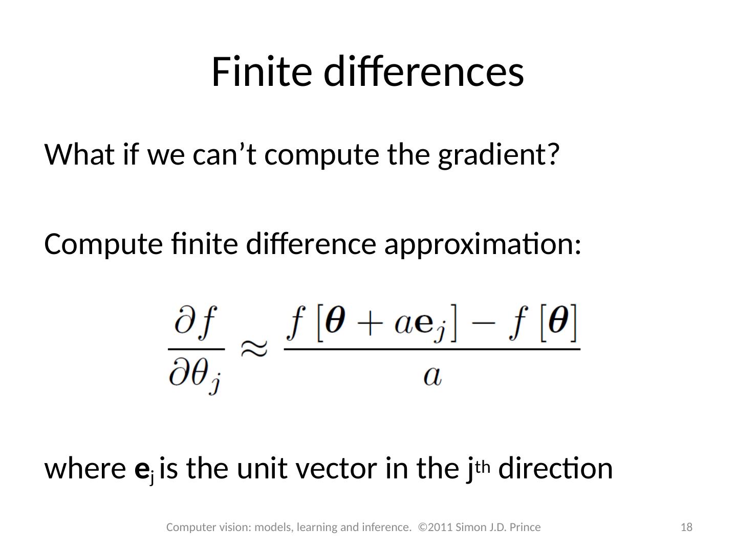 18 .Finite differences What if we can’t compute the gradient? Compute finite difference approximation: where e j is the unit vector in the j th direction 18 Computer vision: models, learning and inference. ©2011 Simon J.D. Prince