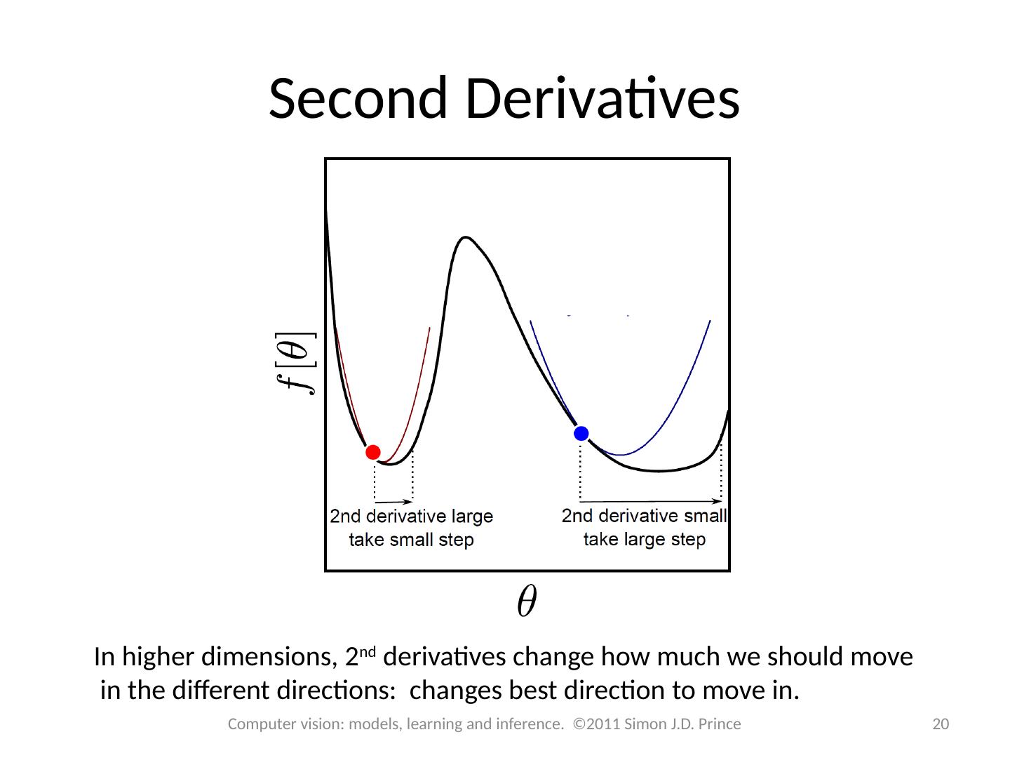 20 .Second Derivatives In higher dimensions, 2 nd derivatives change how much we should move in the different directions: changes best direction to move in. 20 Computer vision: models, learning and inference. ©2011 Simon J.D. Prince